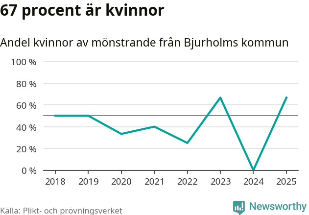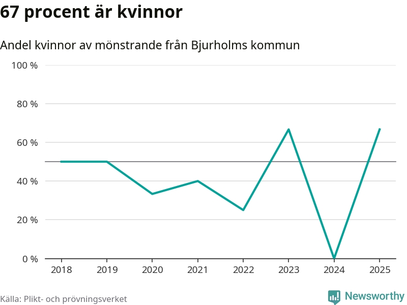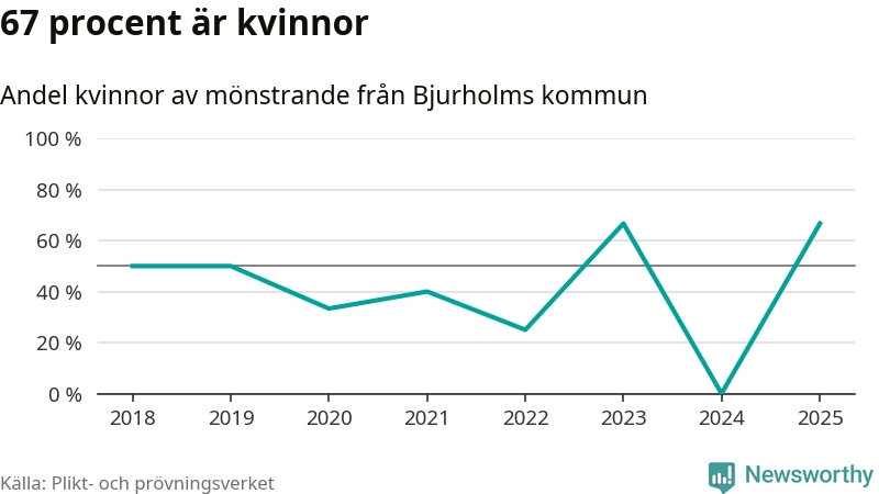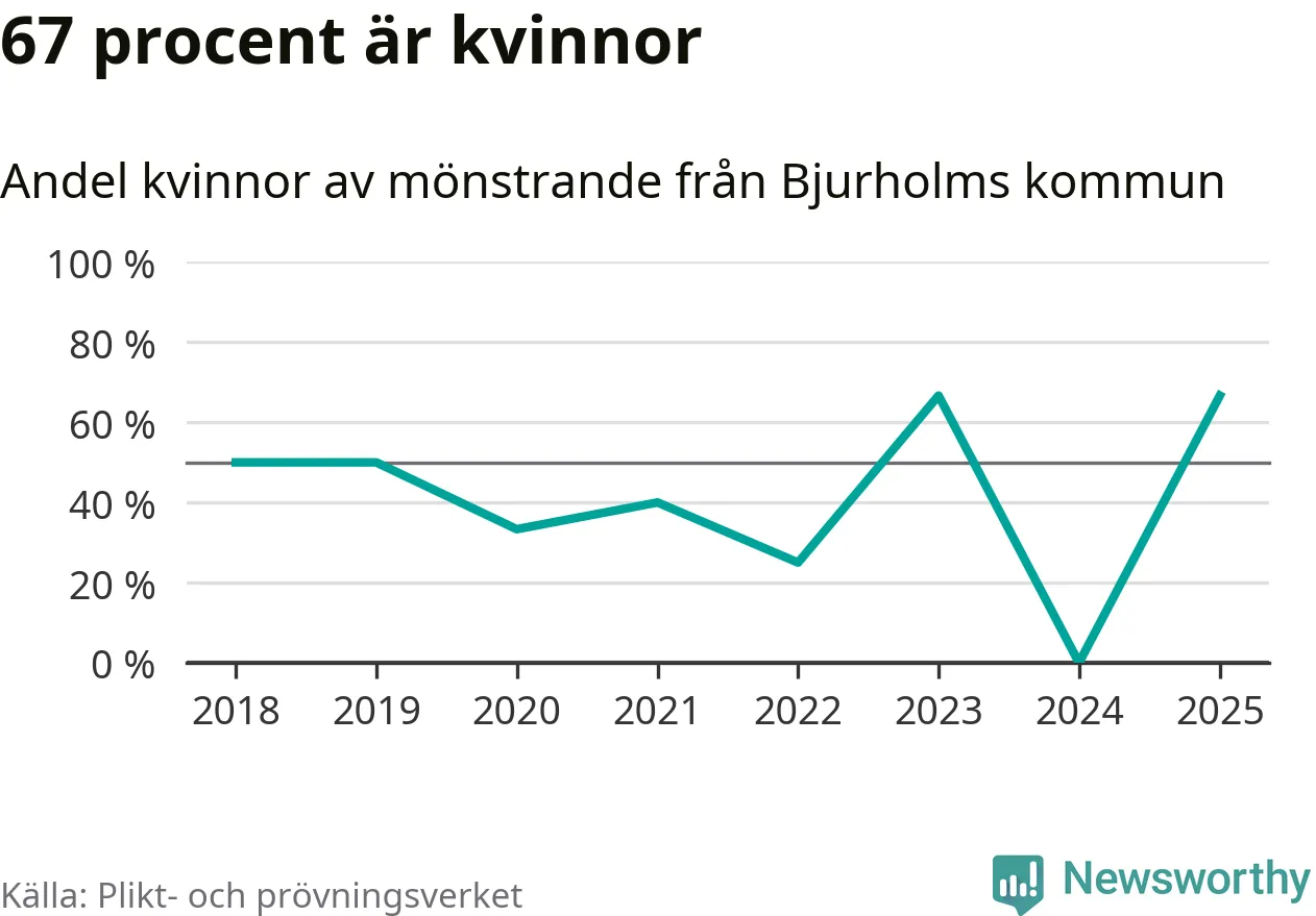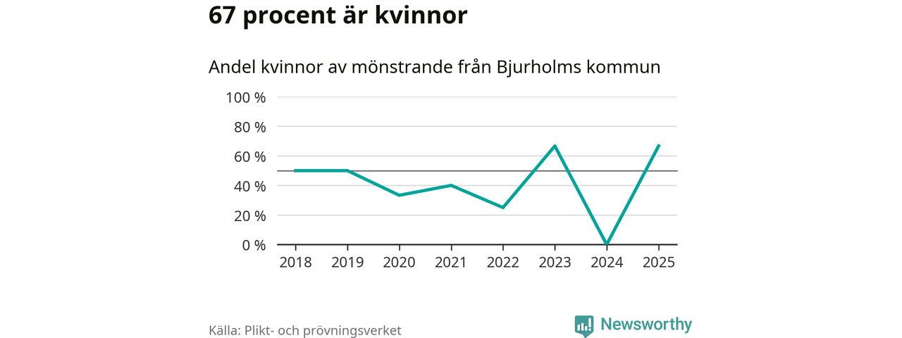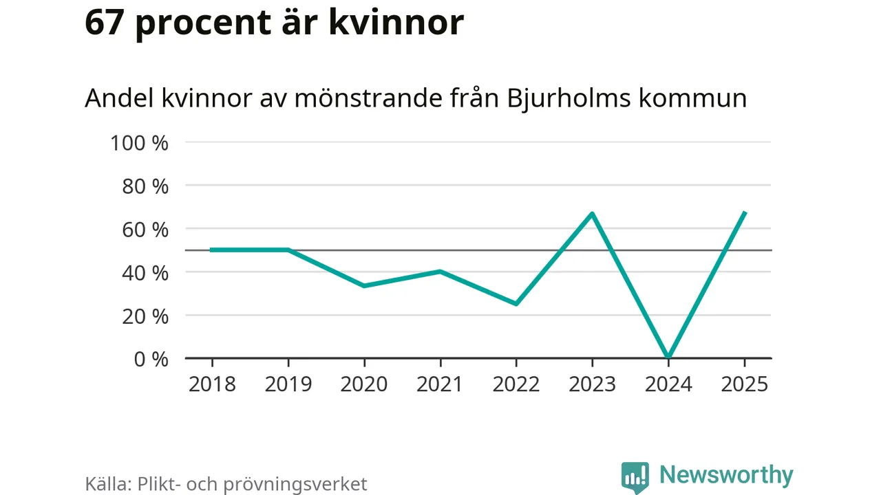 Två av de som kallats till mönstring från Bjurholm är kvinnor, vilket motsvarar 67 procent av de mönstrande. Det är en rekordstor andel av de mönstrande, men 2023 och 2019 var det fler kvinnor från kommunen – fyra stycken – som mönstrade. I riket som helhet är 28 procent av de mönstrande tjejer.