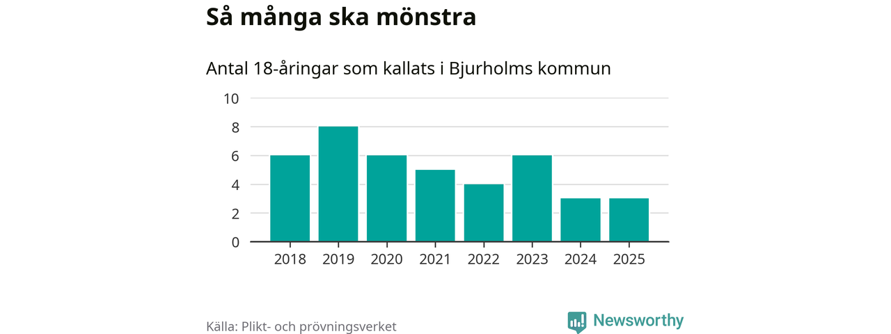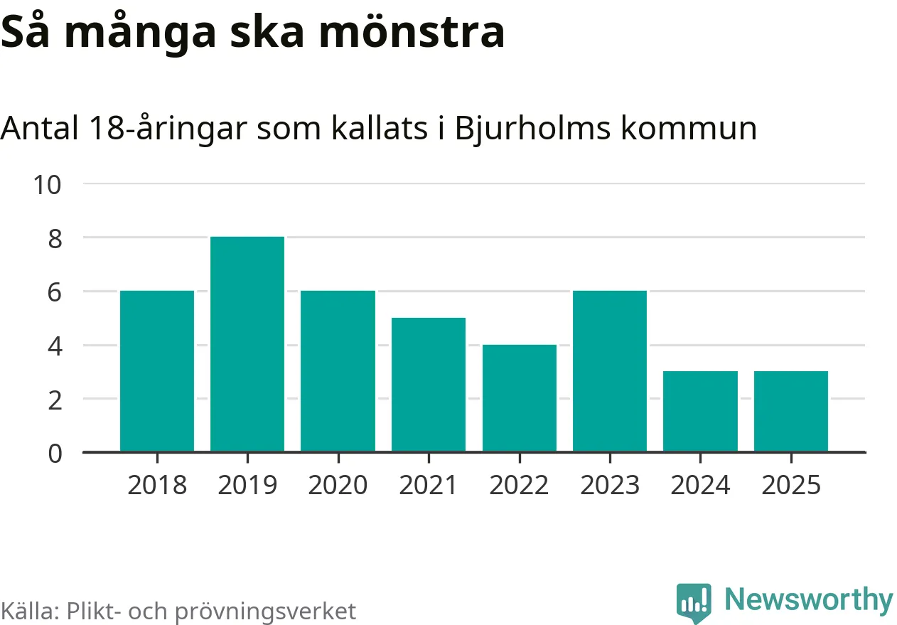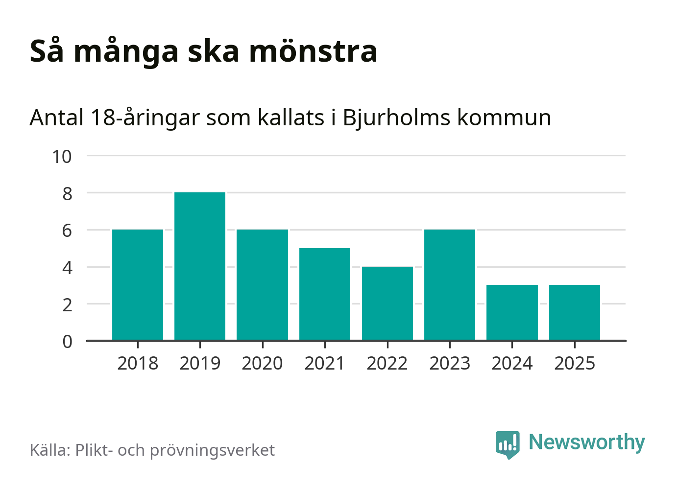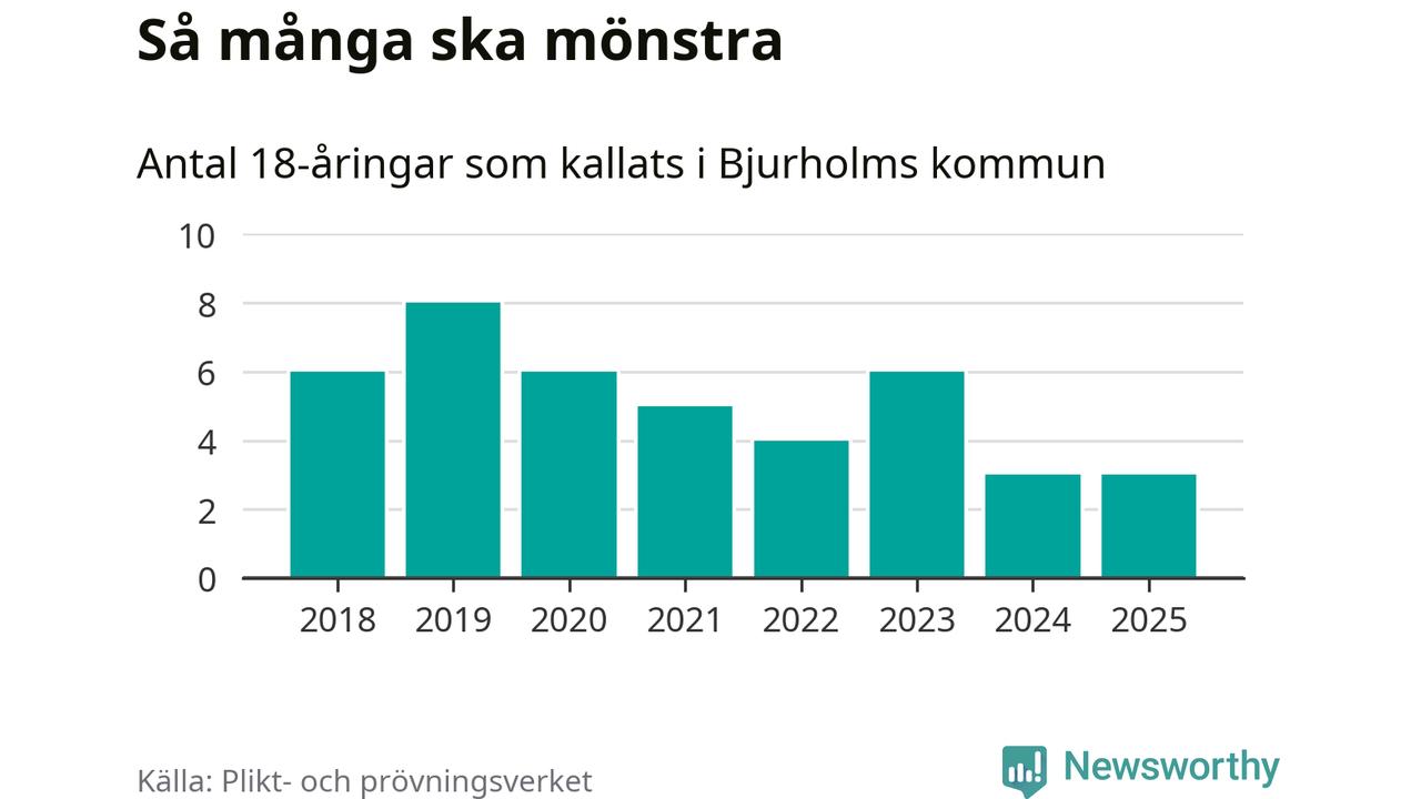 Nu kallas omkring 28 200 svenskar födda 2007 till mönstring. Och tre av dem kommer från Bjurholm, enligt ny statistik från Plikt- och prövningsverket. Det innebär att var nionde invånare i åldersgruppen i kommunen kallas till mönstring. Det är en lägre andel än i Västerbotten totalt. I riket som helhet kallas nästan var fjärde person i årskullen.