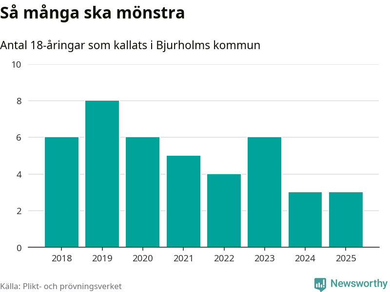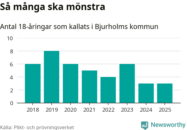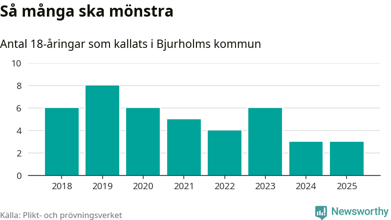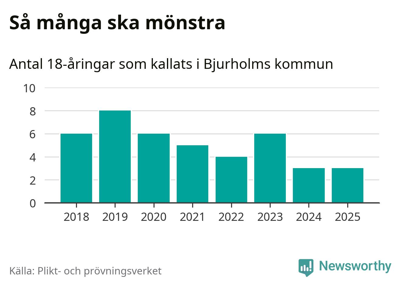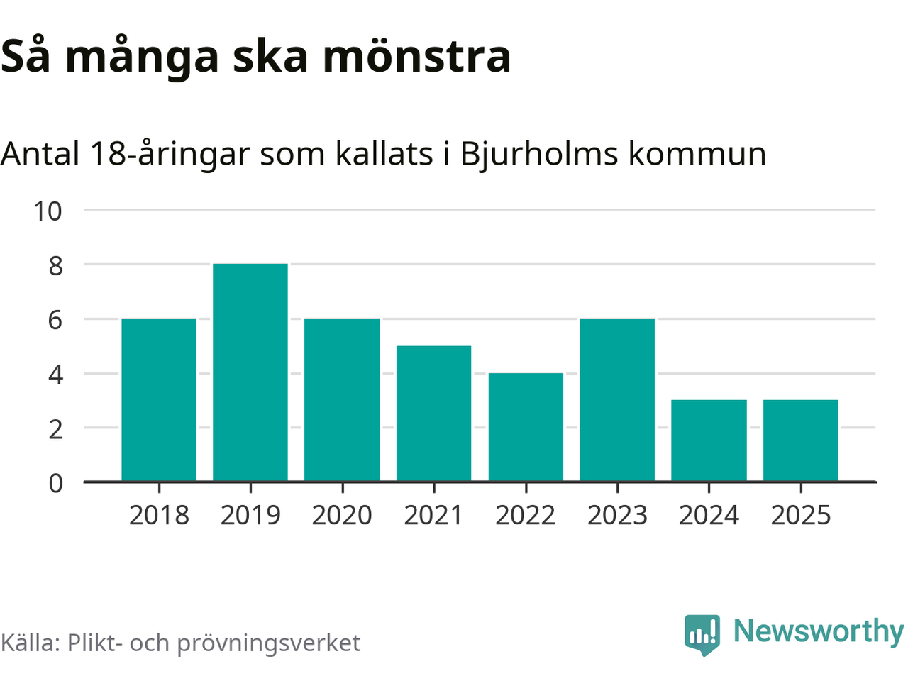 Nu kallas omkring 28 200 svenskar födda 2007 till mönstring. Och tre av dem kommer från Bjurholm, enligt ny statistik från Plikt- och prövningsverket. Det innebär att var nionde invånare i åldersgruppen i kommunen kallas till mönstring. Det är en lägre andel än i Västerbotten totalt. I riket som helhet kallas nästan var fjärde person i årskullen.