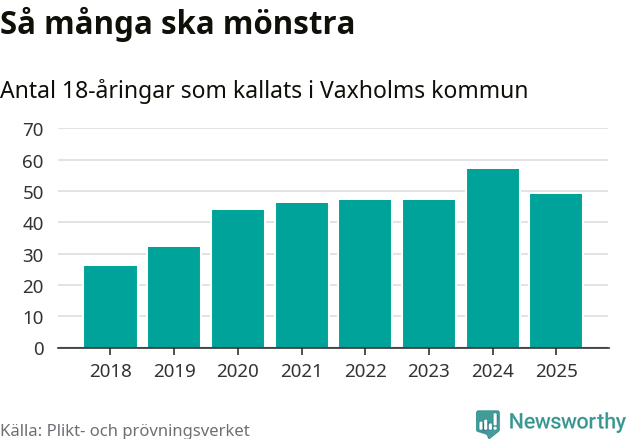 Nu kallas omkring 28 200 svenskar födda 2007 till mönstring. Och 49 av dem kommer från Vaxholm, enligt ny statistik från Plikt- och prövningsverket. Det innebär att var fjärde invånare i åldersgruppen i kommunen kallas till mönstring. Det är en högre andel än i Stockholms län totalt. I riket som helhet kallas nästan var fjärde person i årskullen.