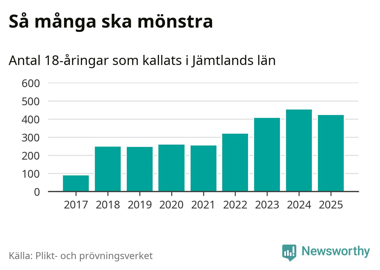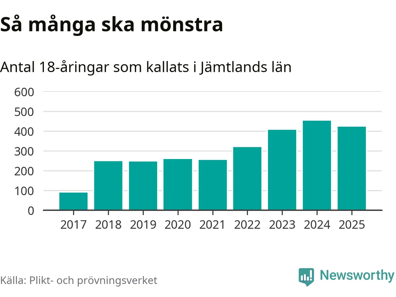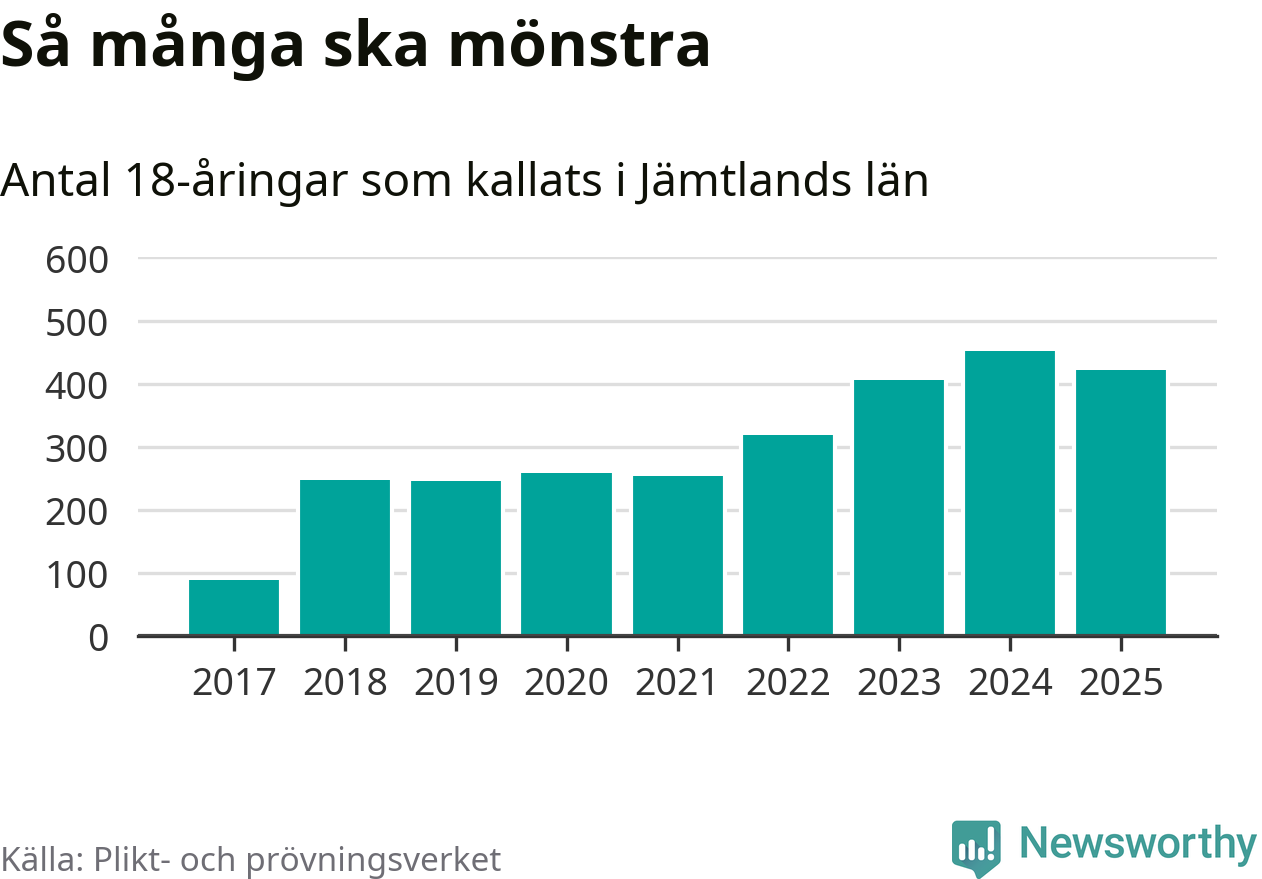 Nu kallas omkring 28 200 svenskar födda 2007 till mönstring. Och 422 av dem kommer från Jämtland, enligt ny statistik från Plikt- och prövningsverket. Det innebär att mer än var fjärde invånare i åldersgruppen i länet kallas till mönstring. I riket som helhet kallas nästan var fjärde person i årskullen.