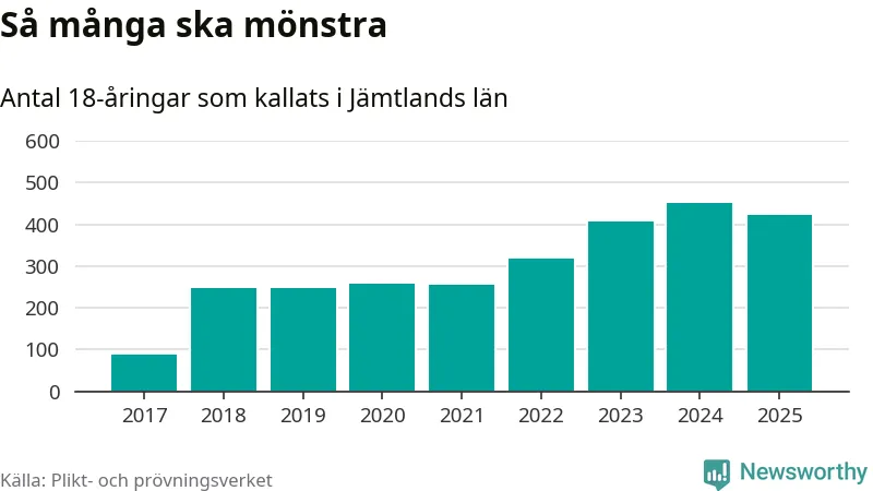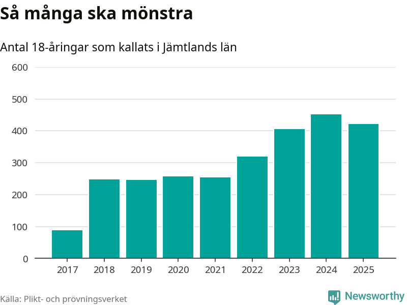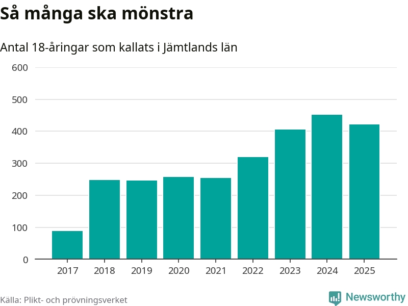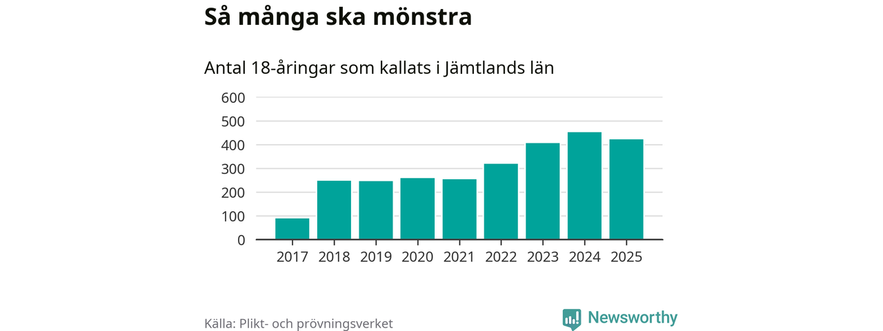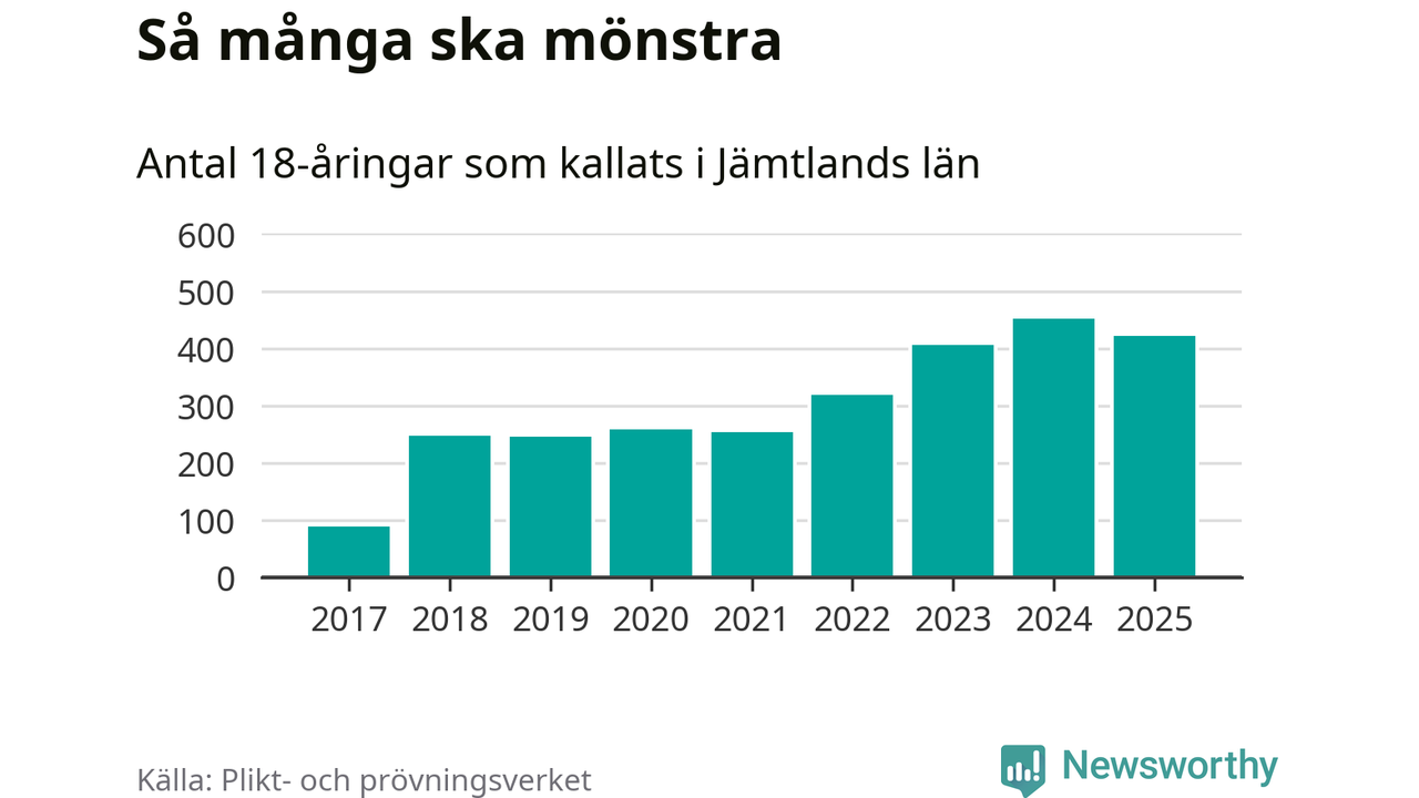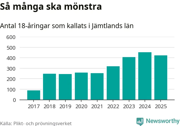 Nu kallas omkring 28 200 svenskar födda 2007 till mönstring. Och 422 av dem kommer från Jämtland, enligt ny statistik från Plikt- och prövningsverket. Det innebär att mer än var fjärde invånare i åldersgruppen i länet kallas till mönstring. I riket som helhet kallas nästan var fjärde person i årskullen.