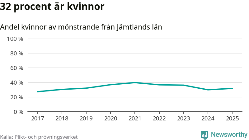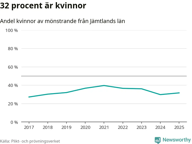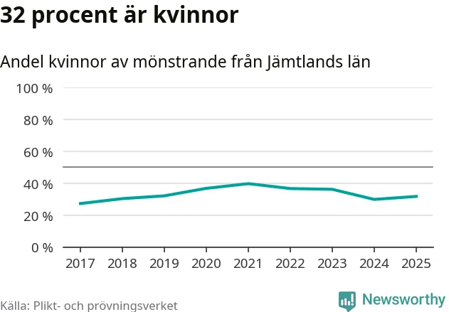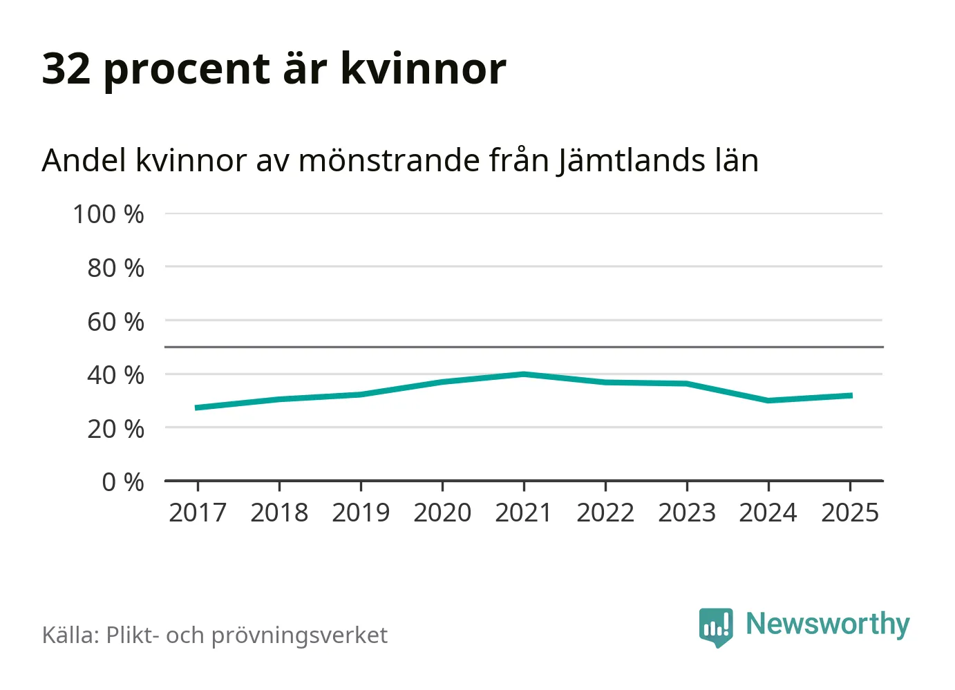 134 av de som kallats till mönstring från Jämtland är kvinnor, vilket motsvarar 32 procent av de mönstrande. Som mest har 147 kvinnor kallats från kommunen (2023). I riket som helhet är 28 procent av de mönstrande tjejer.