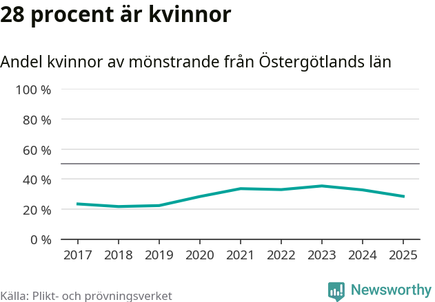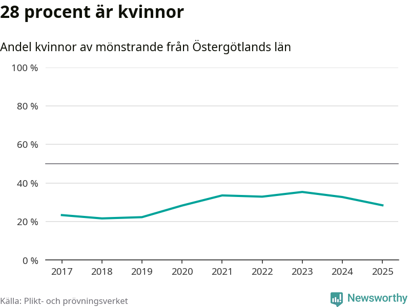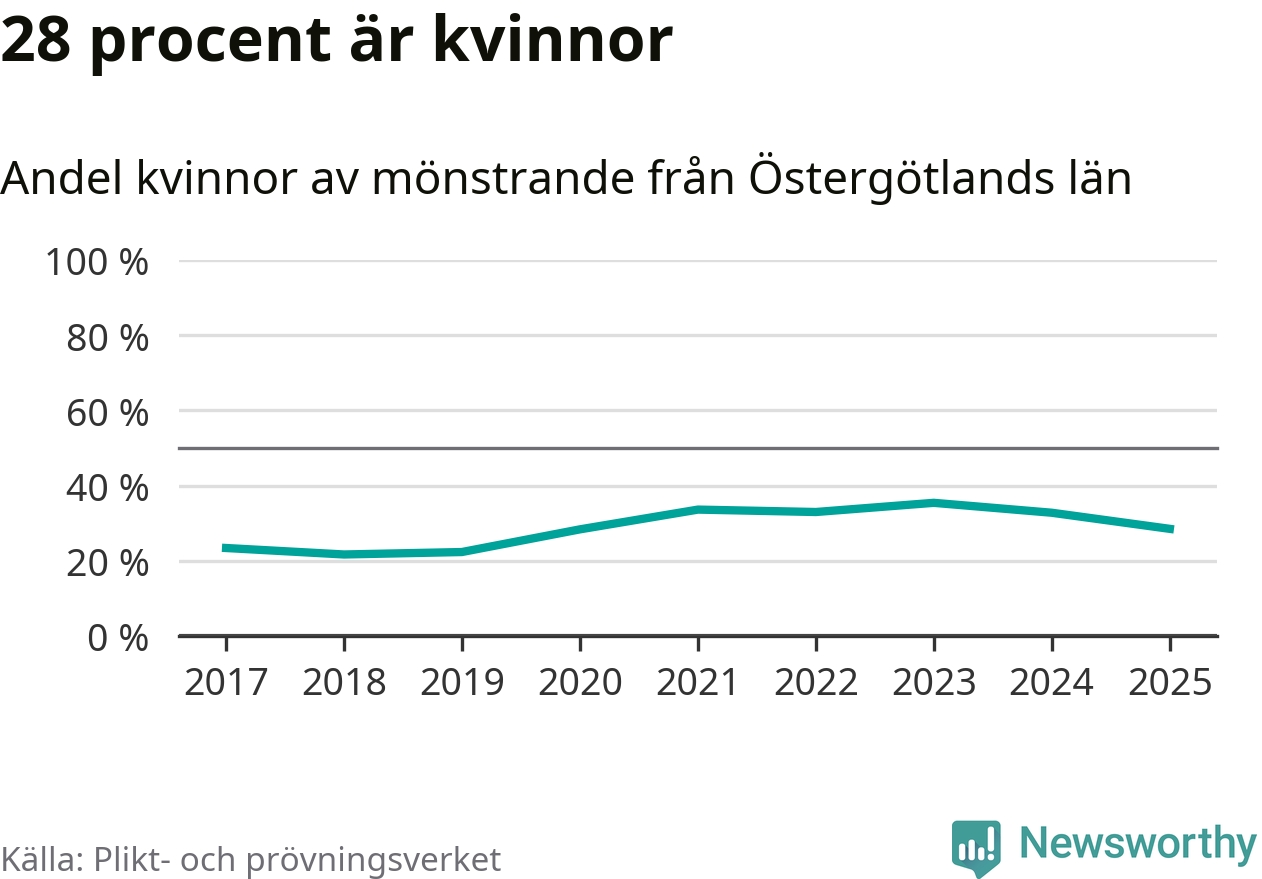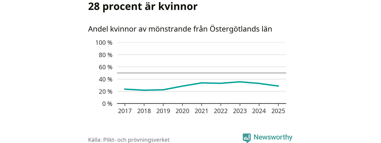 372 av de som kallats till mönstring från Östergötland är kvinnor, vilket motsvarar 28 procent av de mönstrande. Som mest har 410 kvinnor kallats från kommunen (2024). I riket som helhet är 28 procent av de mönstrande tjejer.