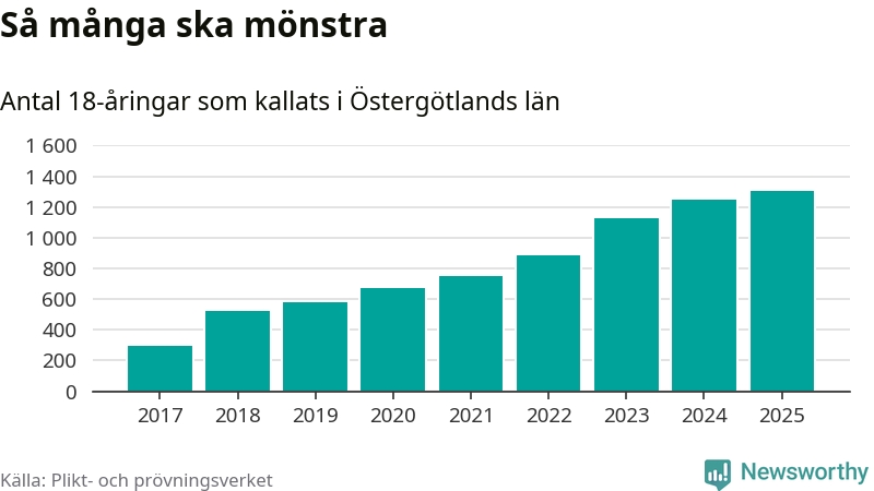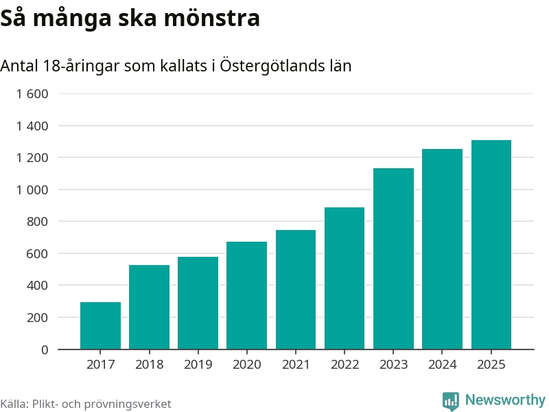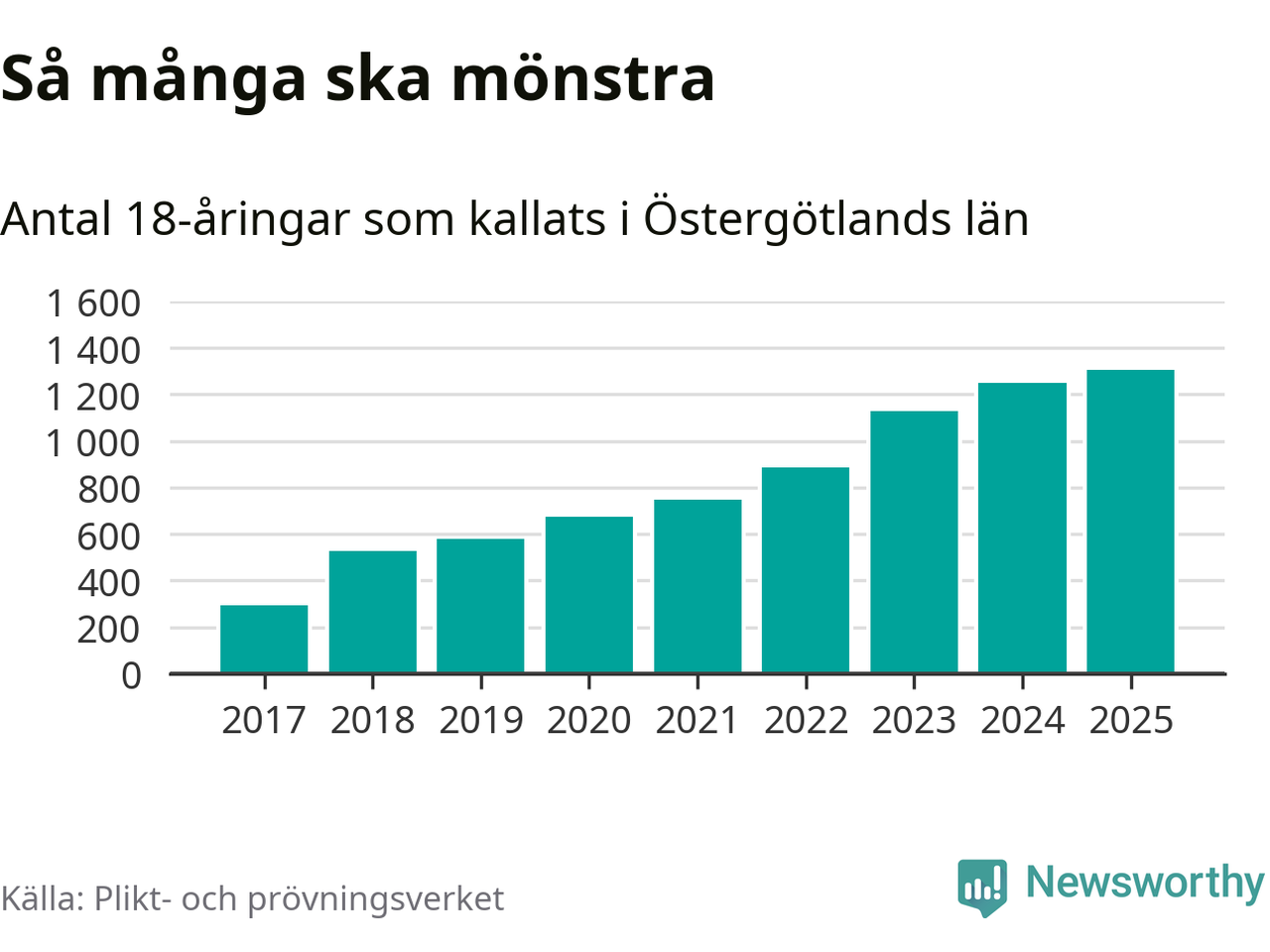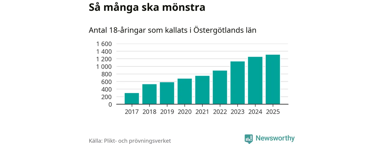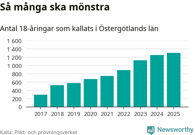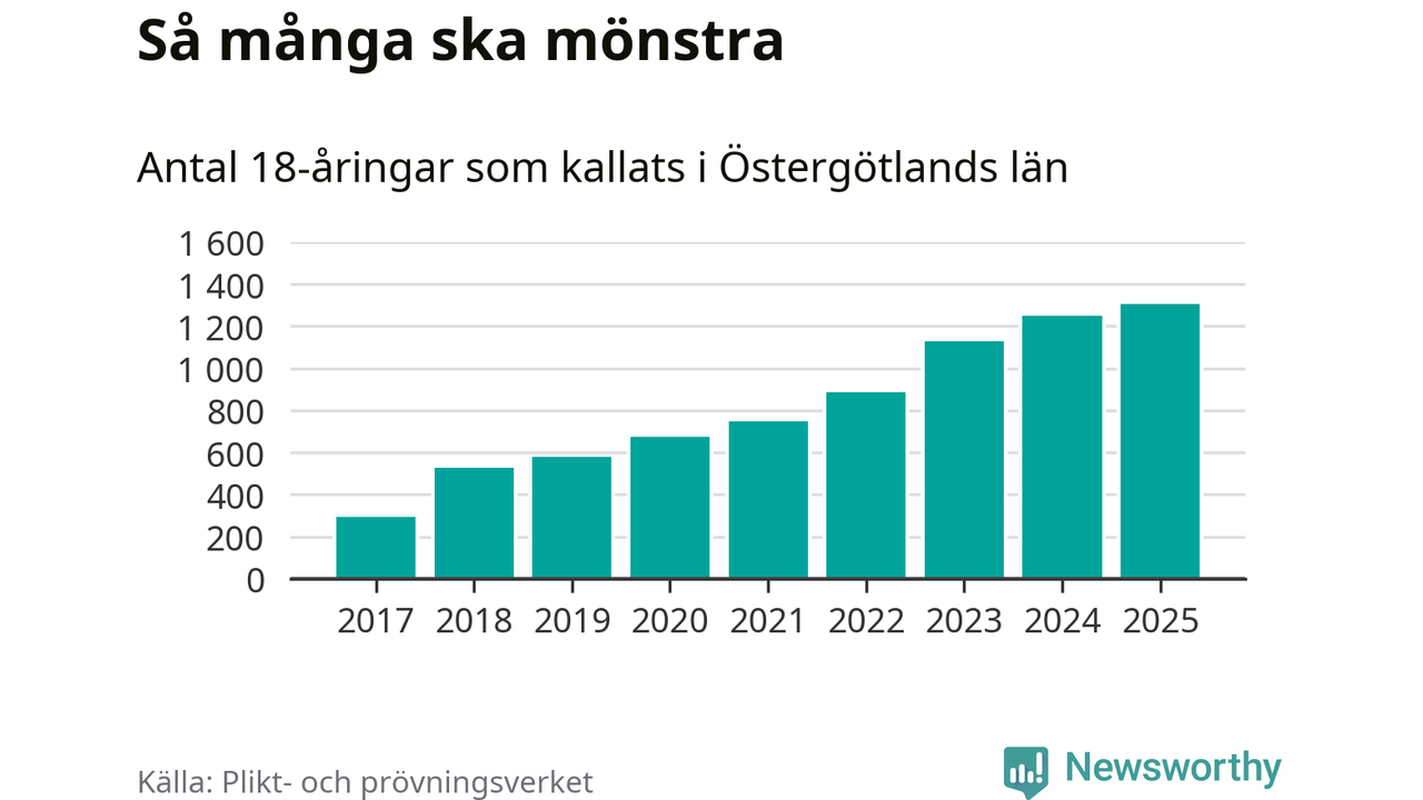 I takt med att värnplikten byggs ut ökar antalet 18-åringar som kallas till mönstring från Östergötlands län. I år kallas 1 306 personer från länet – vilket är det högsta antalet sedan värnplikten återinfördes 2017.