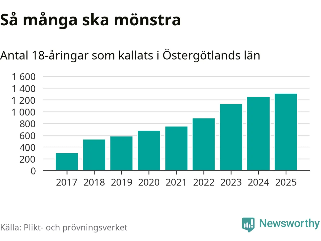 Nu kallas omkring 28 200 svenskar födda 2007 till mönstring. Och 1 306 av dem kommer från Östergötland, enligt ny statistik från Plikt- och prövningsverket. Det innebär att nästan var fjärde invånare i åldersgruppen i länet kallas till mönstring. Även i riket som helhet kallas nästan var fjärde person i årskullen.