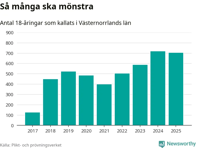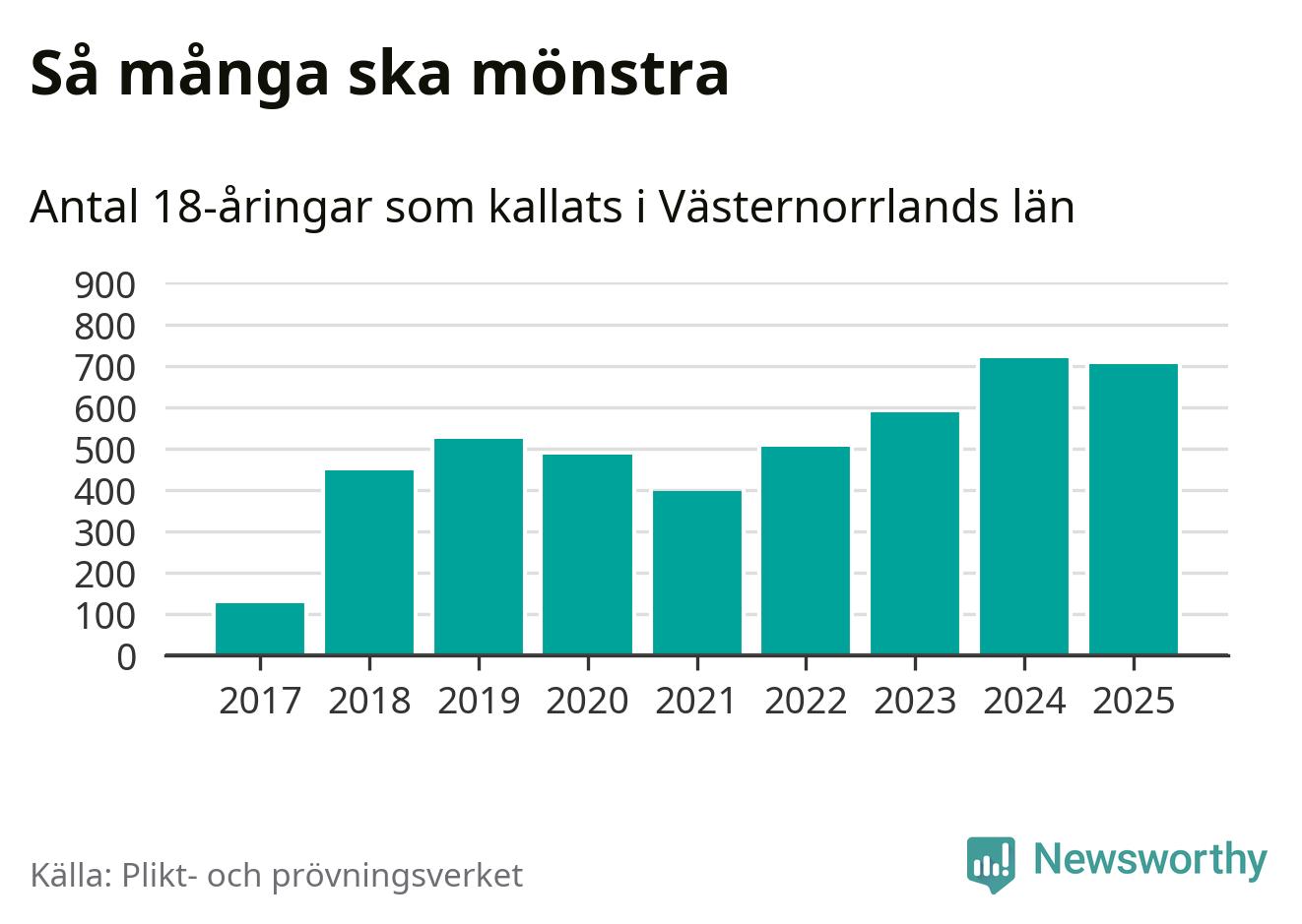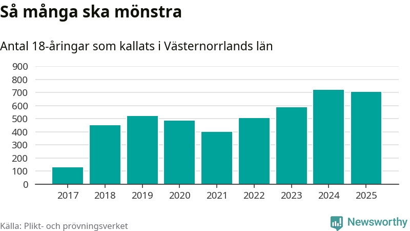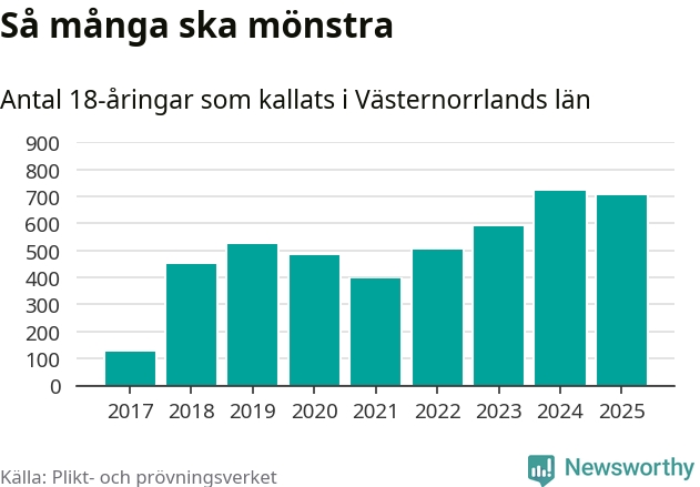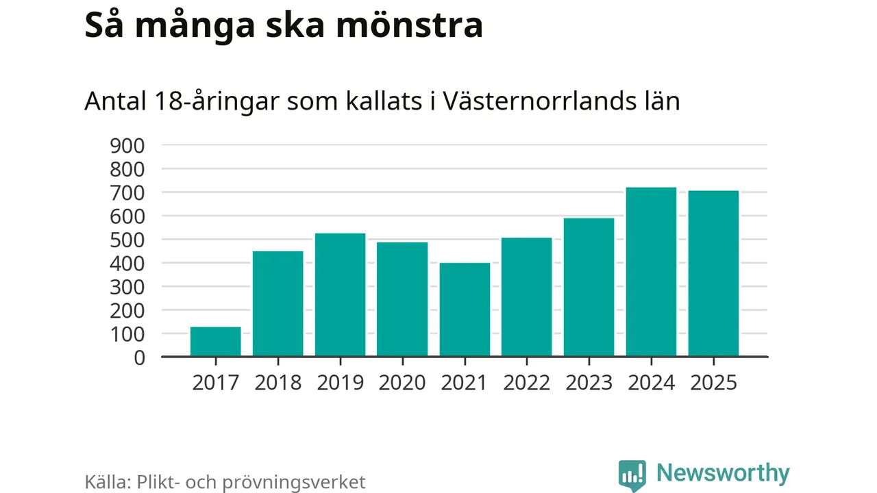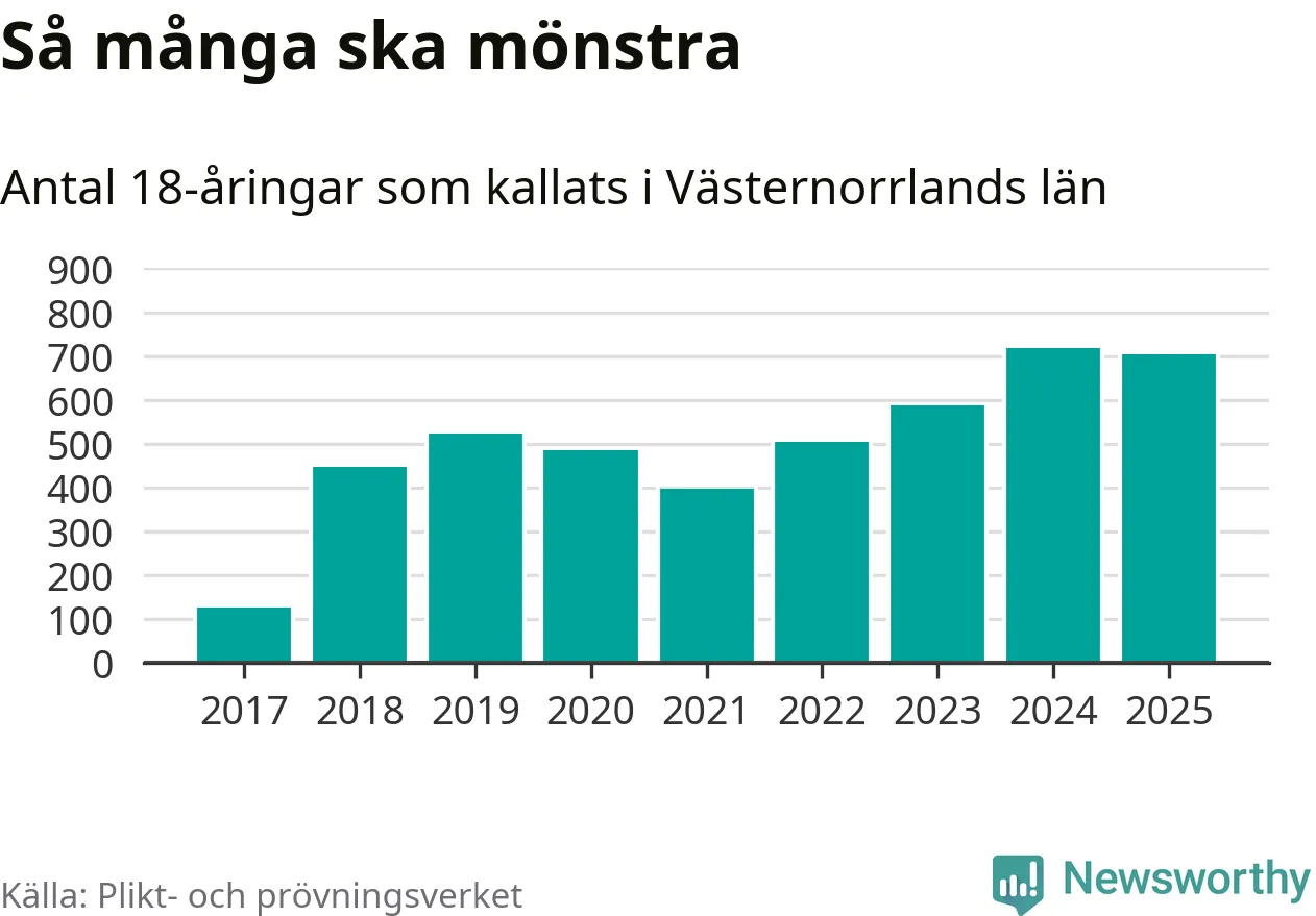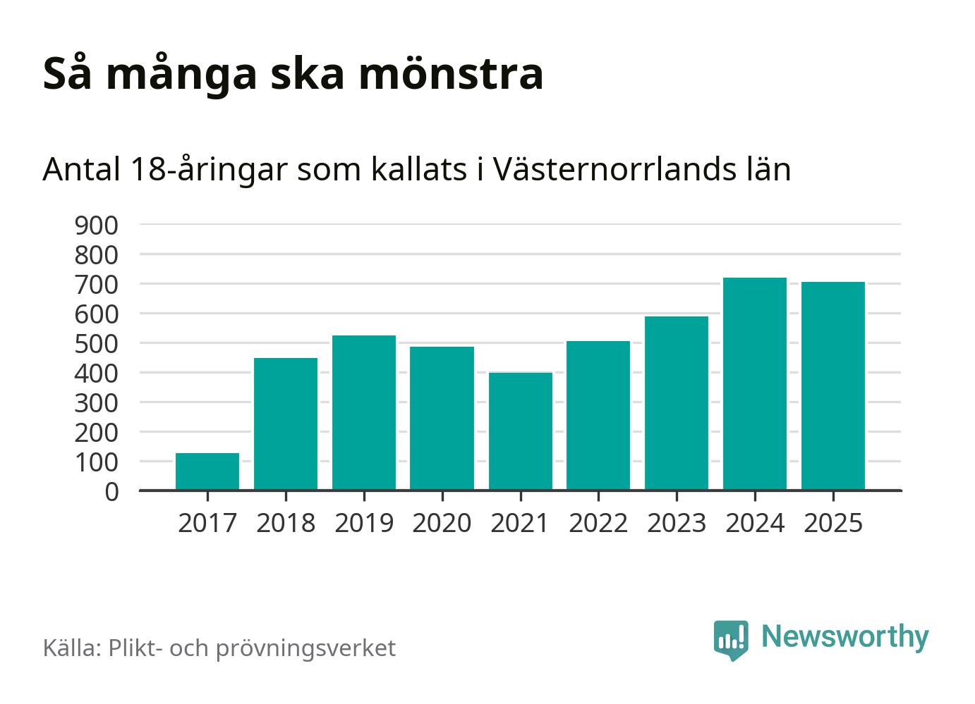 Nu kallas omkring 28 200 svenskar födda 2007 till mönstring. Och 703 av dem kommer från Västernorrland, enligt ny statistik från Plikt- och prövningsverket. Det innebär att nästan var fjärde invånare i åldersgruppen i länet kallas till mönstring. Även i riket som helhet kallas nästan var fjärde person i årskullen.