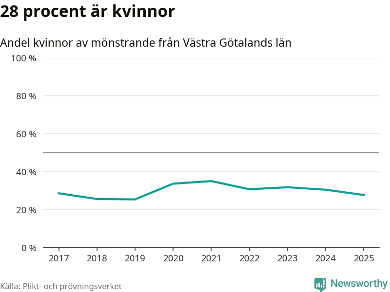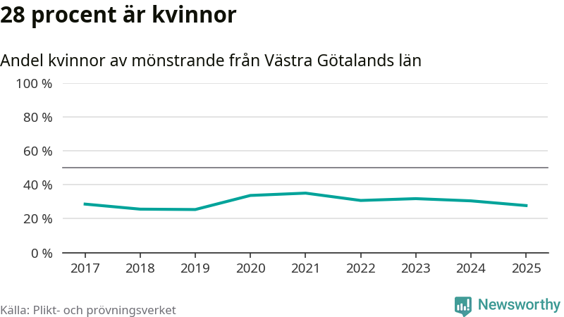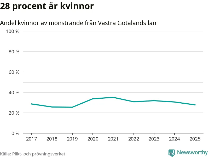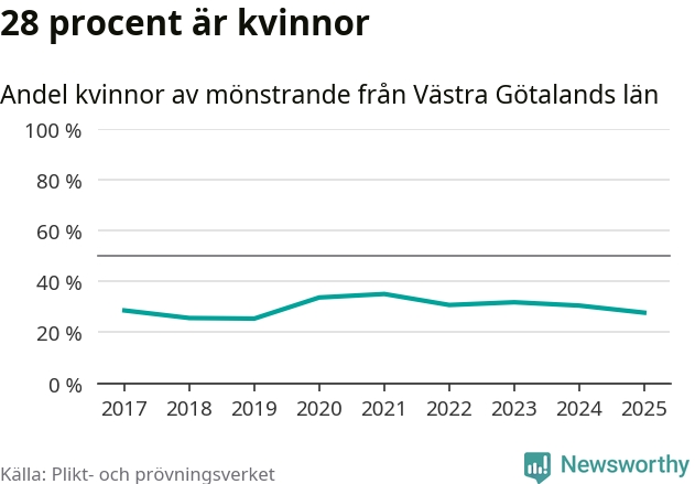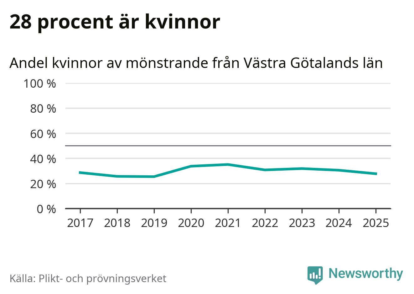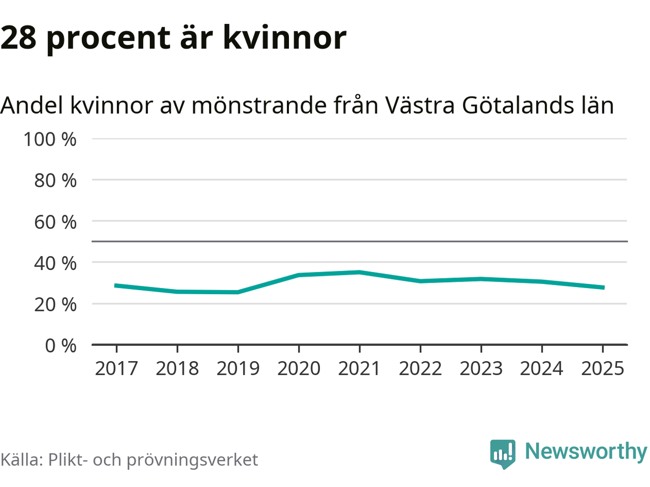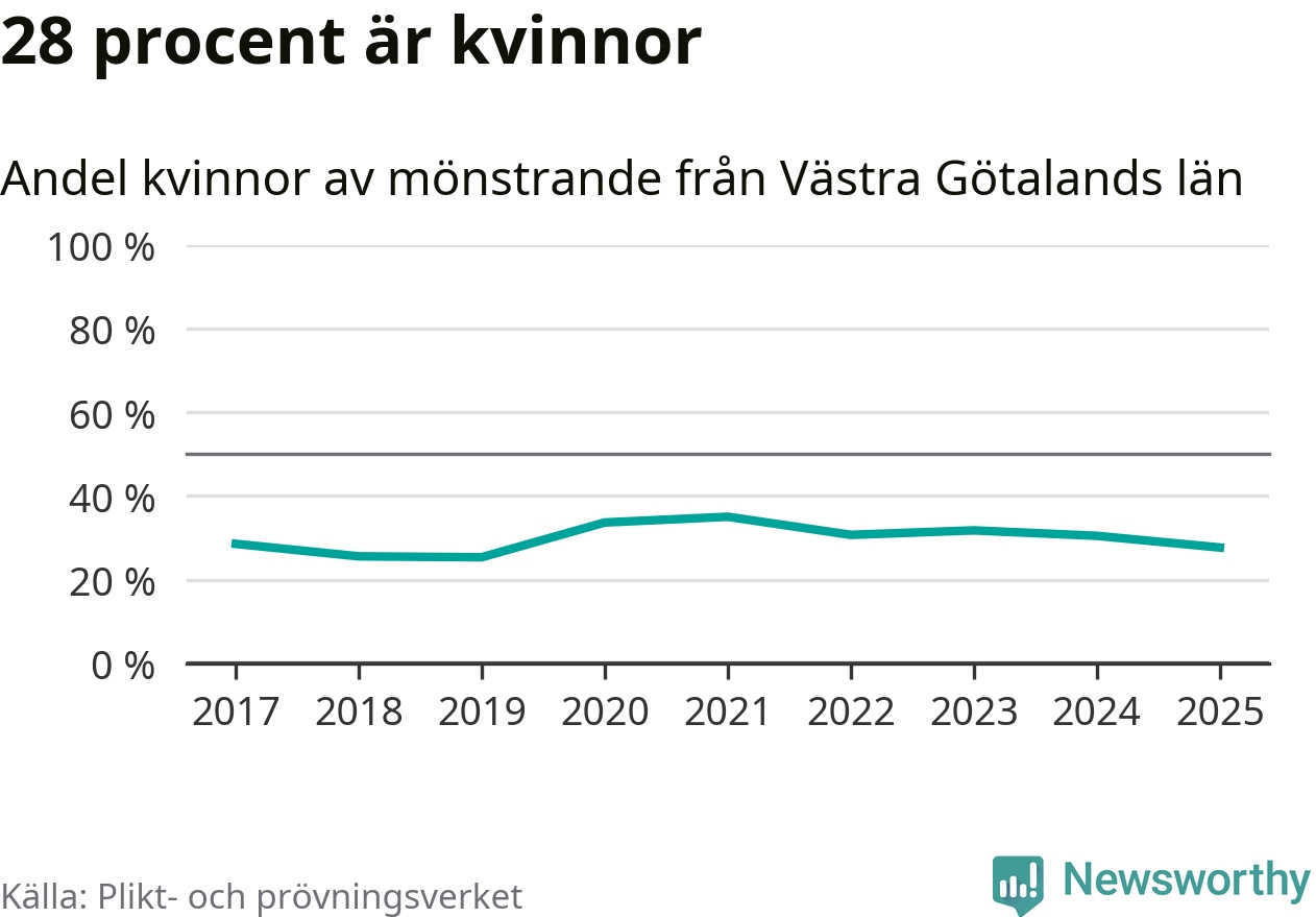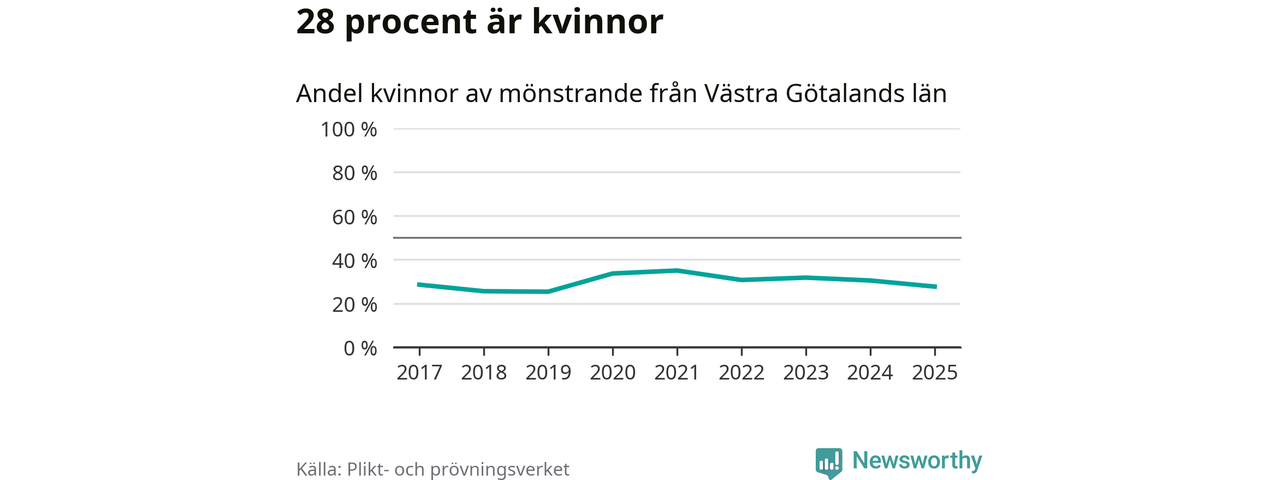 1 253 av de som kallats till mönstring från Västra Götaland är kvinnor, vilket motsvarar 28 procent av de mönstrande. Som mest har 1 391 kvinnor kallats från kommunen (2024). I riket som helhet är 28 procent av de mönstrande tjejer.