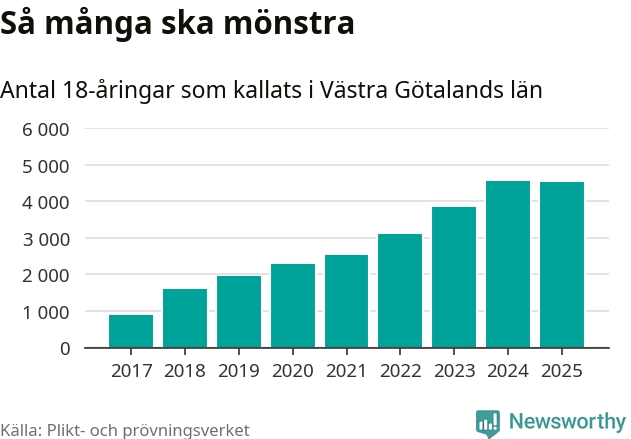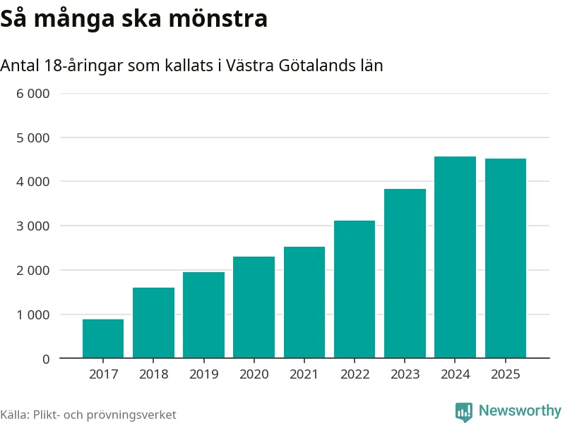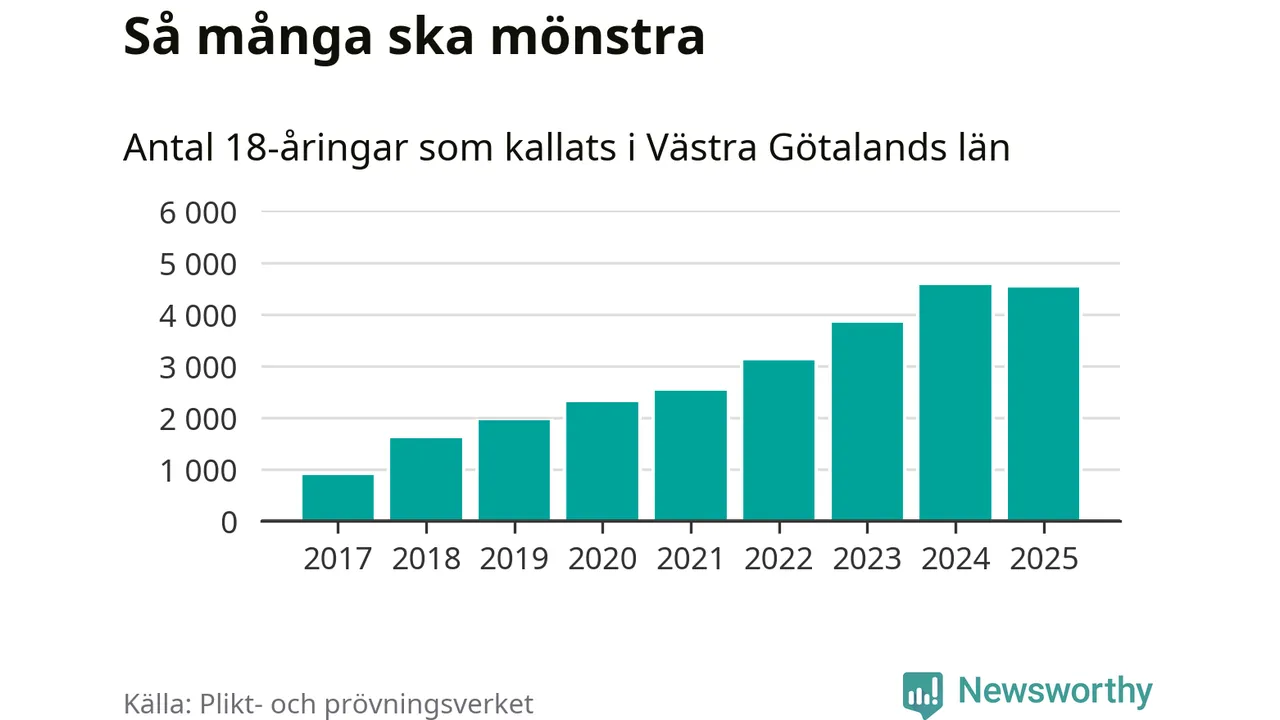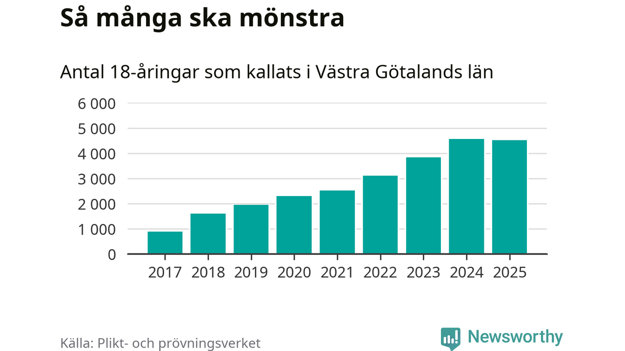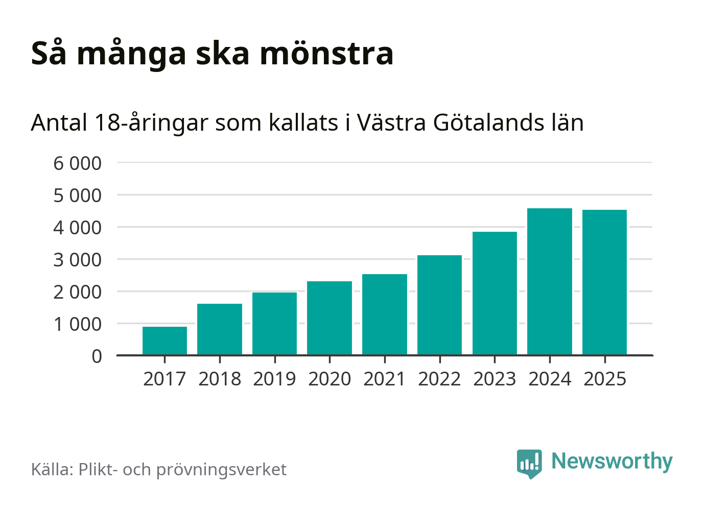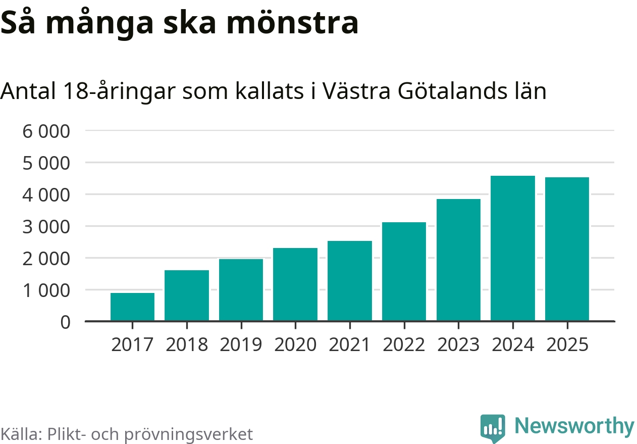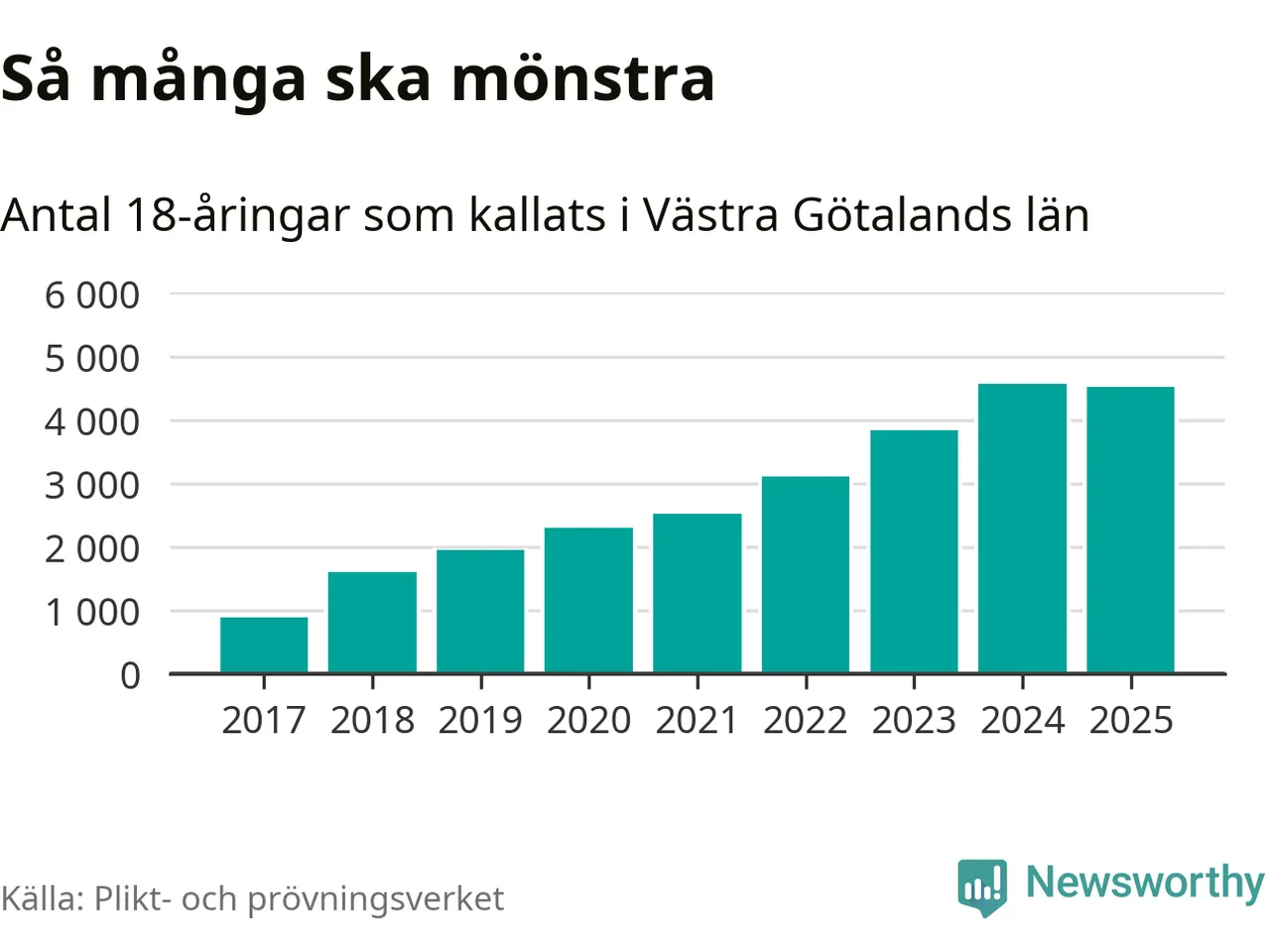 Nu kallas omkring 28 200 svenskar födda 2007 till mönstring. Och 4 523 av dem kommer från Västra Götaland, enligt ny statistik från Plikt- och prövningsverket. Det innebär att var femte invånare i åldersgruppen i länet kallas till mönstring. I riket som helhet kallas nästan var fjärde person i årskullen.