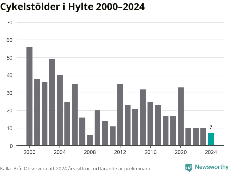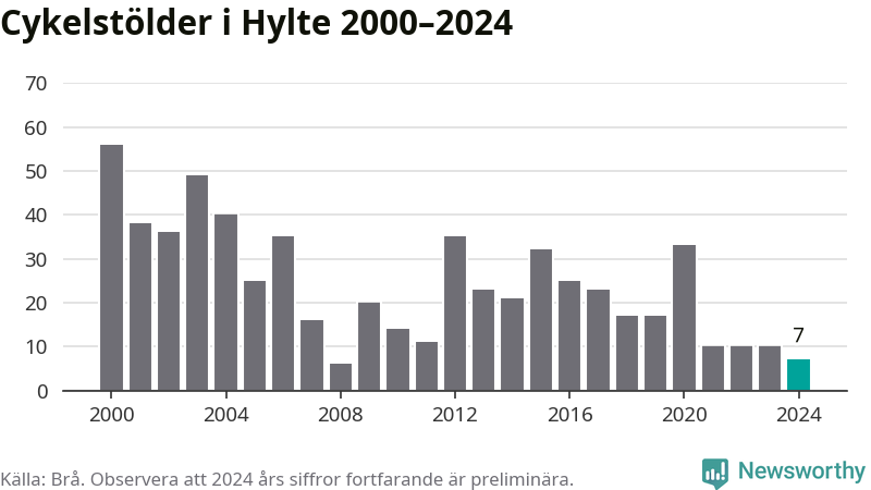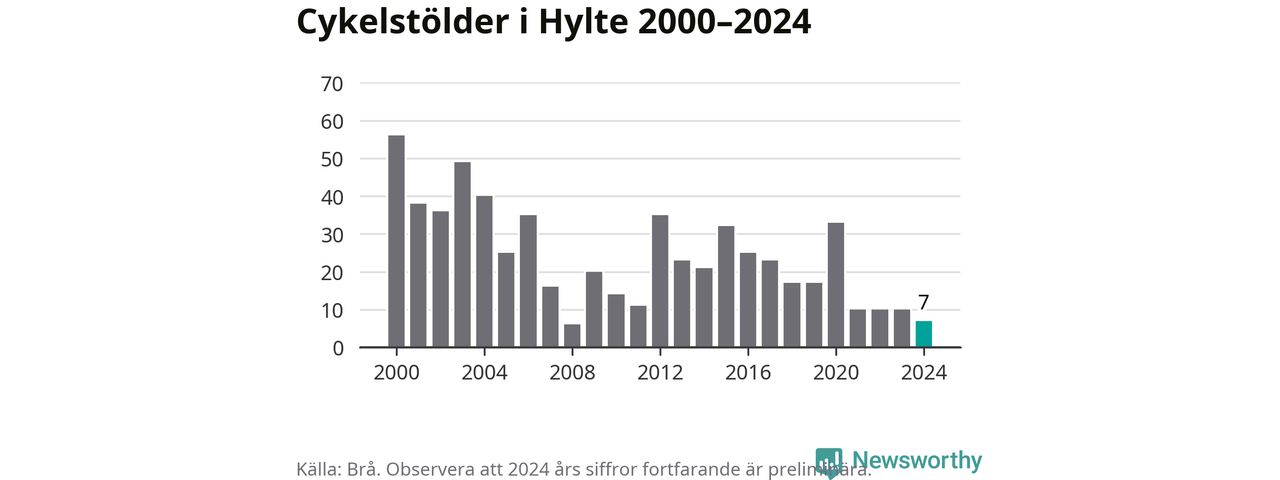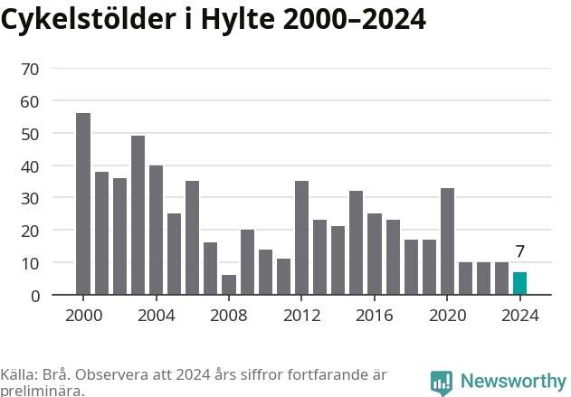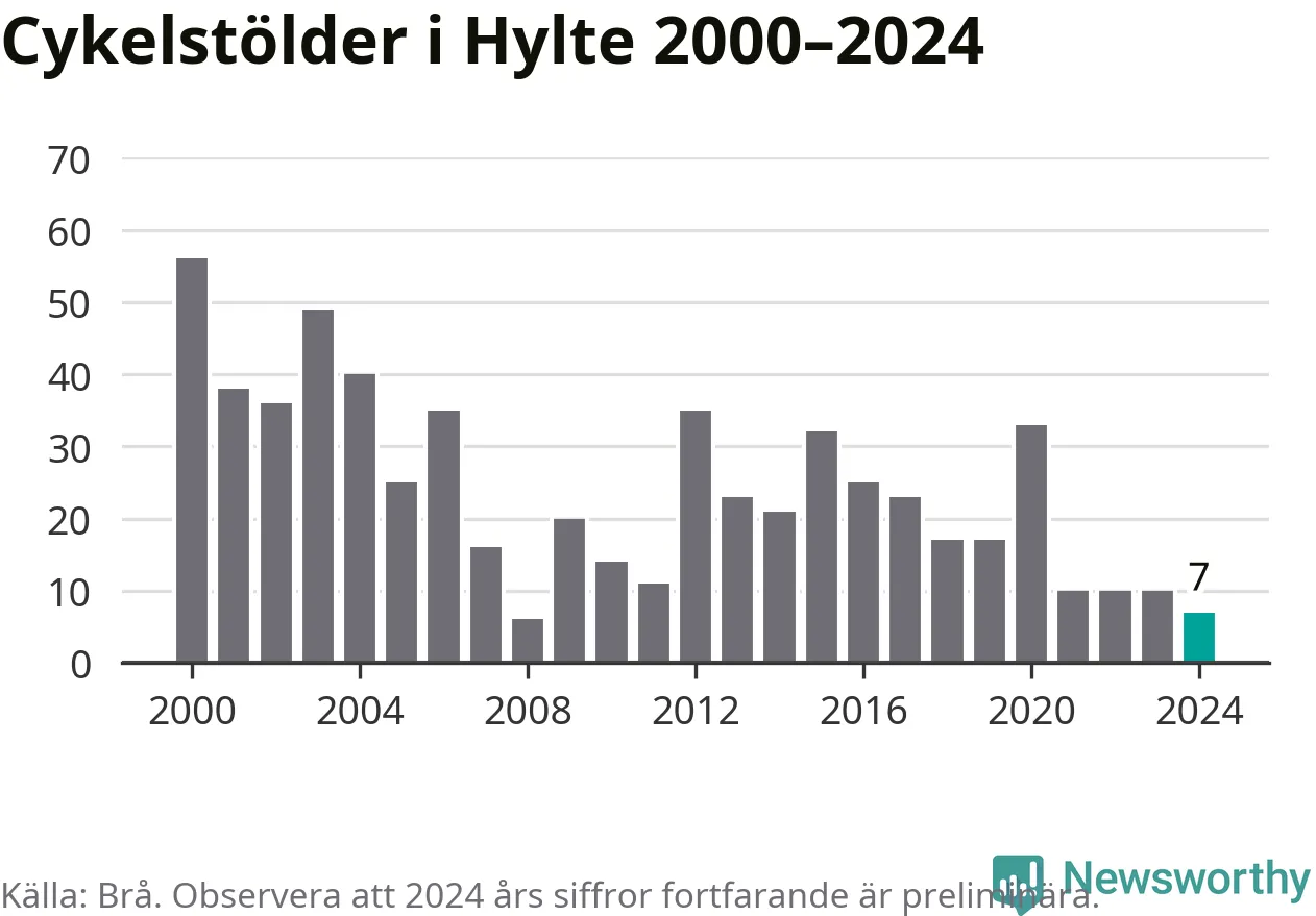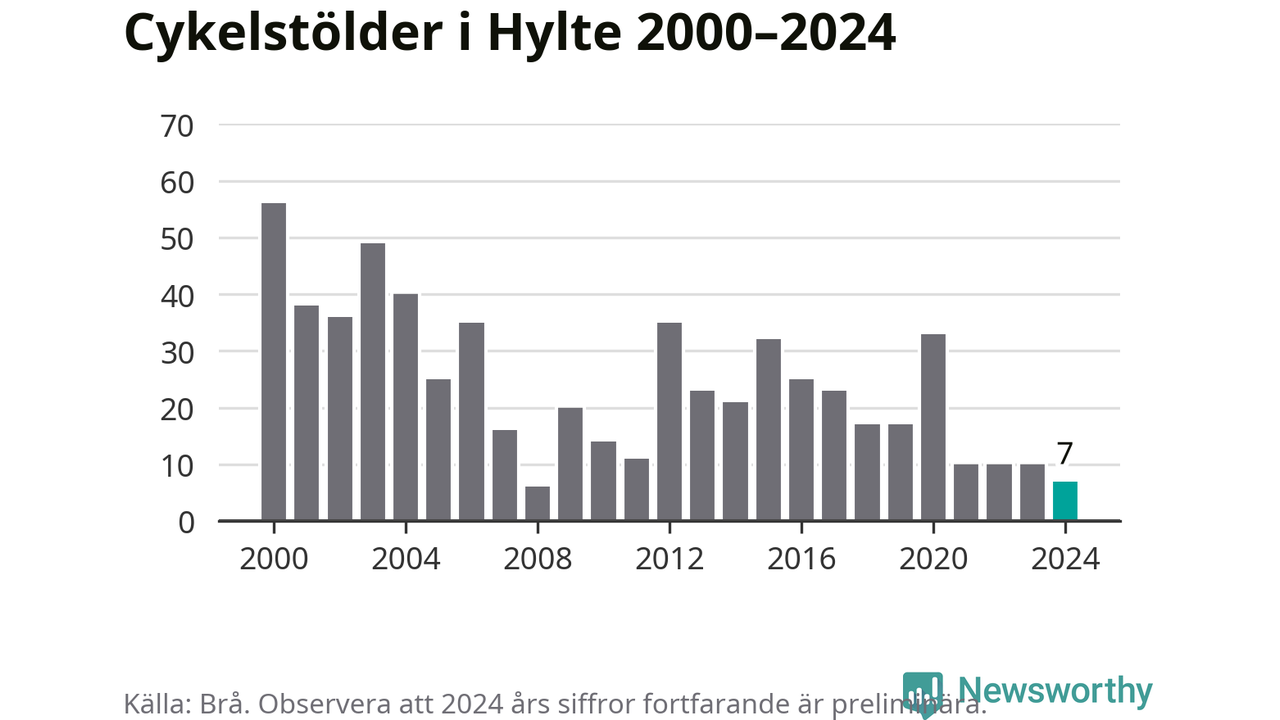 Hylte är inte särskilt drabbat. 2024 gjordes sju anmälningar om cykelstölder i kommunen, enligt siffror från Brottsförebyggande rådet, vilket motsvarar 0,7 anmälningar per 1 000 invånare. Det kan jämföras med 10,9 cyklar per 1 000 invånare i Halmstad, som hade flest cykelstölder per invånare i Halland.