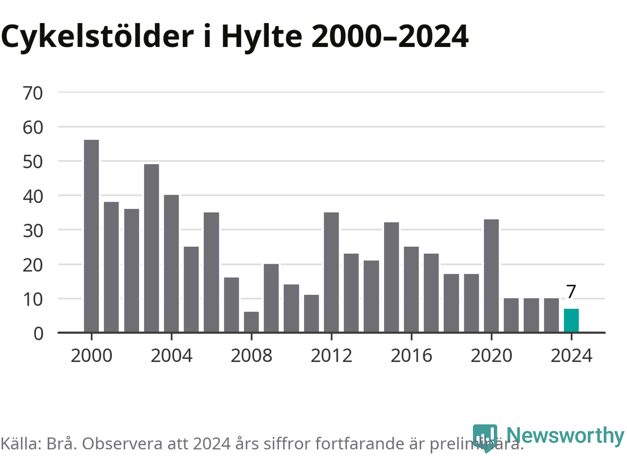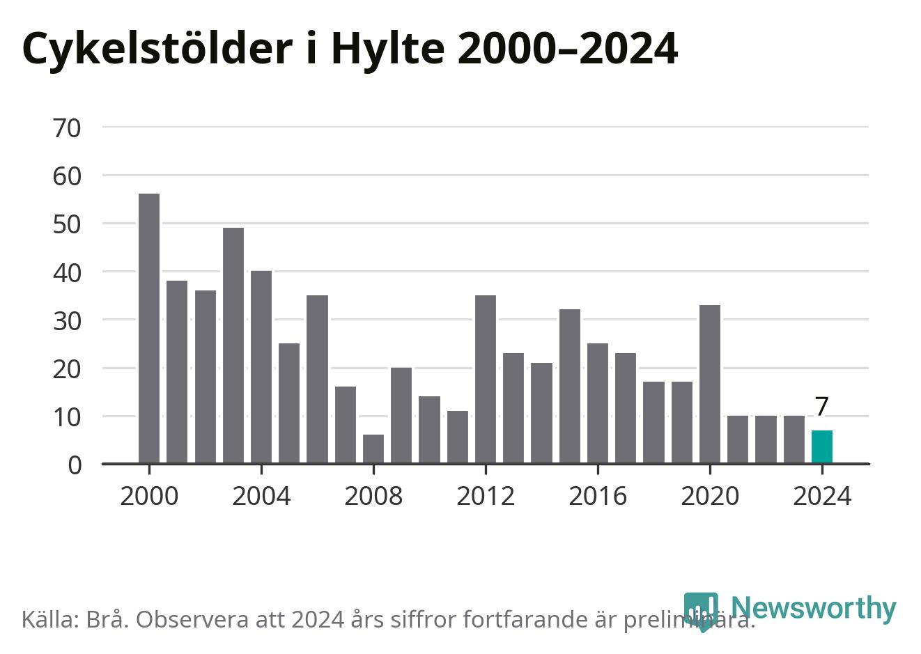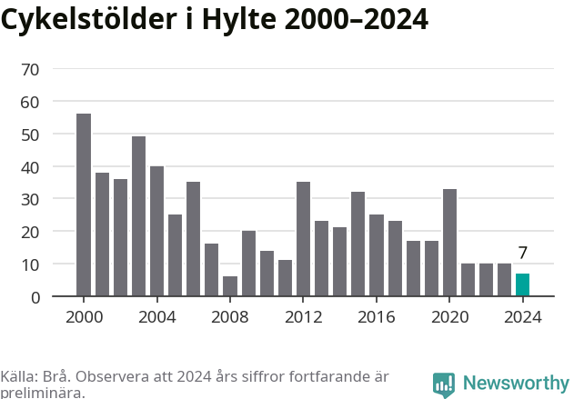 I Hylte kommun var antalet cykelstölder relativt få i en historisk kontext år 2024, även om det fortfarande är preliminära siffror. Under de senaste 25 åren har det som mest anmälts 56 cykelstölder på ett år (2000), som minst 6 stycken (2008).