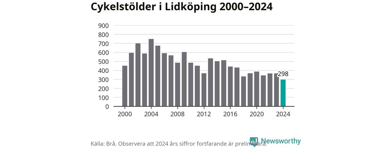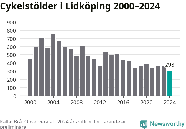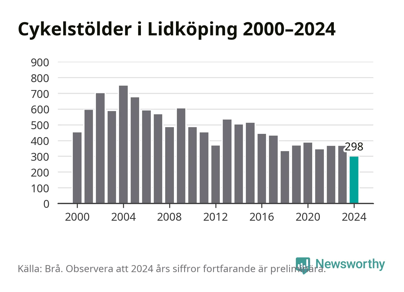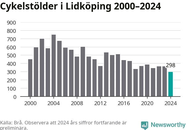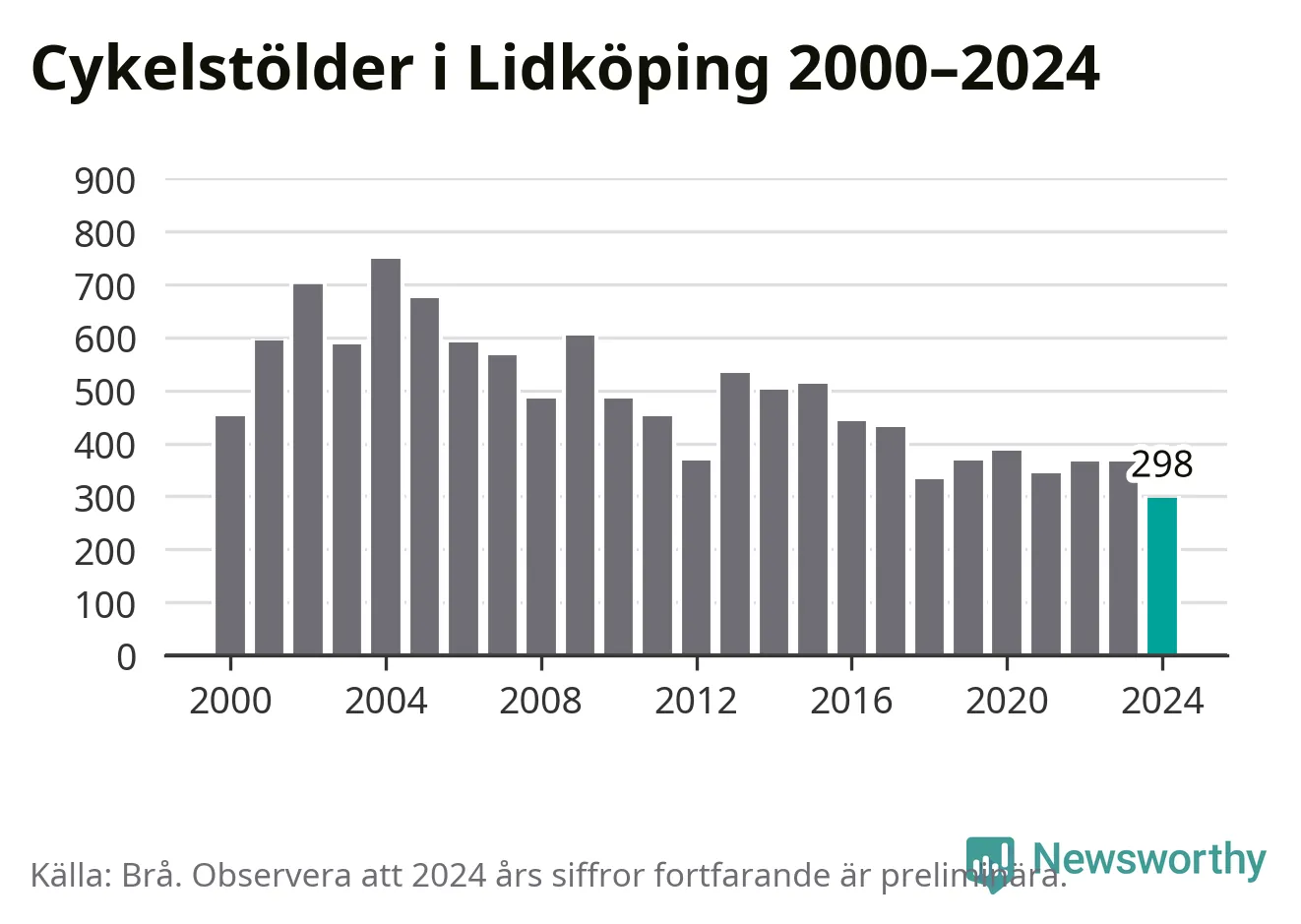 I Lidköpings kommun noterades det lägsta antalet cykelstölder under hela 2000-talet år 2024, även om det fortfarande är preliminära siffror. Under de senaste 25 åren har det som mest anmälts 748 cykelstölder på ett år (2004).