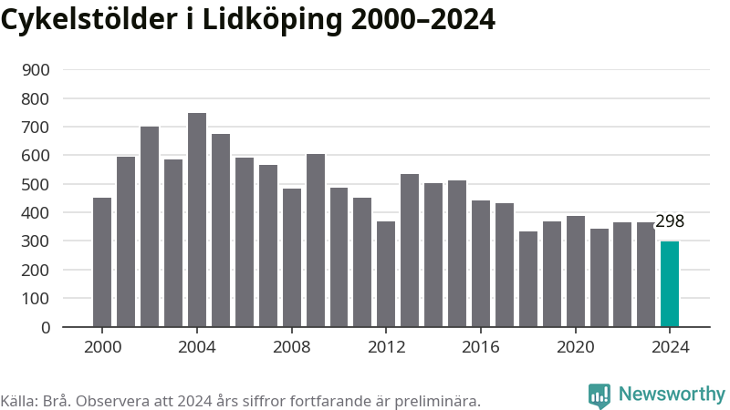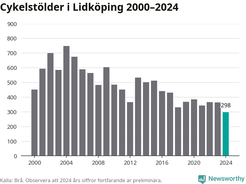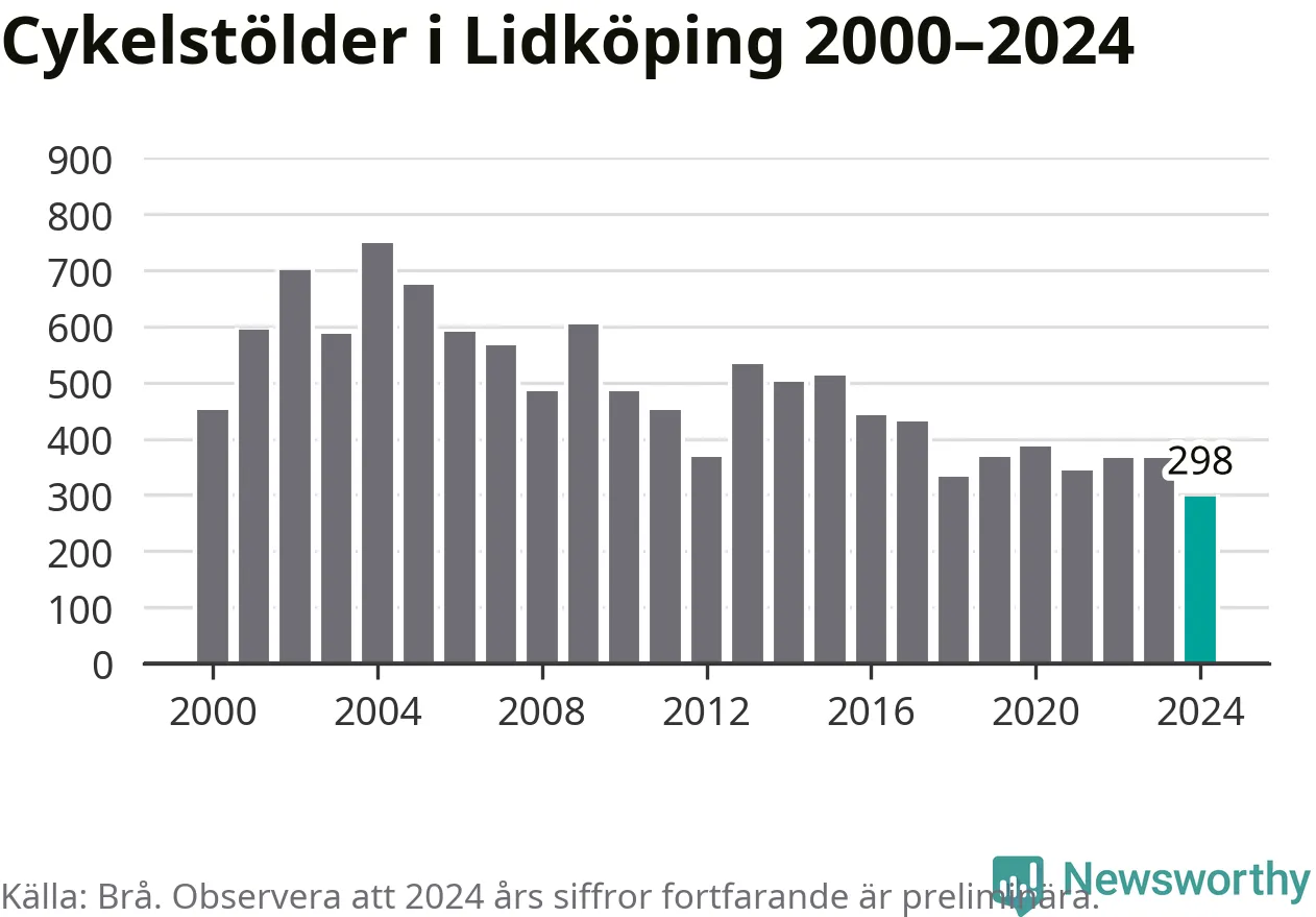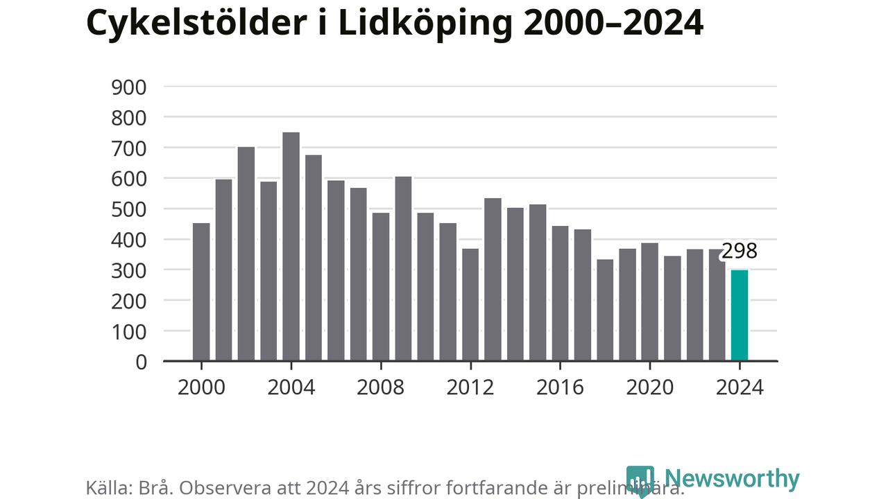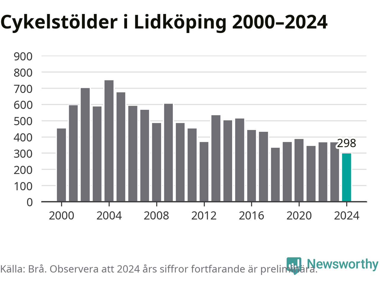 I Lidköpings kommun noterades det lägsta antalet cykelstölder under hela 2000-talet år 2024, även om det fortfarande är preliminära siffror. Under de senaste 25 åren har det som mest anmälts 748 cykelstölder på ett år (2004).