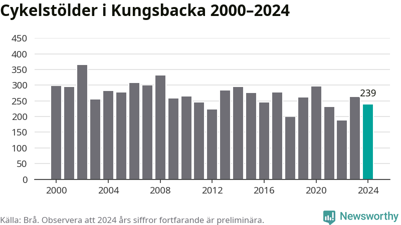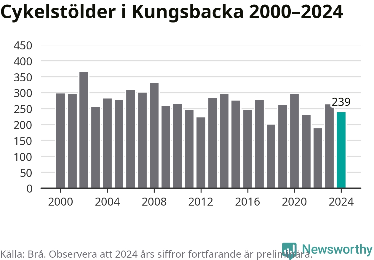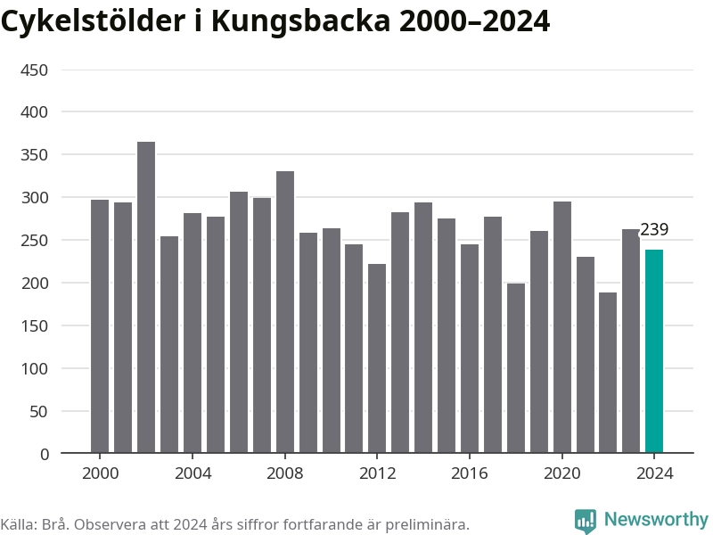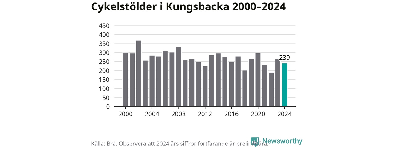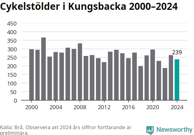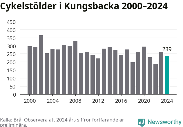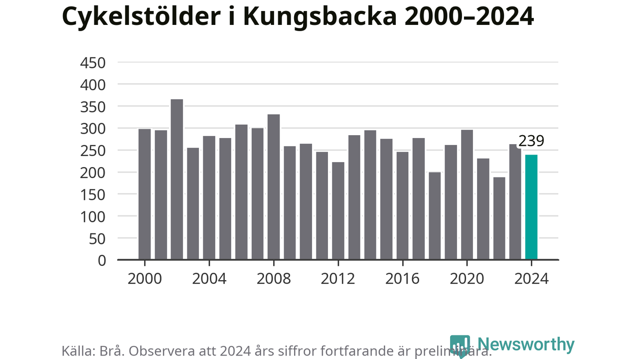 I Kungsbacka kommun var antalet cykelstölder relativt få i en historisk kontext år 2024, även om det fortfarande är preliminära siffror. Under de senaste 25 åren har det som mest anmälts 365 cykelstölder på ett år (2002), som minst 188 stycken (2022).