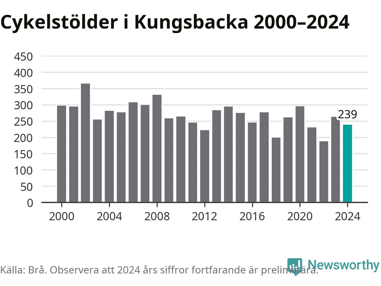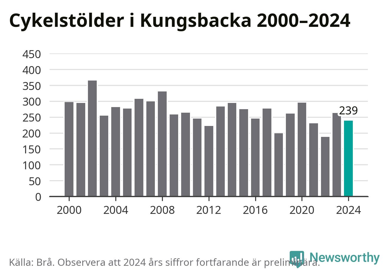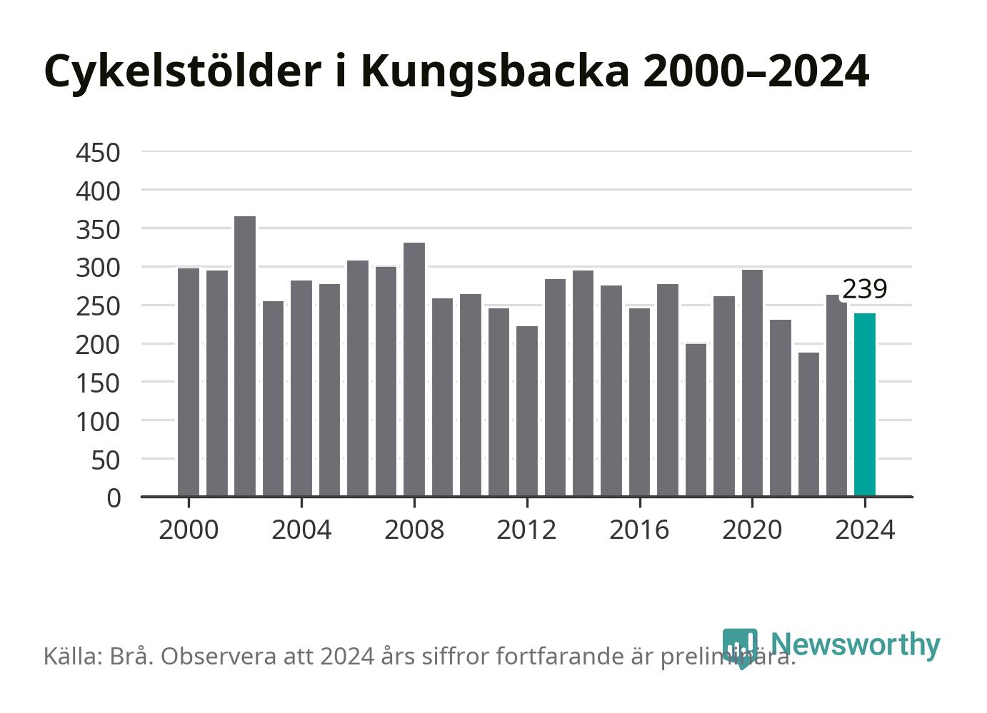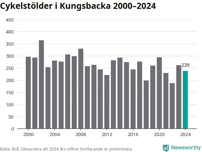 I Kungsbacka kommun var antalet cykelstölder relativt få i en historisk kontext år 2024, även om det fortfarande är preliminära siffror. Under de senaste 25 åren har det som mest anmälts 365 cykelstölder på ett år (2002), som minst 188 stycken (2022).