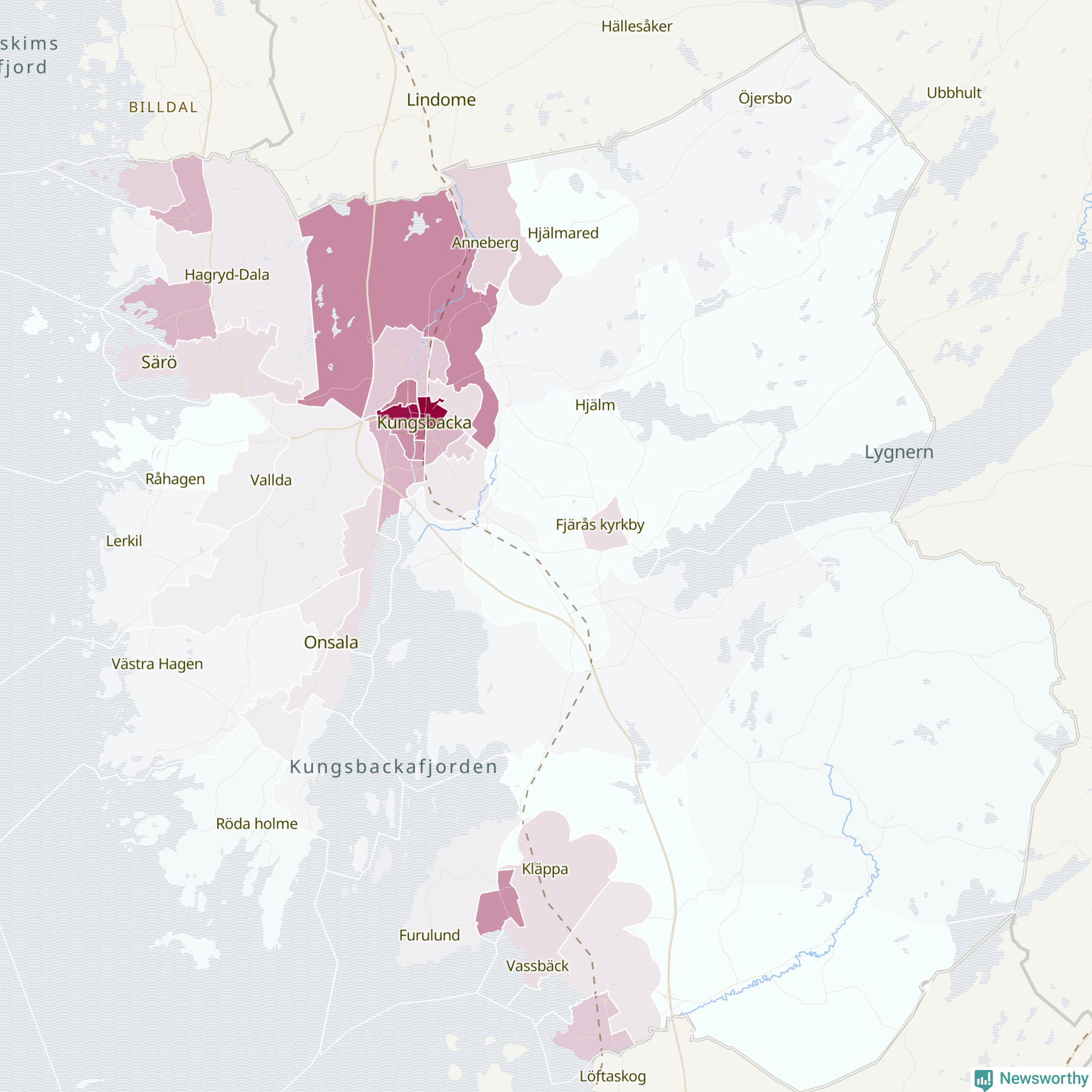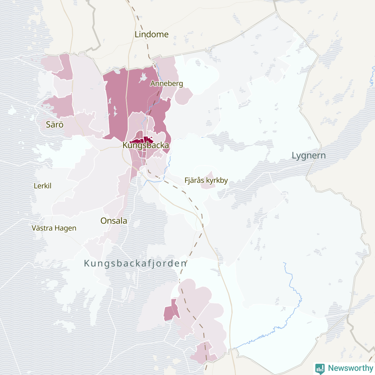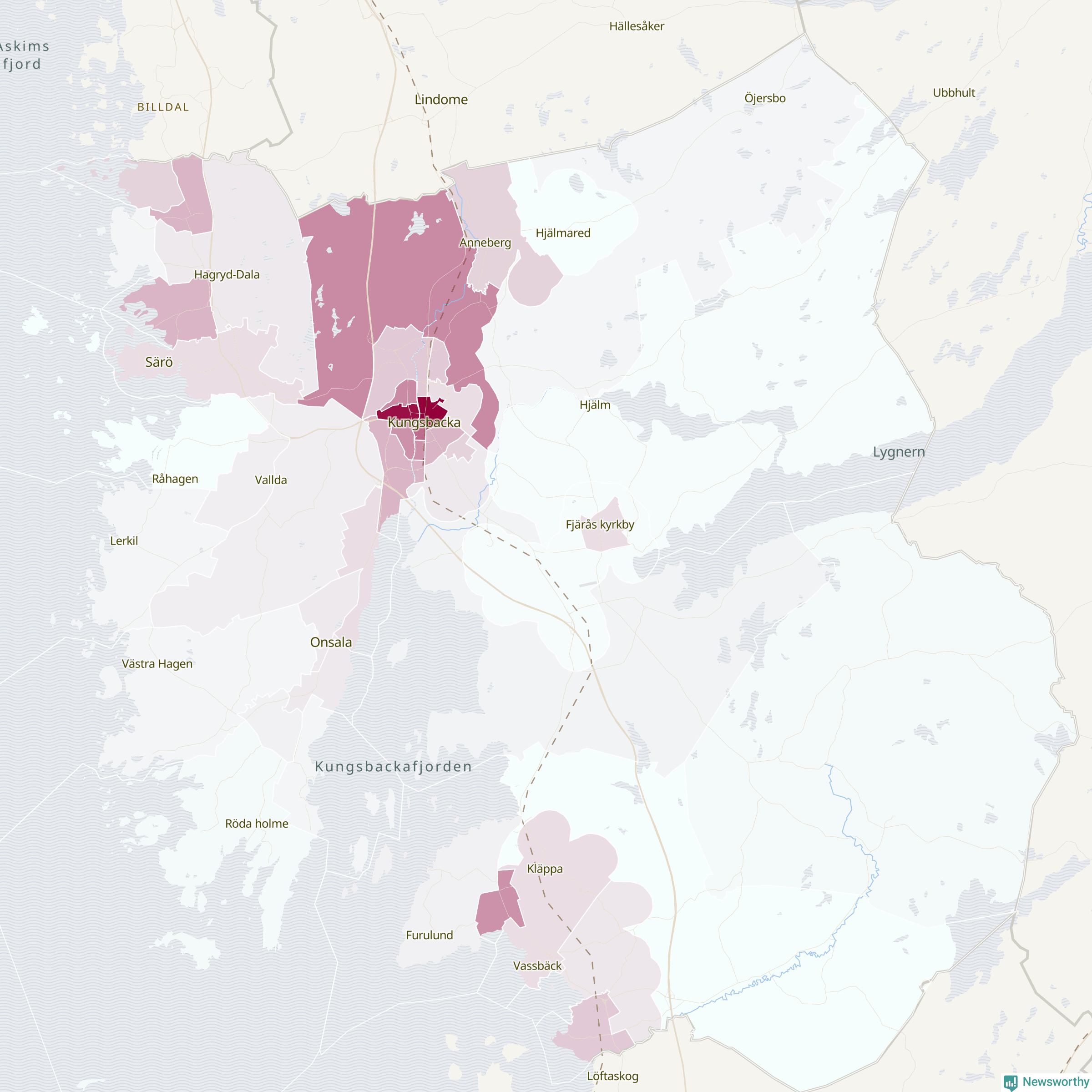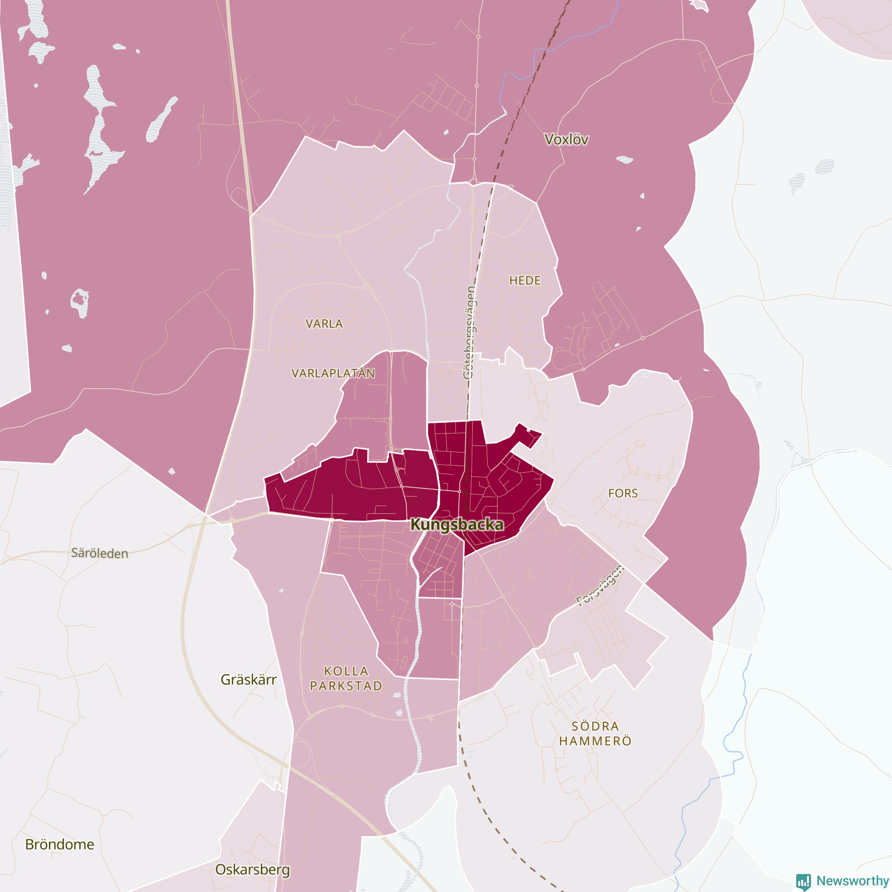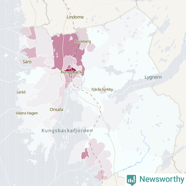Men alla delar av Kungsbacka är inte lika hårt drabbade. Det visar data för de senaste fem åren, som Newsworthy begärt ut från polisen. De anmälda stölderna har kopplats till SCB:s 44 statistiska områden i kommunen. Det rör sig om mellan en handfull och ett etthundratal anmälda stölder per område.