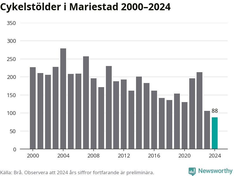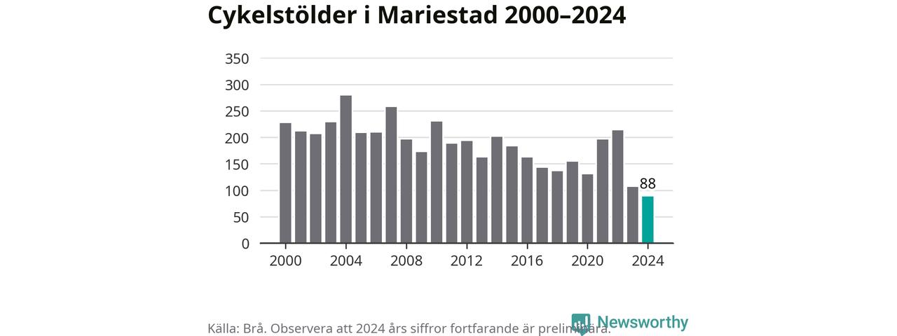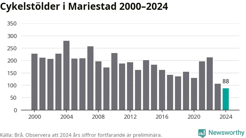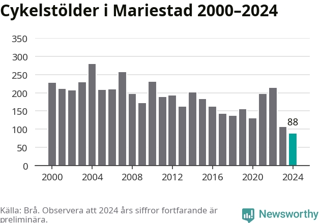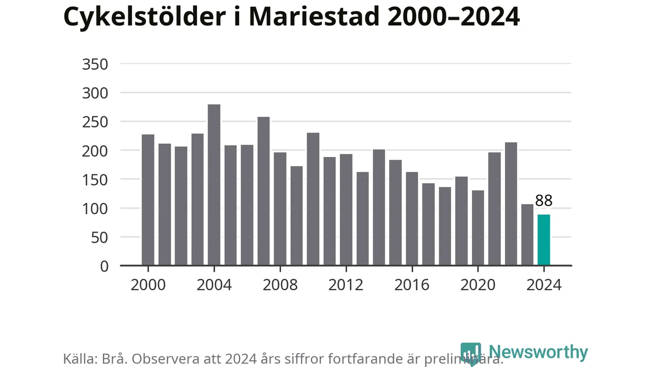 I Mariestads kommun noterades det lägsta antalet cykelstölder under hela 2000-talet år 2024, även om det fortfarande är preliminära siffror. Under de senaste 25 åren har det som mest anmälts 279 cykelstölder på ett år (2004).