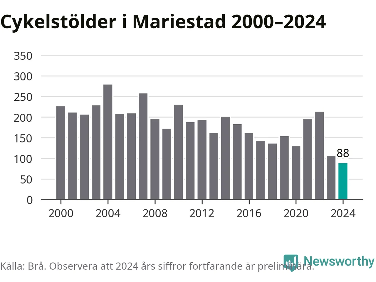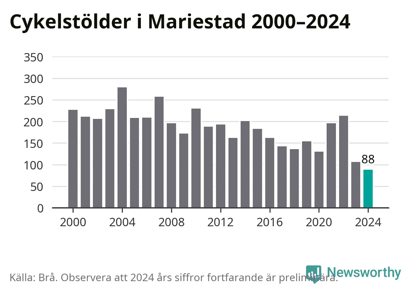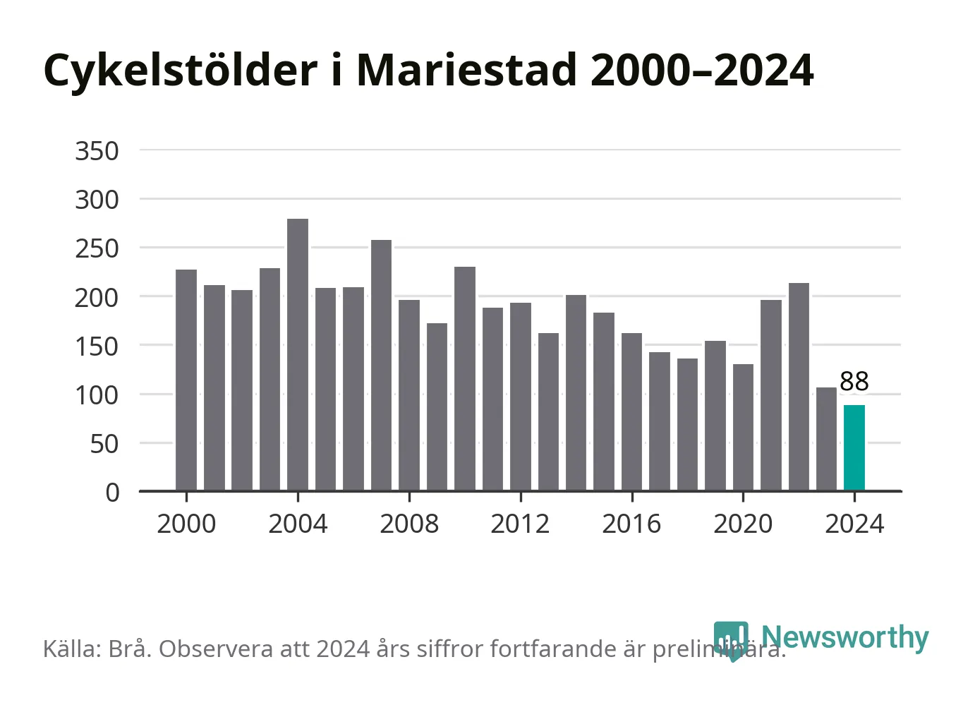 I Mariestads kommun noterades det lägsta antalet cykelstölder under hela 2000-talet år 2024, även om det fortfarande är preliminära siffror. Under de senaste 25 åren har det som mest anmälts 279 cykelstölder på ett år (2004).