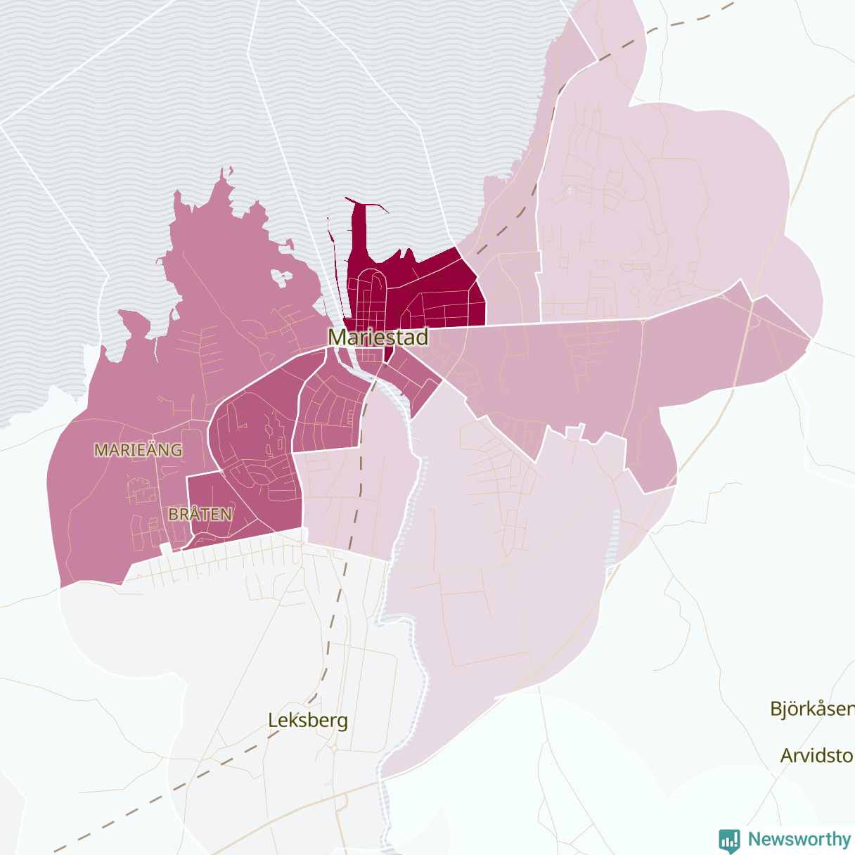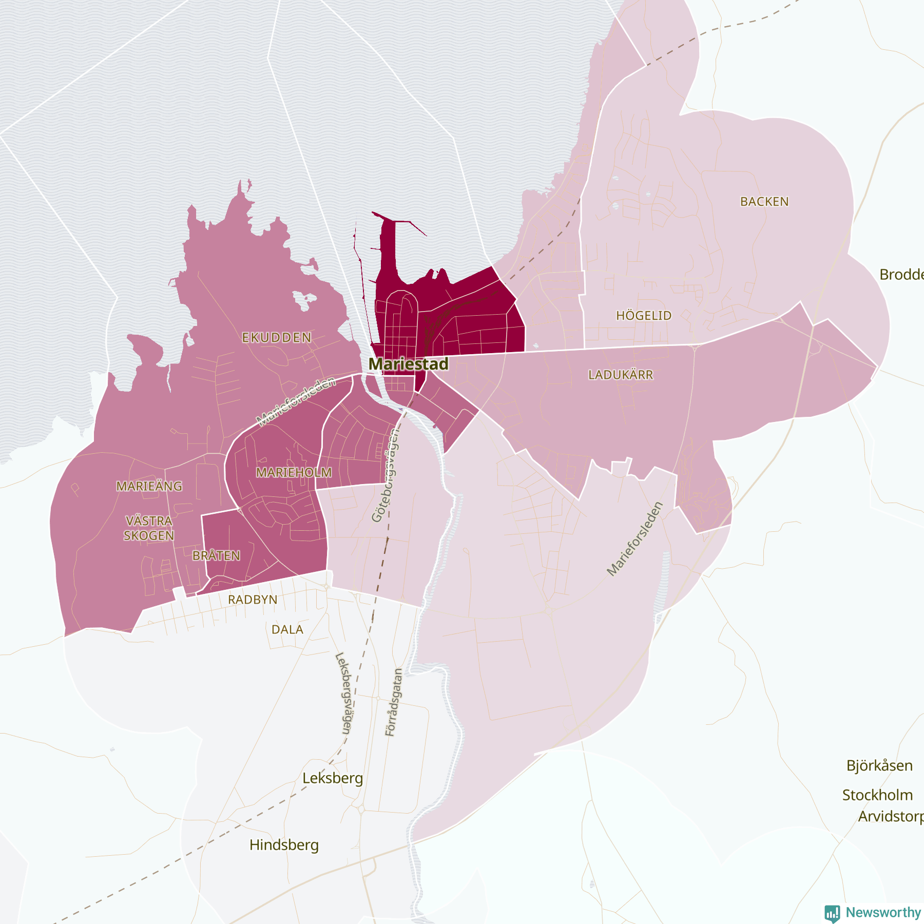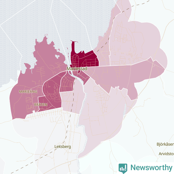 Men alla delar av Mariestad är inte lika hårt drabbade. Det visar data för de senaste fem åren, som Newsworthy begärt ut från polisen. De anmälda stölderna har kopplats till SCB:s 15 statistiska områden i kommunen. Det rör sig om mellan en handfull och drygt 100 anmälda stölder per område.