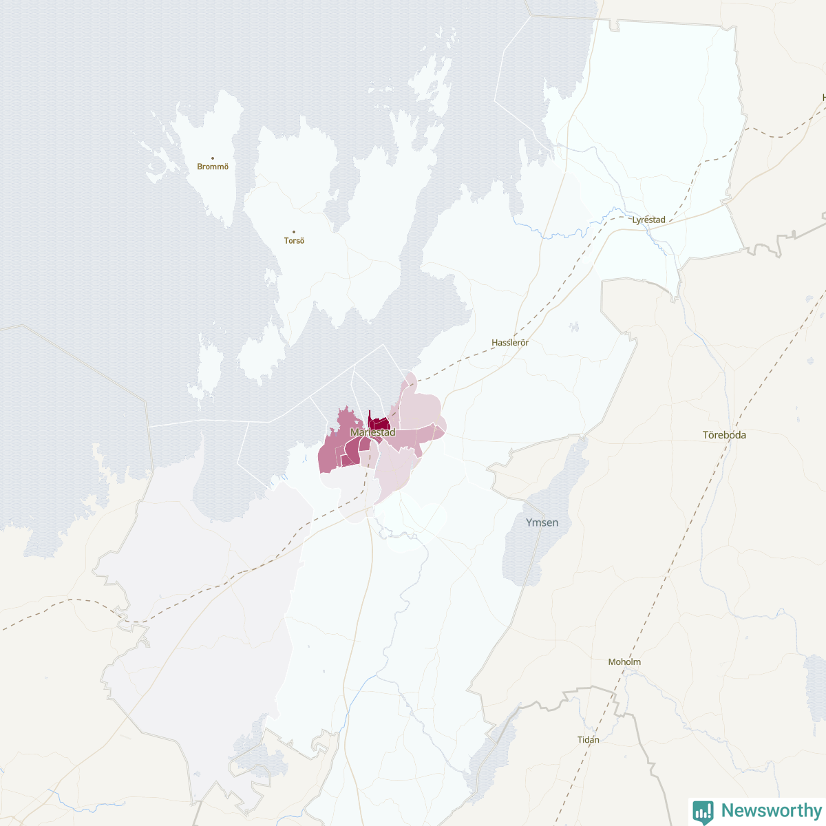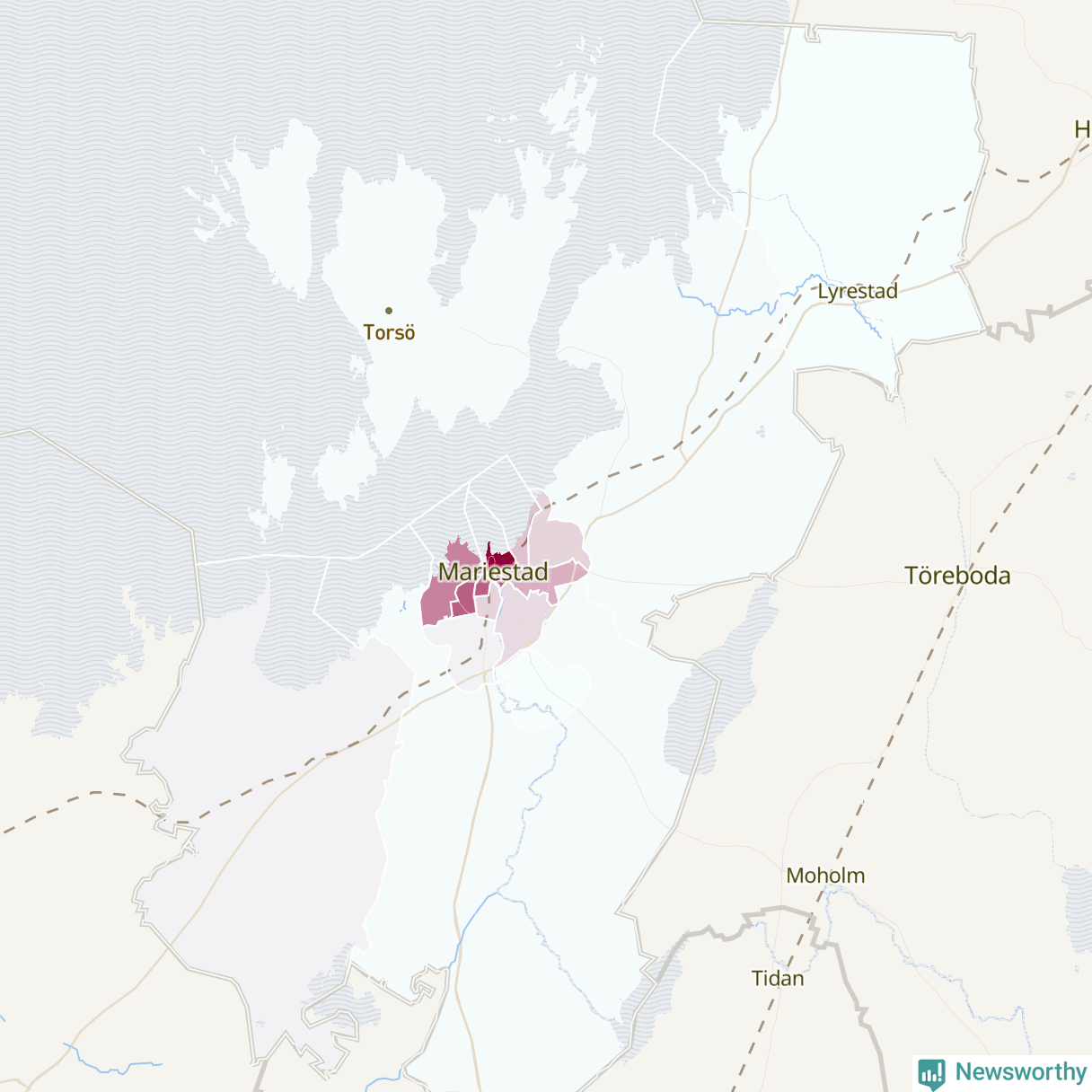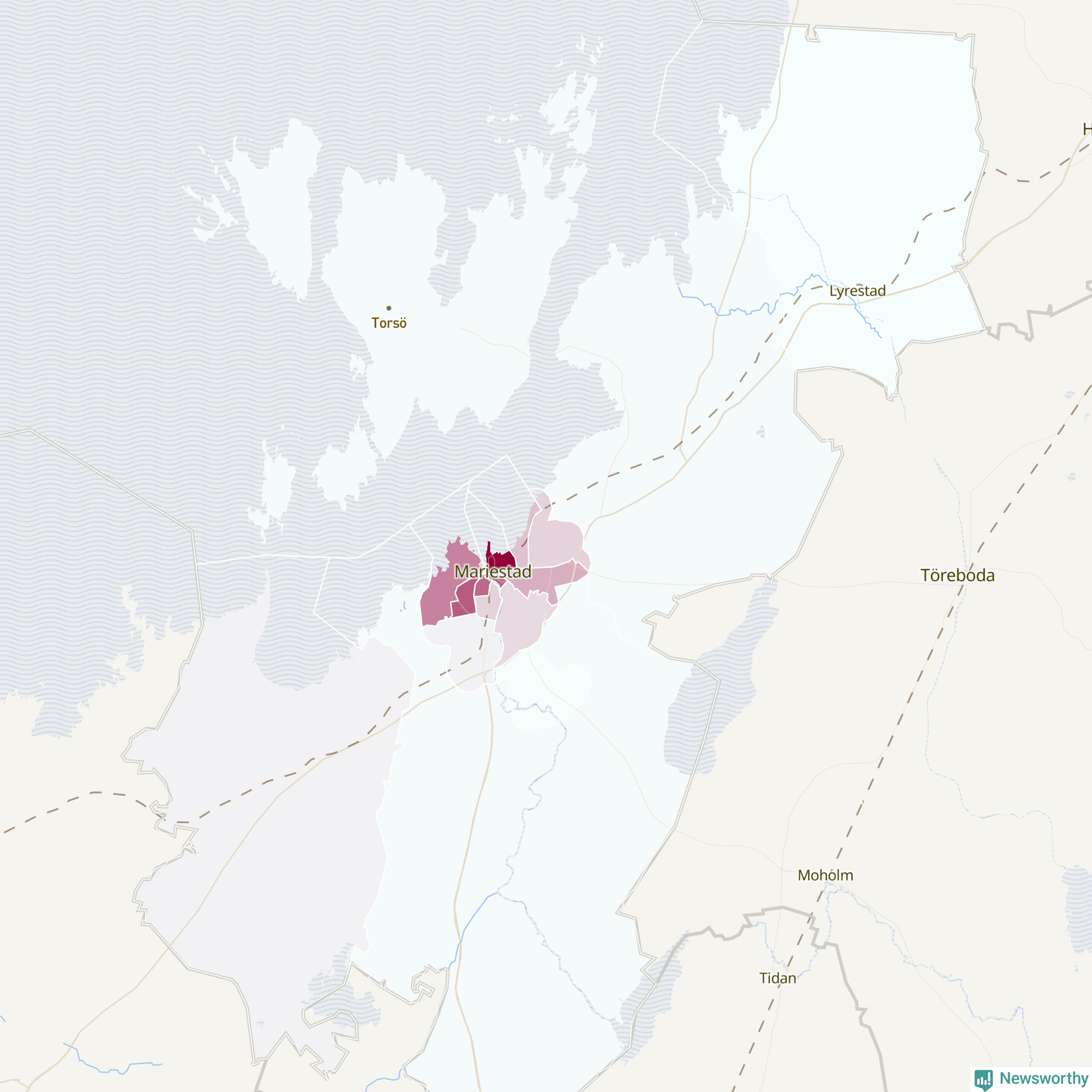 Men alla delar av Mariestad är inte lika hårt drabbade. Det visar data för de senaste fem åren, som Newsworthy begärt ut från polisen. De anmälda stölderna har kopplats till SCB:s 15 statistiska områden i kommunen. Det rör sig om mellan en handfull och drygt 100 anmälda stölder per område.