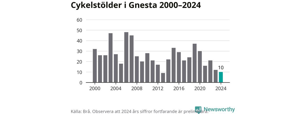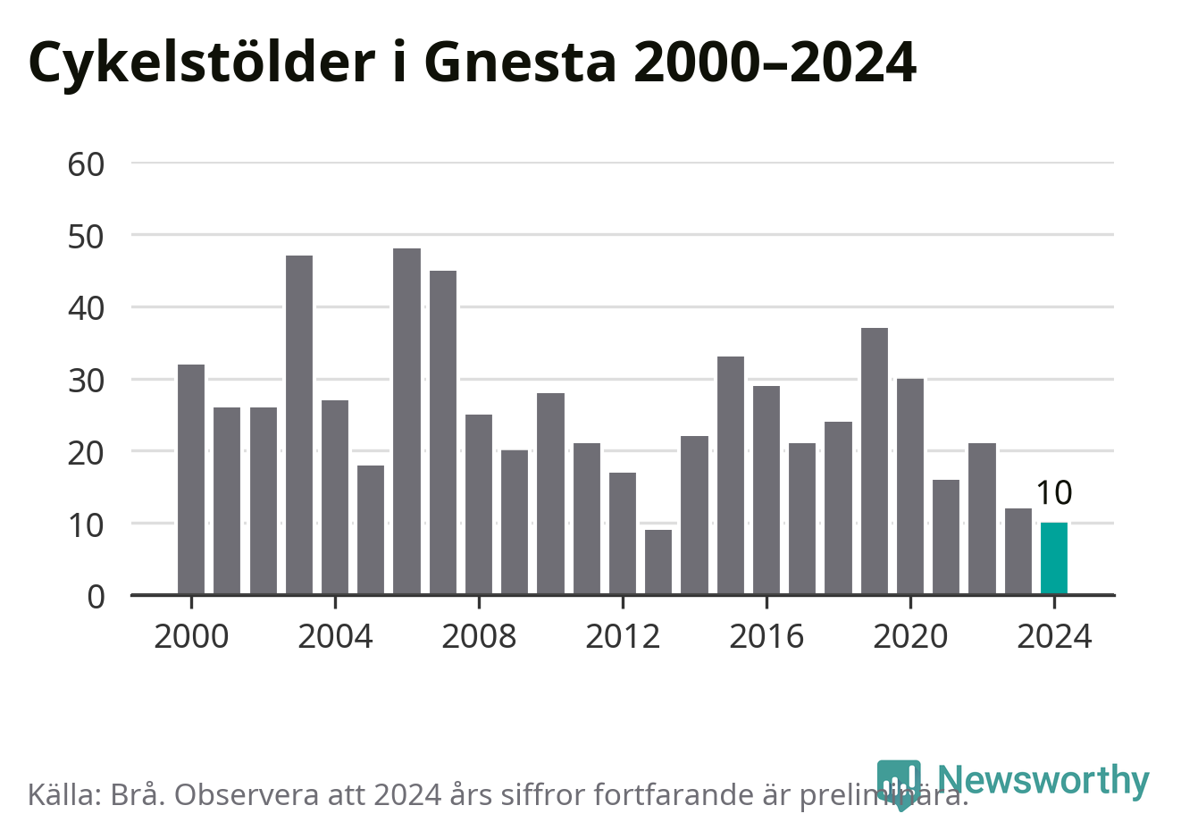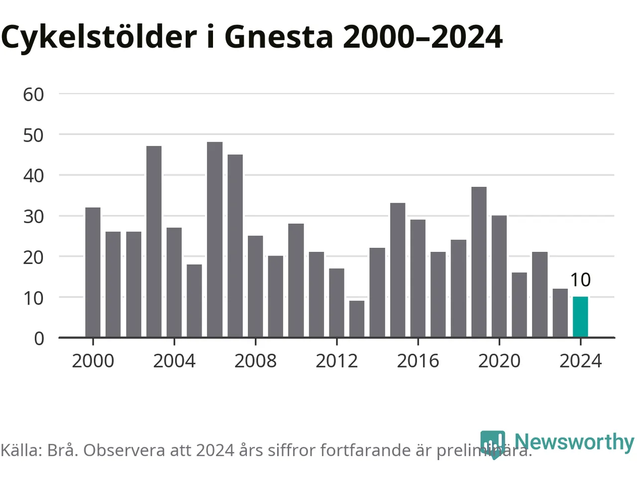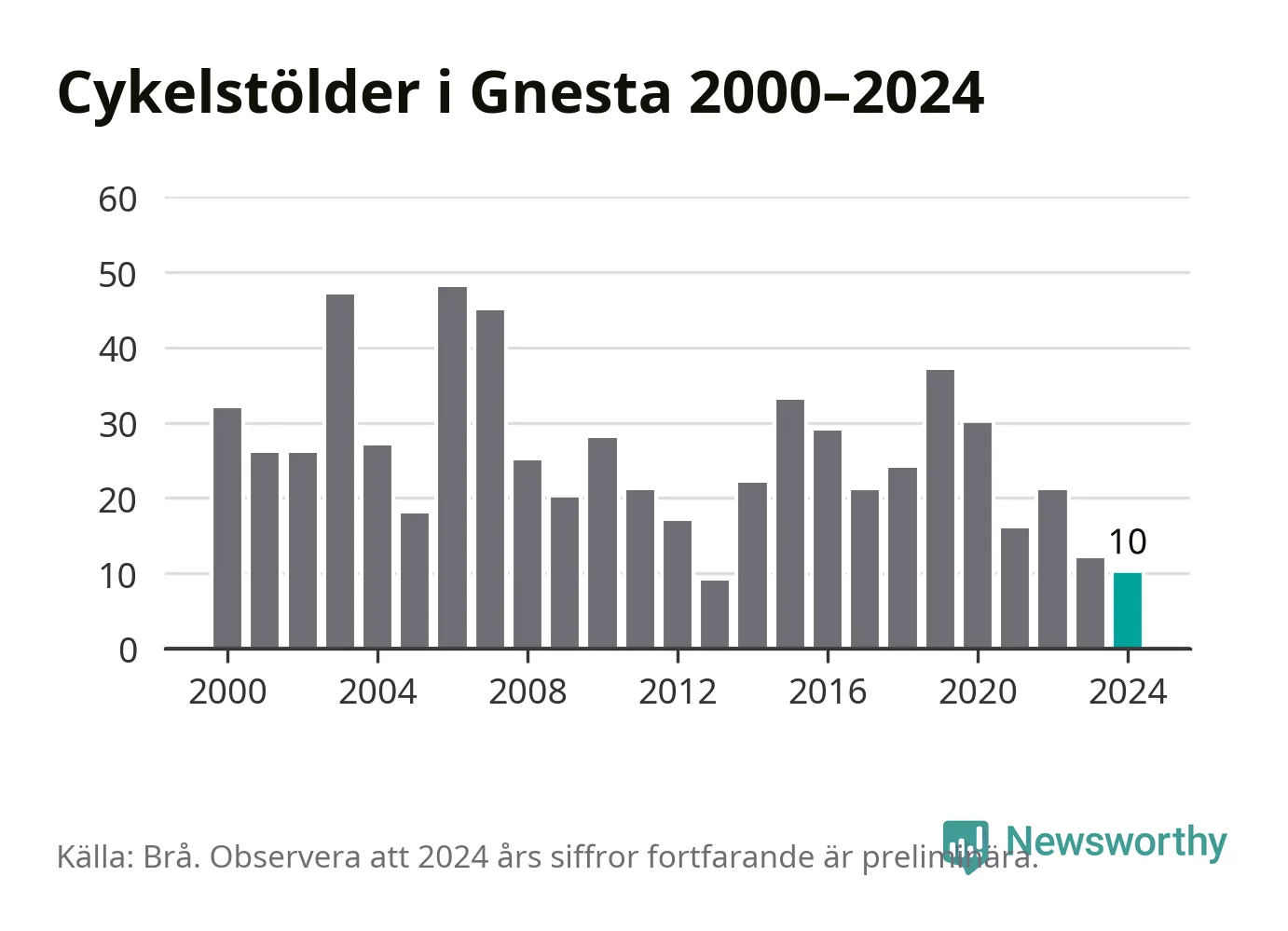 Gnesta är inte särskilt drabbat. 2024 gjordes tio anmälningar om cykelstölder i kommunen, enligt siffror från Brottsförebyggande rådet, vilket motsvarar 0,9 anmälningar per 1 000 invånare. Det kan jämföras med 5,5 cyklar per 1 000 invånare i Nyköping, som hade flest cykelstölder per invånare i Södermanland.