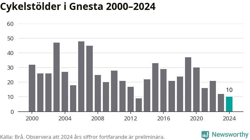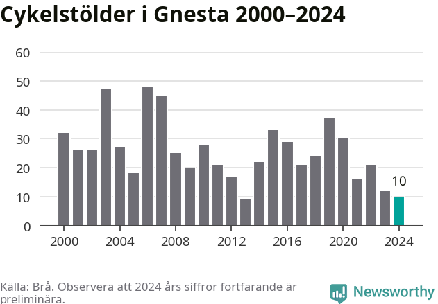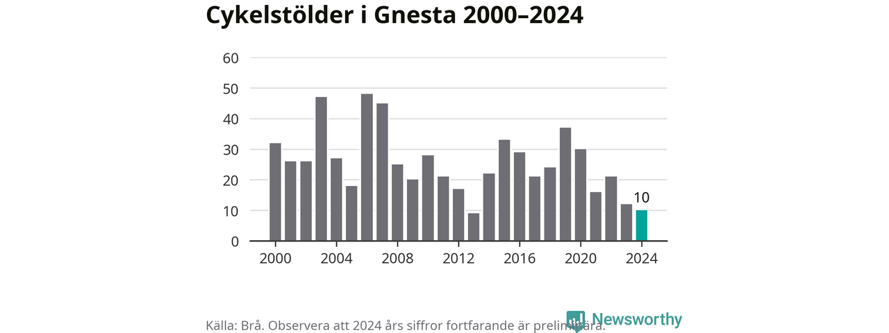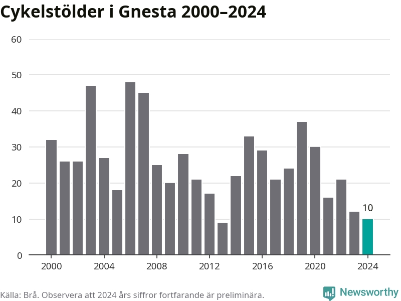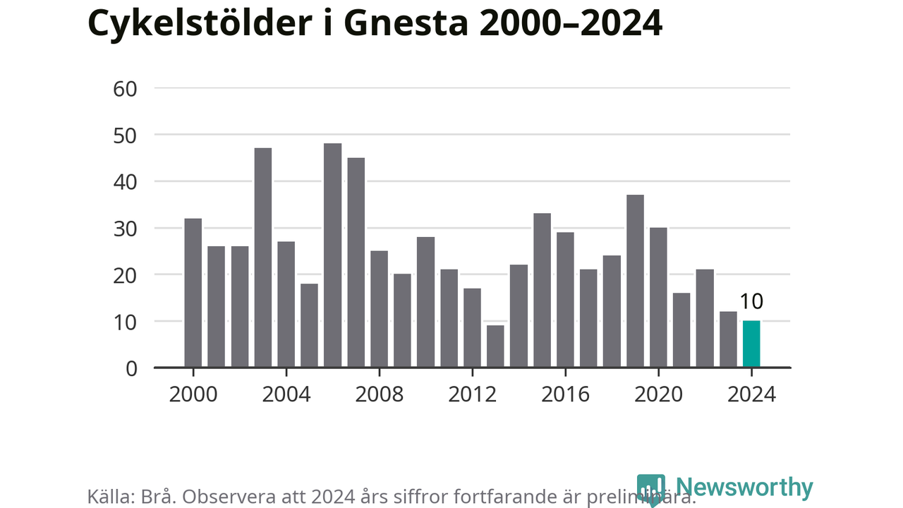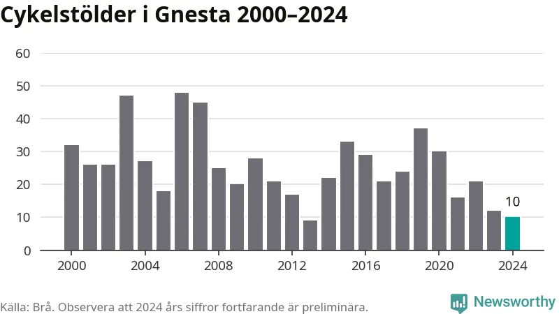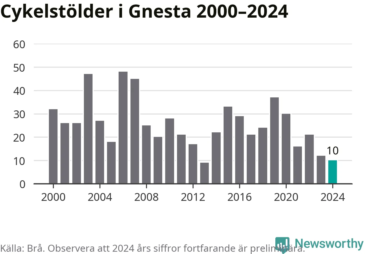 Gnesta är inte särskilt drabbat. 2024 gjordes tio anmälningar om cykelstölder i kommunen, enligt siffror från Brottsförebyggande rådet, vilket motsvarar 0,9 anmälningar per 1 000 invånare. Det kan jämföras med 5,5 cyklar per 1 000 invånare i Nyköping, som hade flest cykelstölder per invånare i Södermanland.