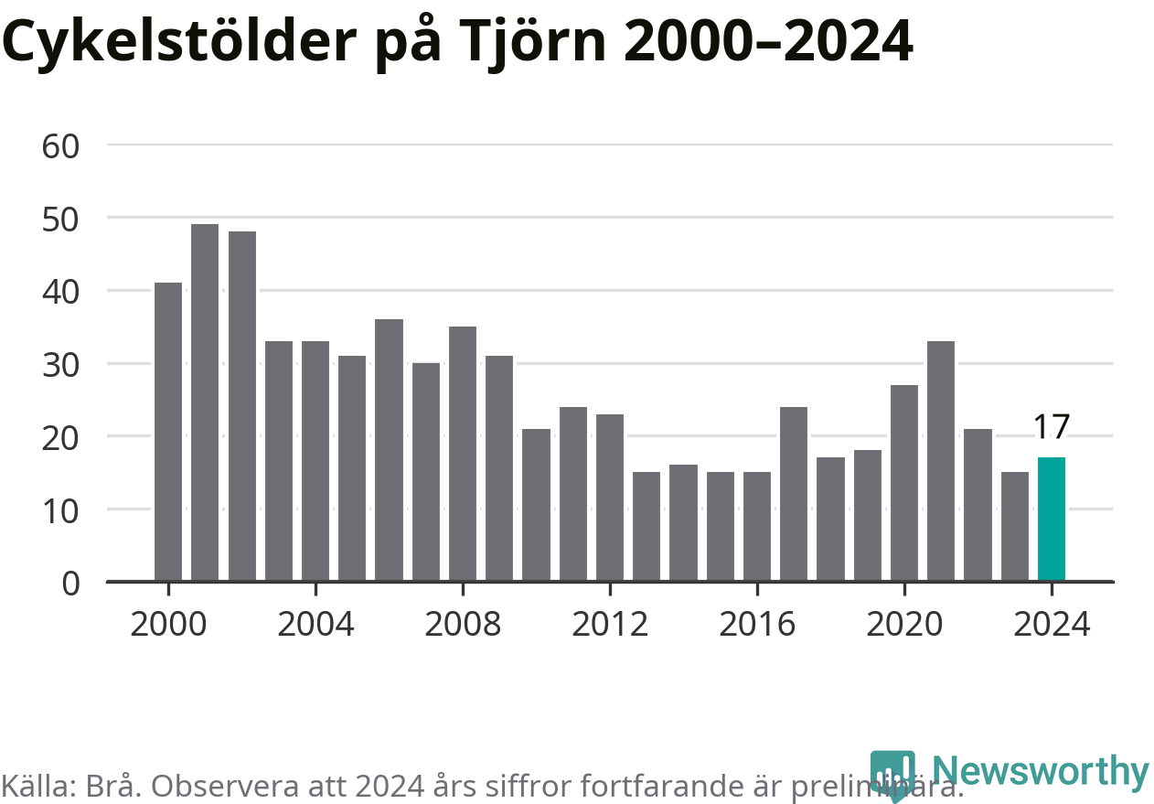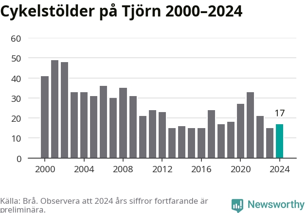Tjörn är inte särskilt drabbat. 2024 gjordes 17 anmälningar om cykelstölder i kommunen, enligt siffror från Brottsförebyggande rådet, vilket motsvarar 1,1 anmälningar per 1 000 invånare. Det kan jämföras med 7,4 cyklar per 1 000 invånare i Lidköping, som hade flest cykelstölder per invånare i Västra Götaland.