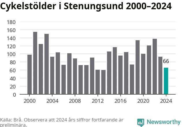 I Stenungsunds kommun var antalet cykelstölder relativt få i en historisk kontext år 2024, även om det fortfarande är preliminära siffror. Under de senaste 25 åren har det som mest anmälts 155 cykelstölder på ett år (2001), som minst 60 stycken (2013).