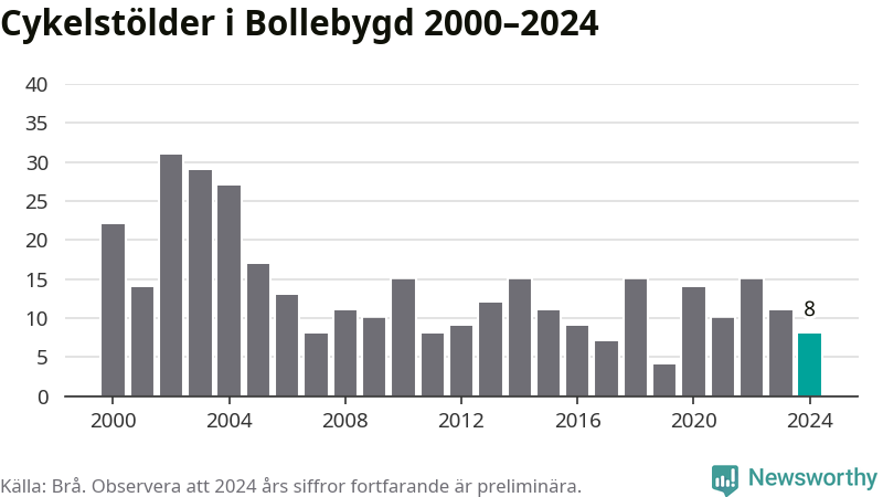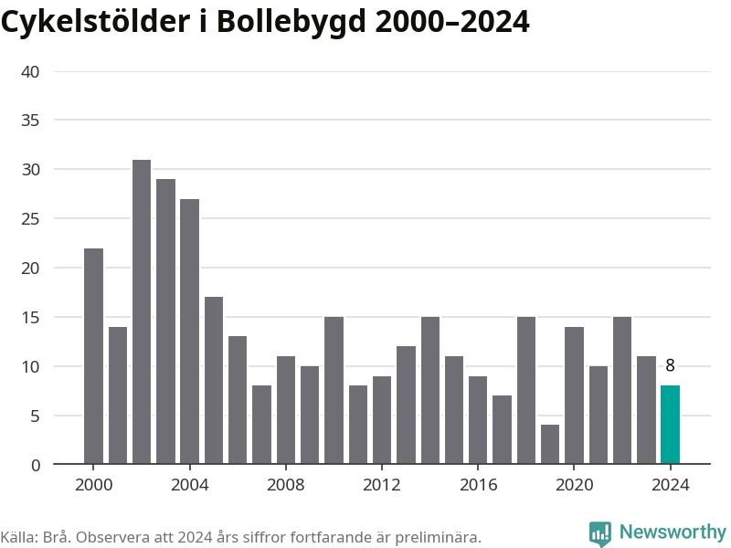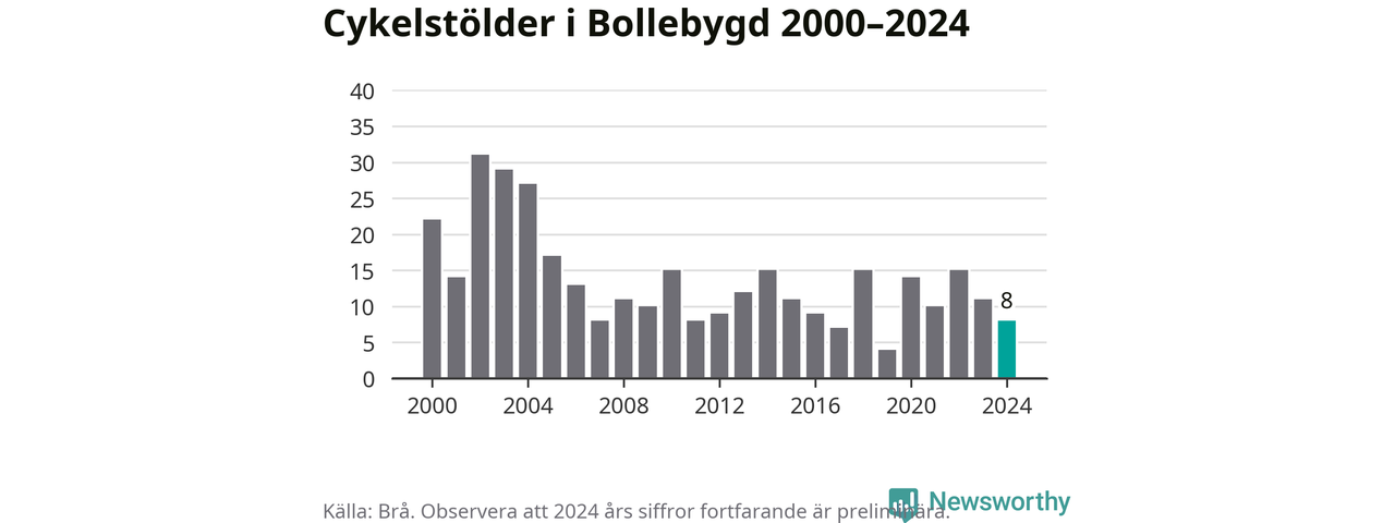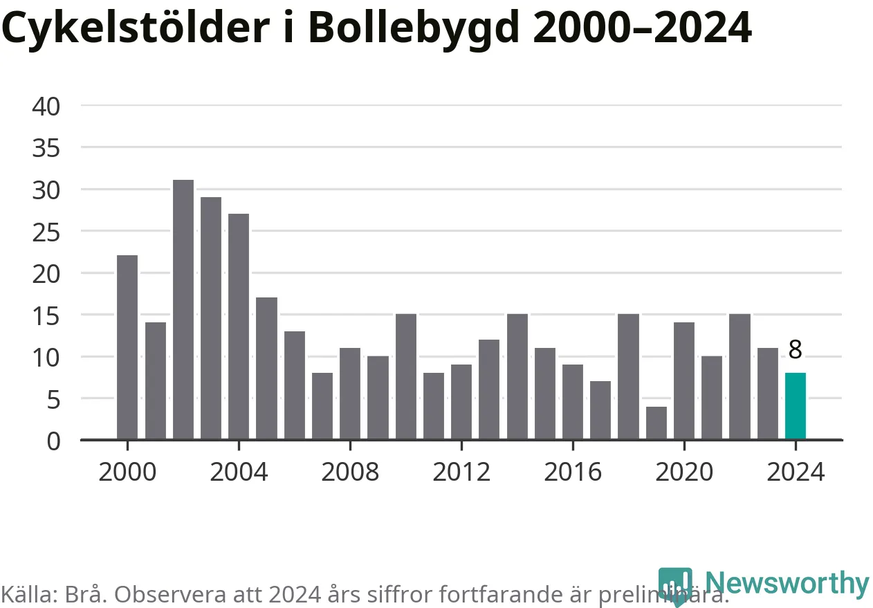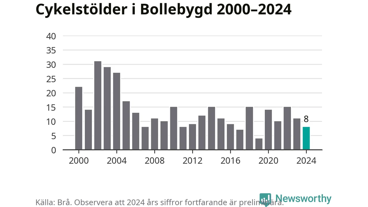 Bollebygd är inte särskilt drabbat. 2024 gjordes åtta anmälningar om cykelstölder i kommunen, enligt siffror från Brottsförebyggande rådet, vilket motsvarar 0,8 anmälningar per 1 000 invånare. Det kan jämföras med 7,4 cyklar per 1 000 invånare i Lidköping, som hade flest cykelstölder per invånare i Västra Götaland.