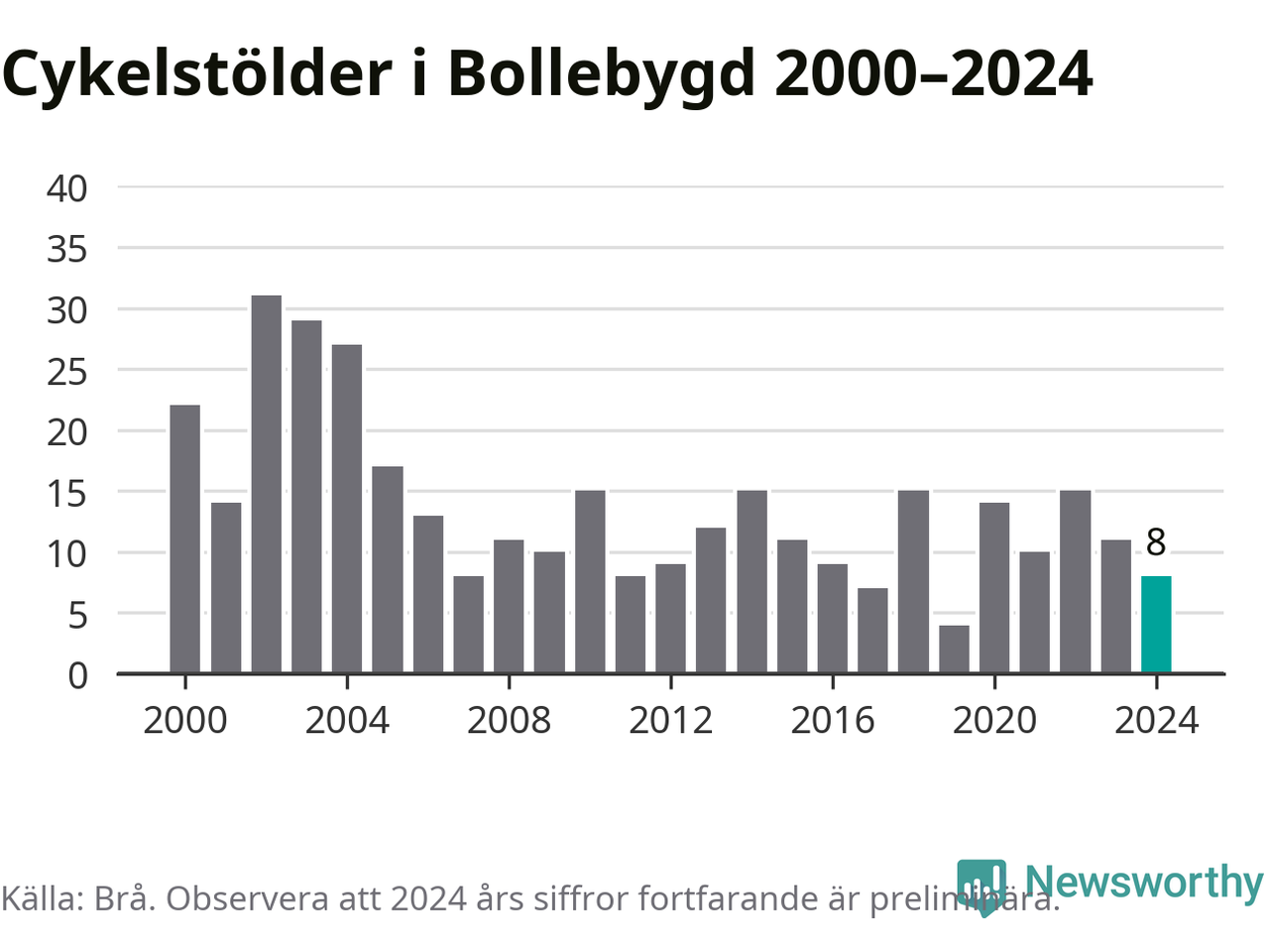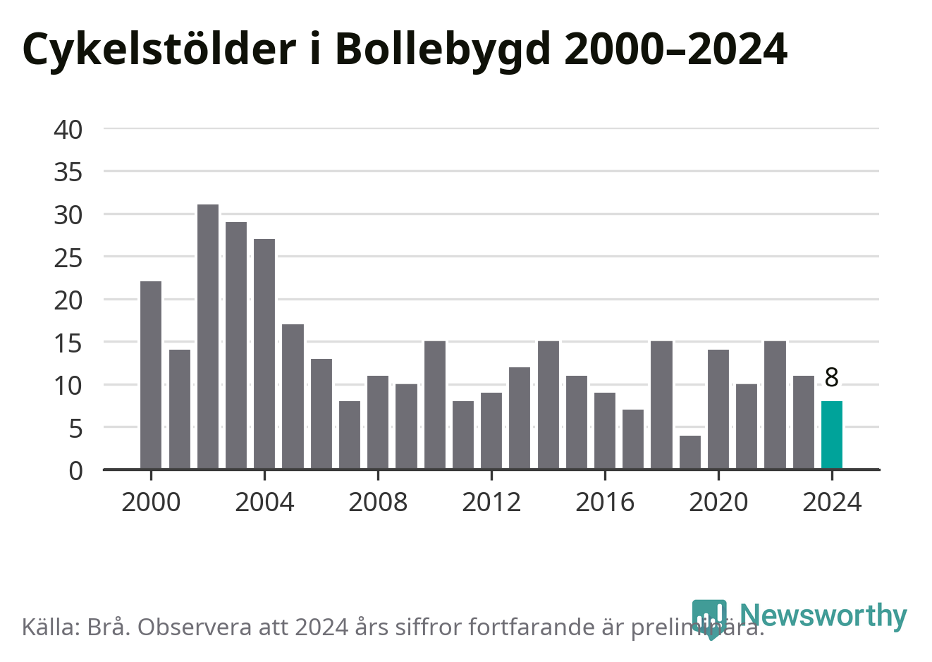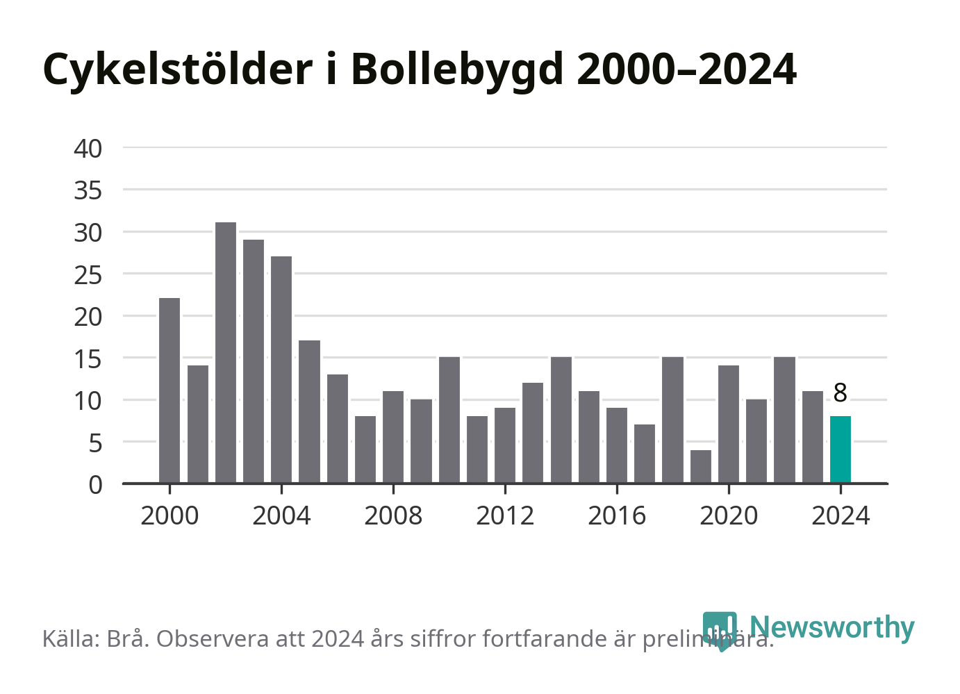 Bollebygd är inte särskilt drabbat. 2024 gjordes åtta anmälningar om cykelstölder i kommunen, enligt siffror från Brottsförebyggande rådet, vilket motsvarar 0,8 anmälningar per 1 000 invånare. Det kan jämföras med 7,4 cyklar per 1 000 invånare i Lidköping, som hade flest cykelstölder per invånare i Västra Götaland.