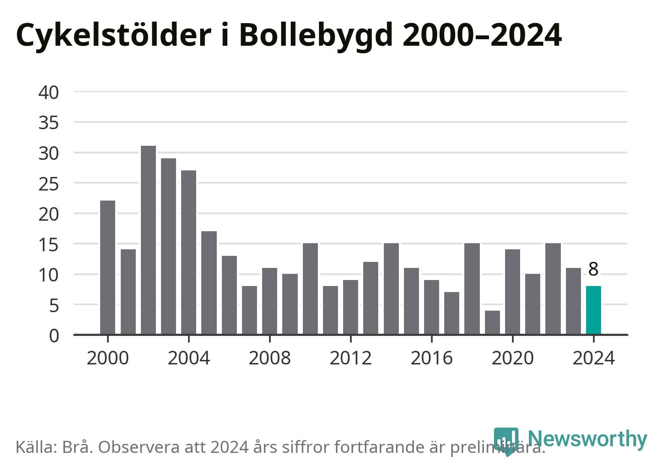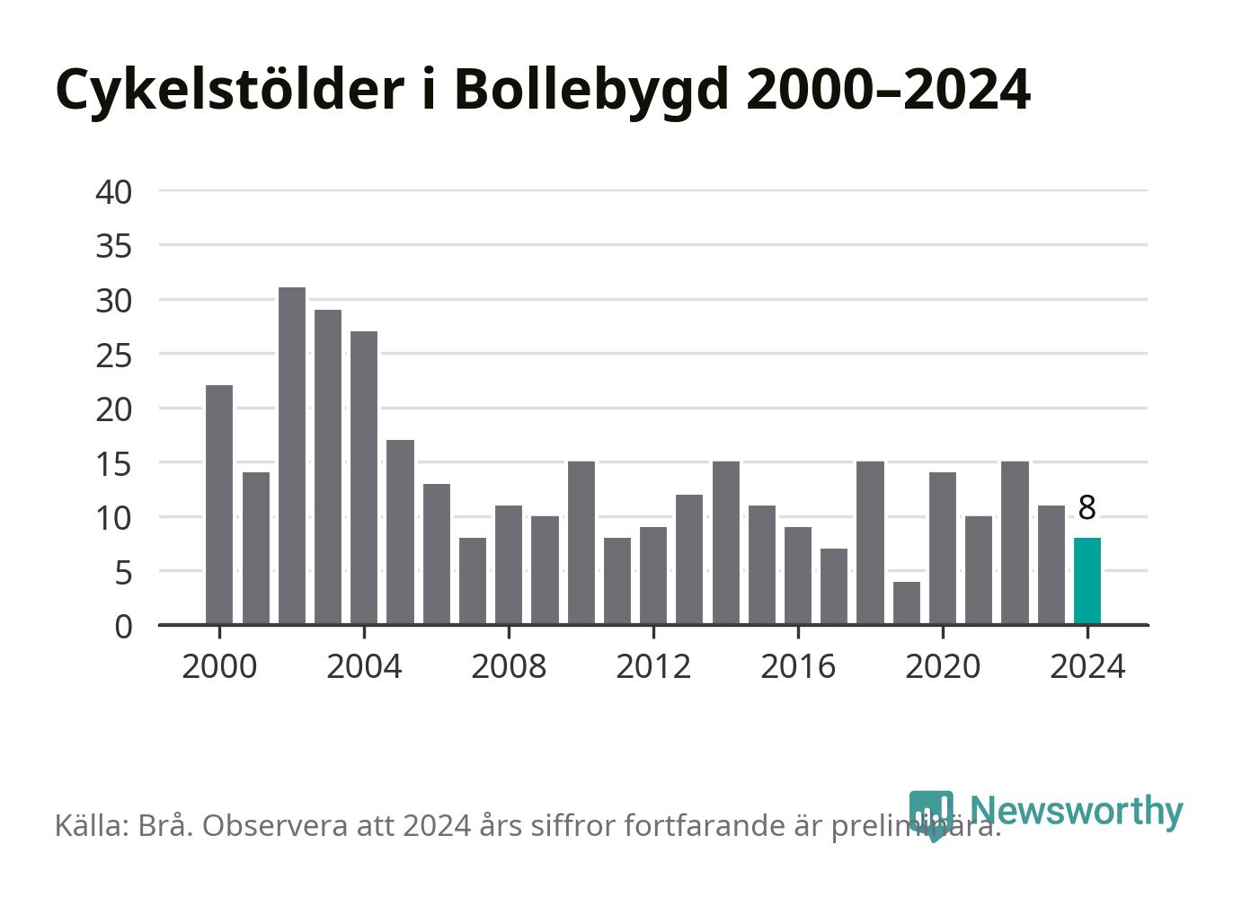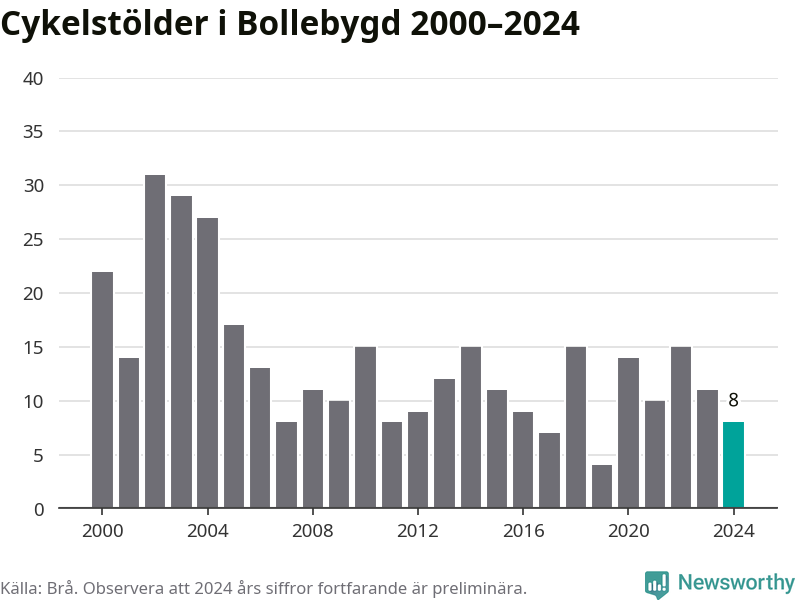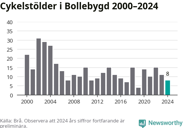 I Bollebygds kommun var antalet cykelstölder relativt få i en historisk kontext år 2024, även om det fortfarande är preliminära siffror. Under de senaste 25 åren har det som mest anmälts 31 cykelstölder på ett år (2002), som minst 4 stycken (2019).