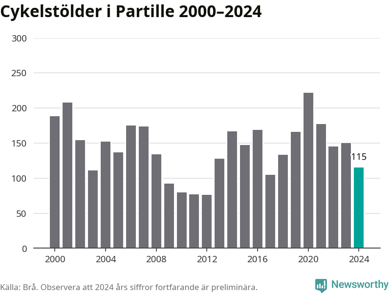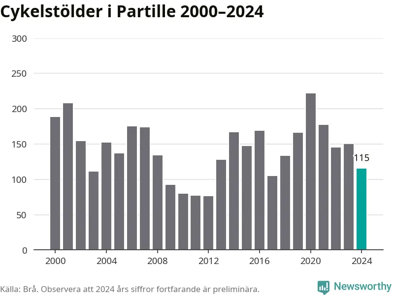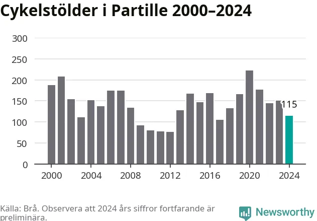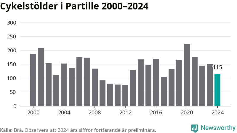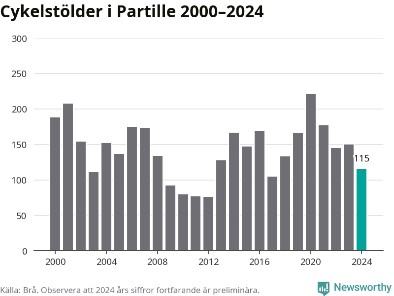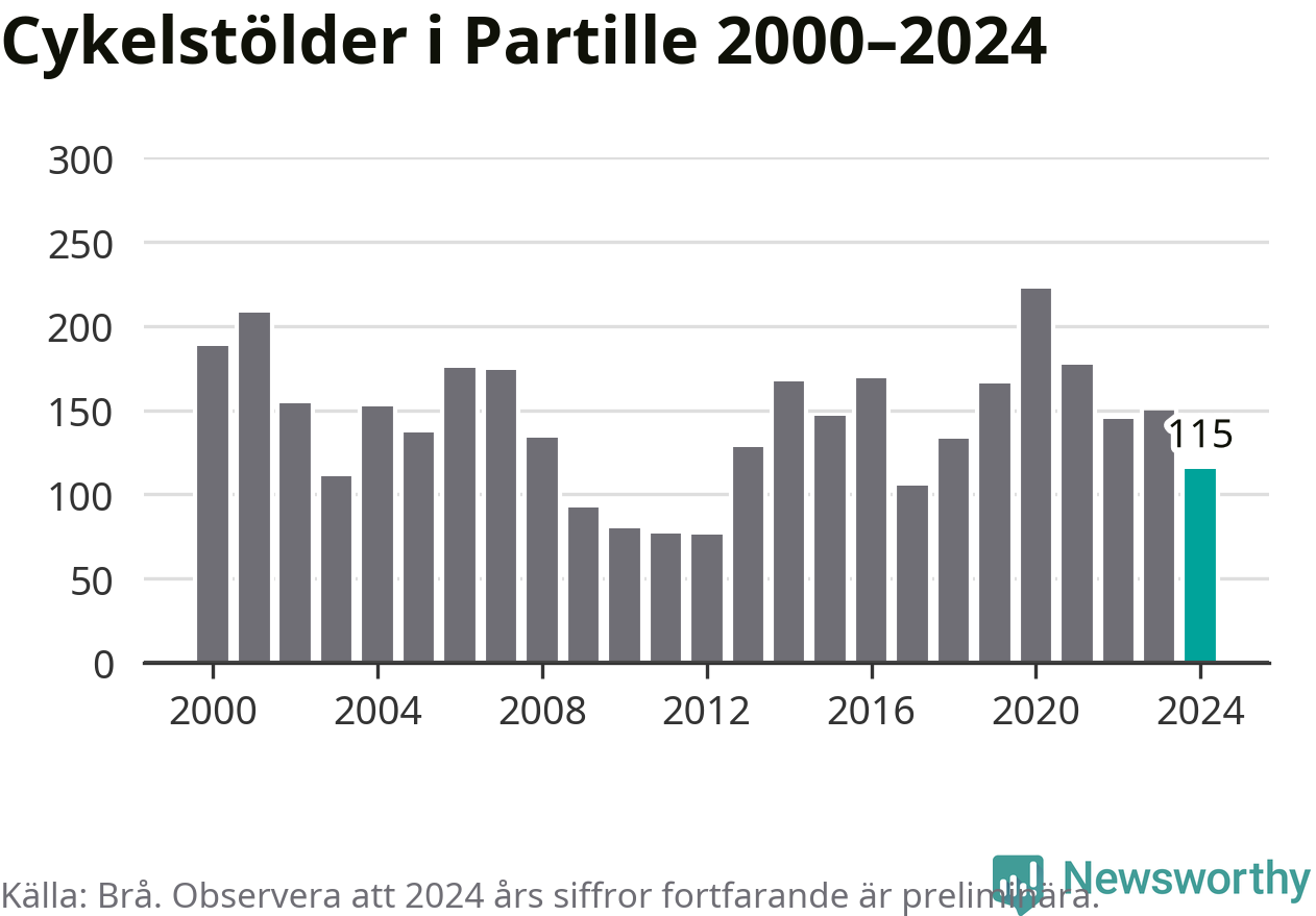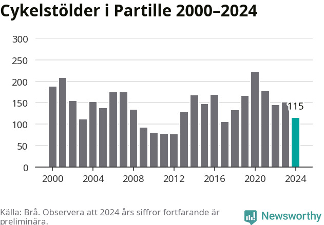 I Partille kommun sticker antalet cykelstölder 2024 inte ut i en historisk kontext. Under de senaste 25 åren har det som mest anmälts 222 cykelstölder på ett år (2020), som minst 76 stycken (2012).