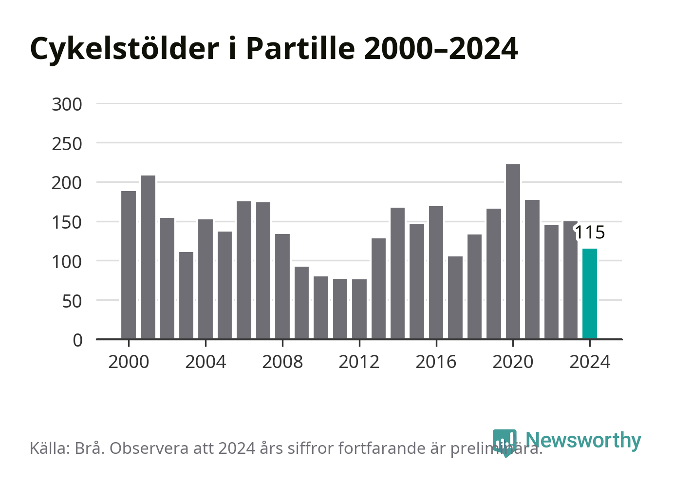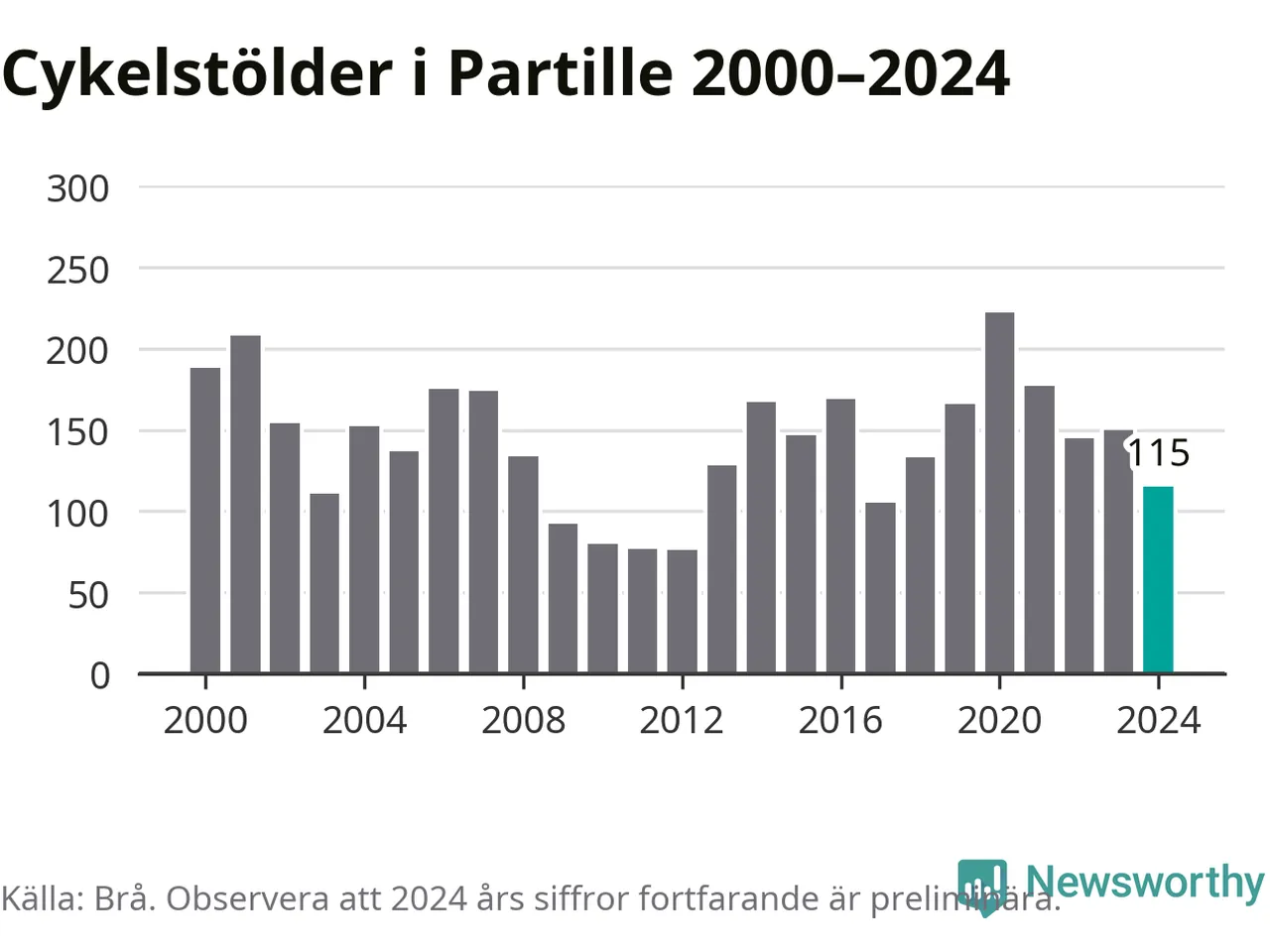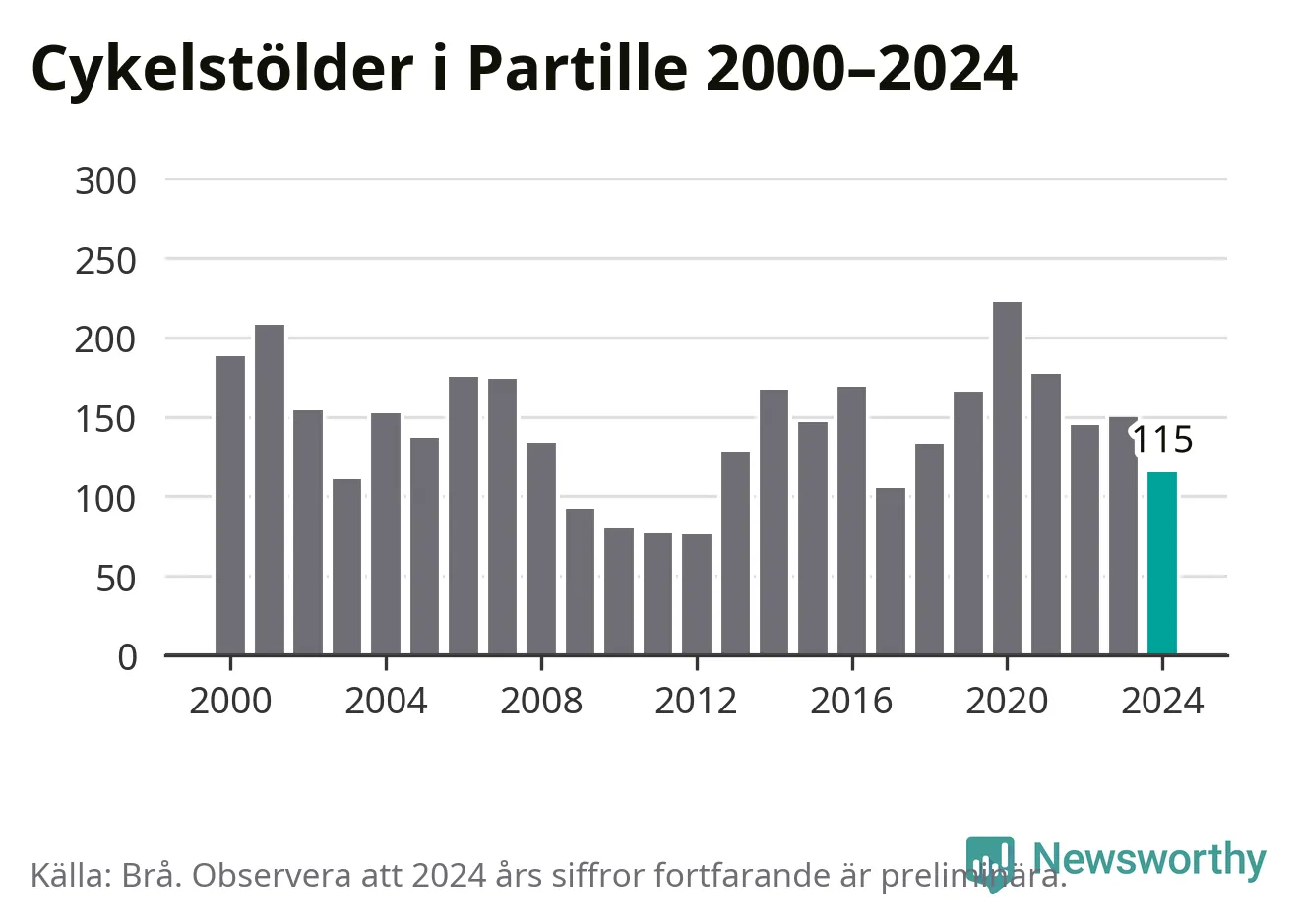 I Partille kommun sticker antalet cykelstölder 2024 inte ut i en historisk kontext. Under de senaste 25 åren har det som mest anmälts 222 cykelstölder på ett år (2020), som minst 76 stycken (2012).