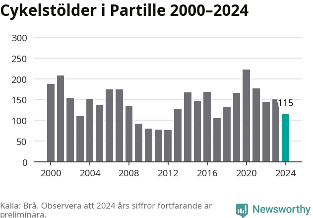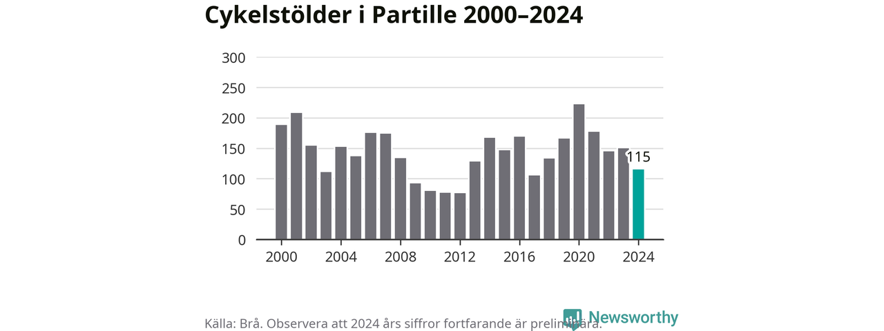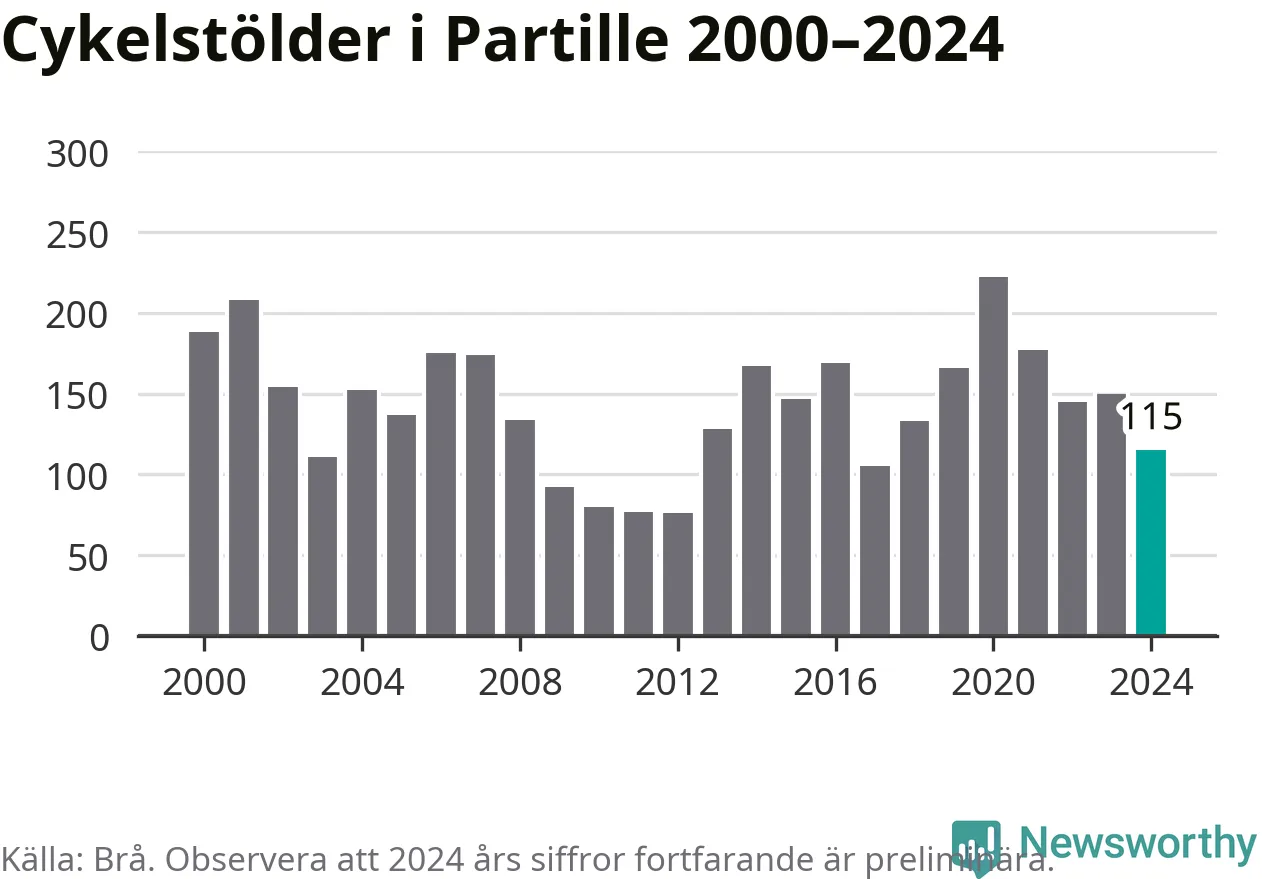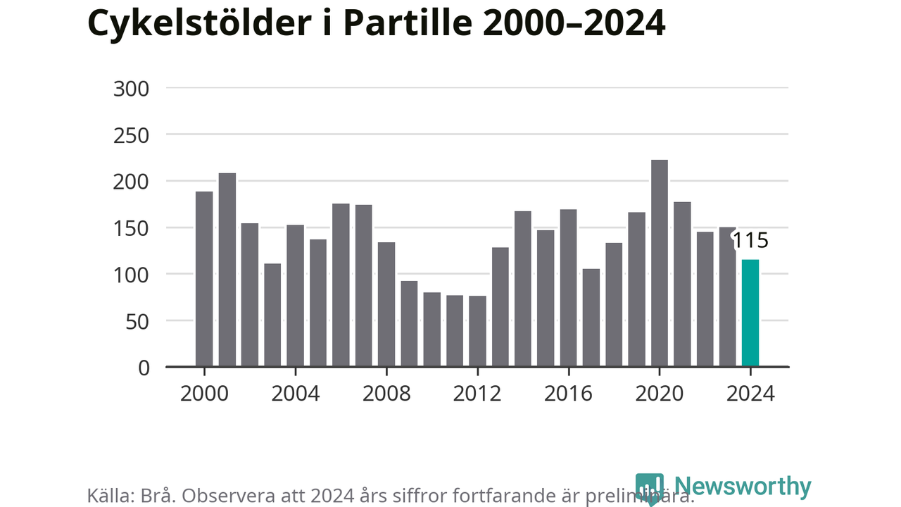 Partille är inte särskilt drabbat. 2024 gjordes 115 anmälningar om cykelstölder i kommunen, enligt siffror från Brottsförebyggande rådet, vilket motsvarar 2,8 anmälningar per 1 000 invånare. Det kan jämföras med 7,4 cyklar per 1 000 invånare i Lidköping, som hade flest cykelstölder per invånare i Västra Götaland.