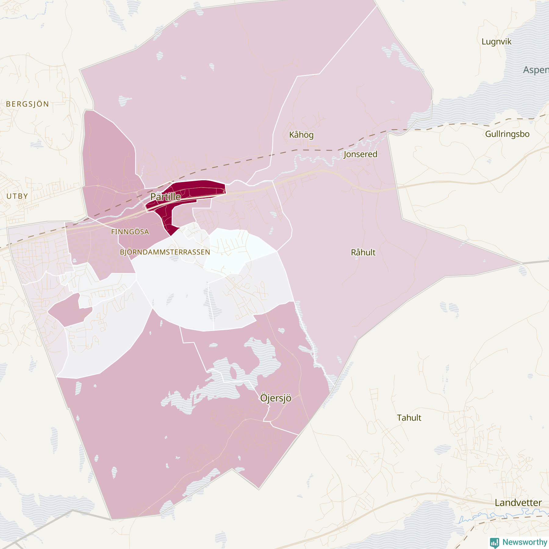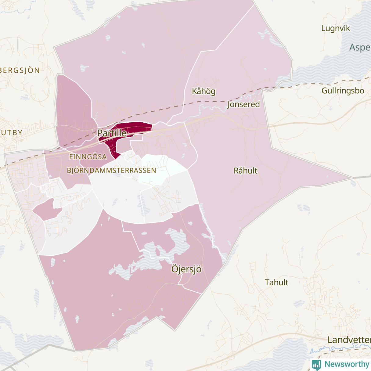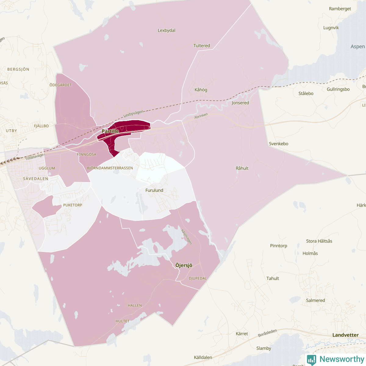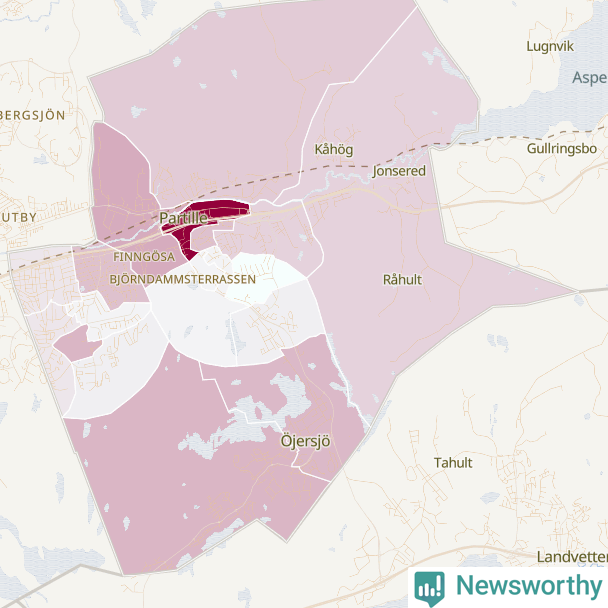 Men alla delar av Partille är inte lika hårt drabbade. Det visar data för de senaste fem åren, som Newsworthy begärt ut från polisen. De anmälda stölderna har kopplats till SCB:s 18 statistiska områden i kommunen. Det rör sig om mellan en handfull och drygt 100 anmälda stölder per område.