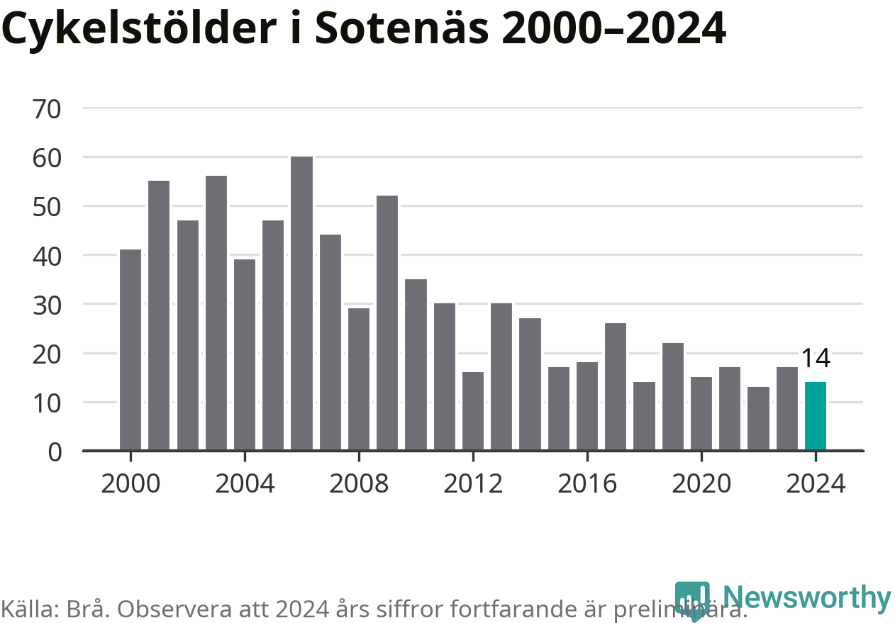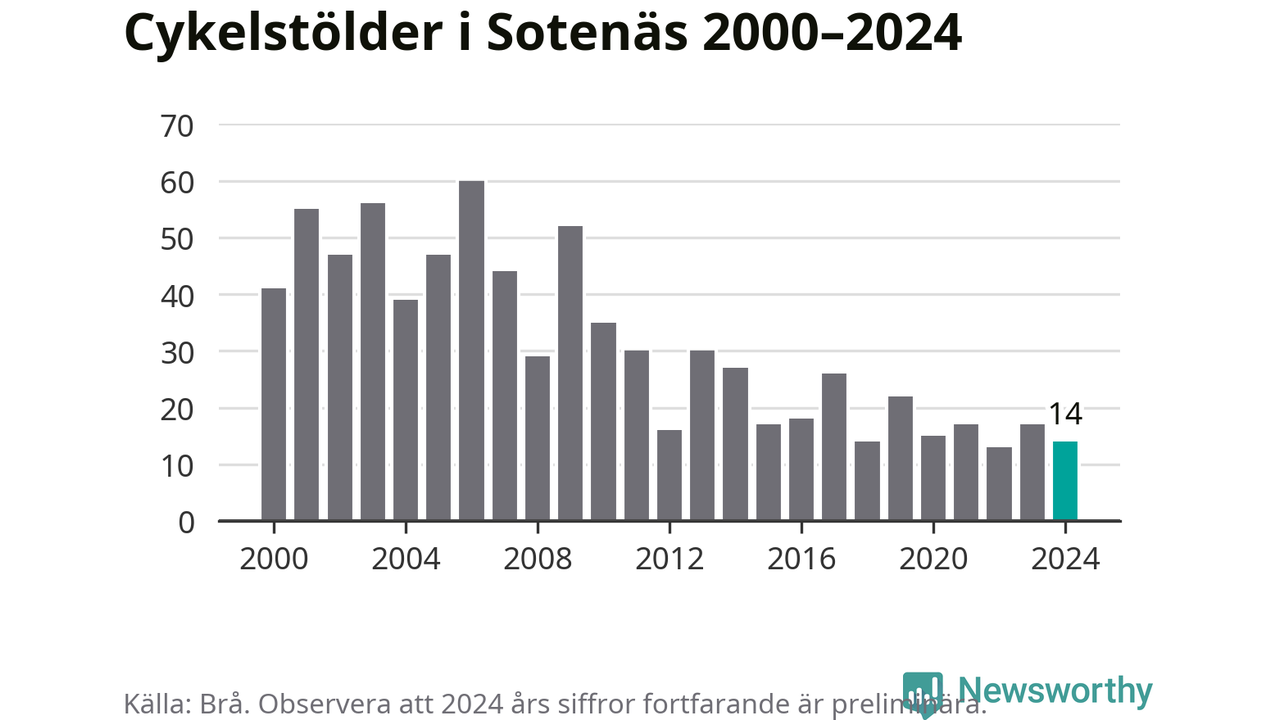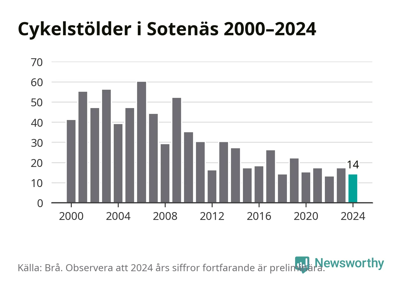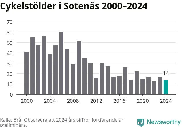 I Sotenäs kommun var antalet cykelstölder relativt få i en historisk kontext år 2024, även om det fortfarande är preliminära siffror. Under de senaste 25 åren har det som mest anmälts 60 cykelstölder på ett år (2006), som minst 13 stycken (2022).
