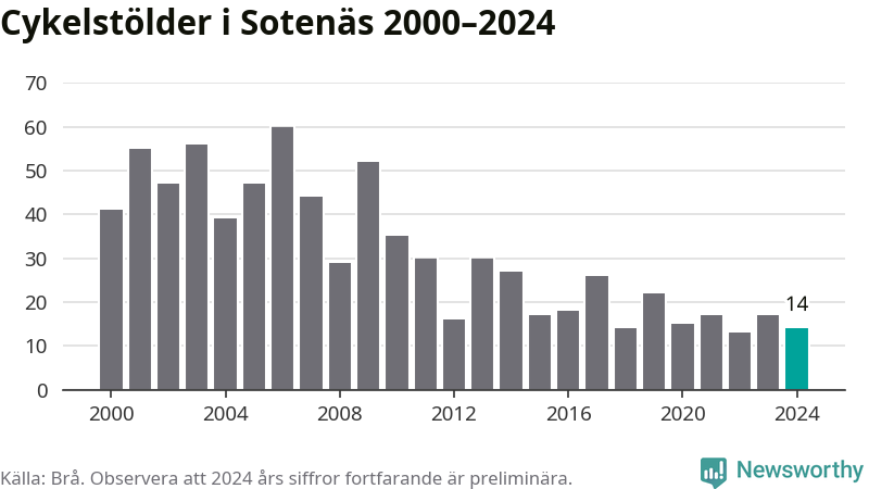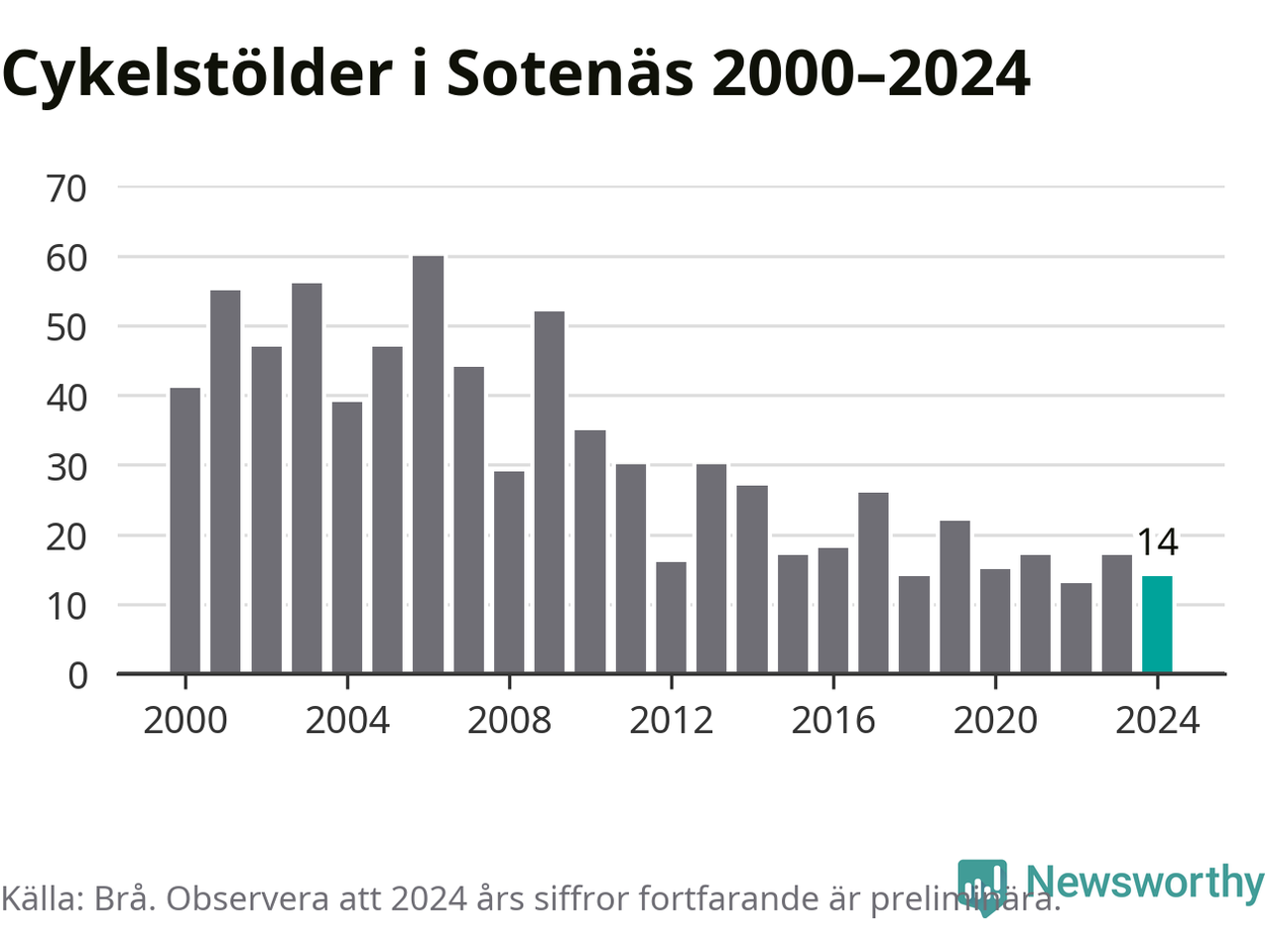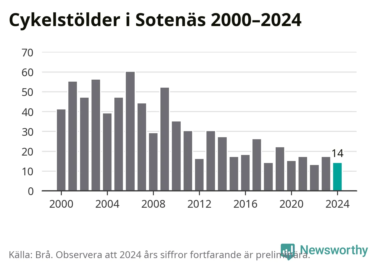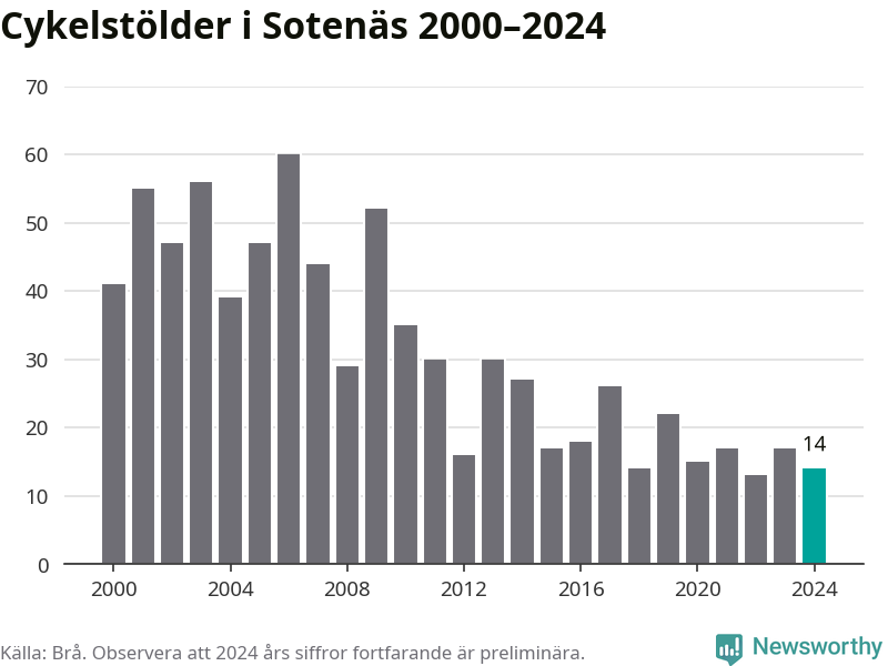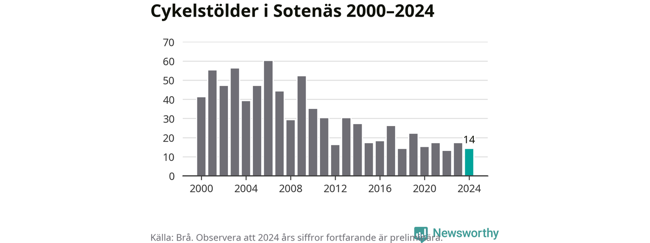 I Sotenäs kommun var antalet cykelstölder relativt få i en historisk kontext år 2024, även om det fortfarande är preliminära siffror. Under de senaste 25 åren har det som mest anmälts 60 cykelstölder på ett år (2006), som minst 13 stycken (2022).