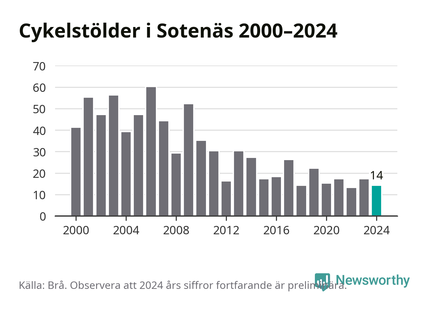 Sotenäs är inte särskilt drabbat. 2024 gjordes 14 anmälningar om cykelstölder i kommunen, enligt siffror från Brottsförebyggande rådet, vilket motsvarar 1,5 anmälningar per 1 000 invånare. Det kan jämföras med 7,4 cyklar per 1 000 invånare i Lidköping, som hade flest cykelstölder per invånare i Västra Götaland.