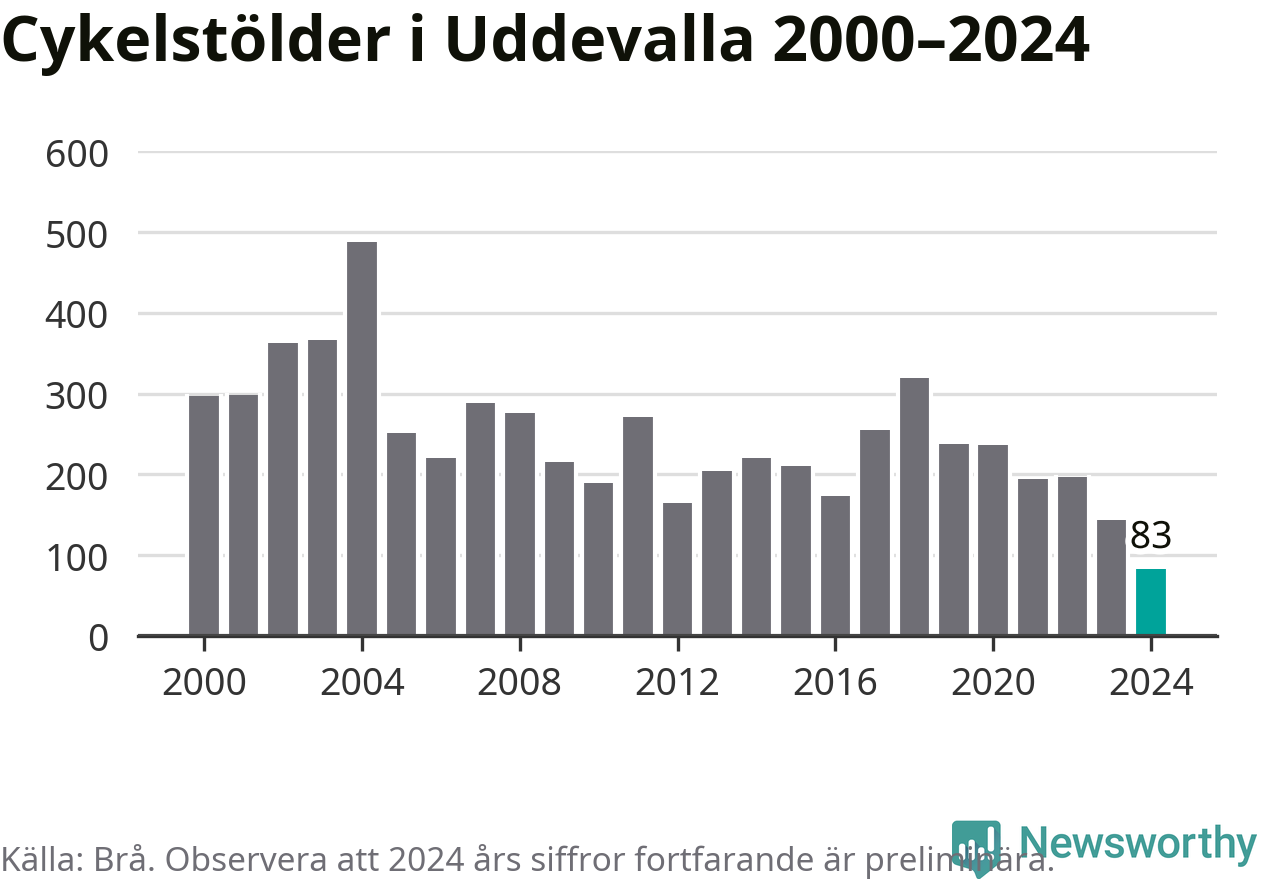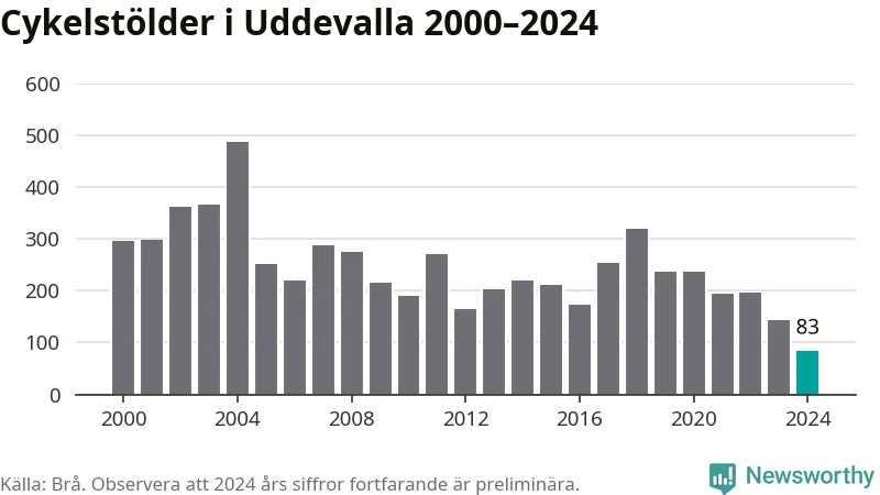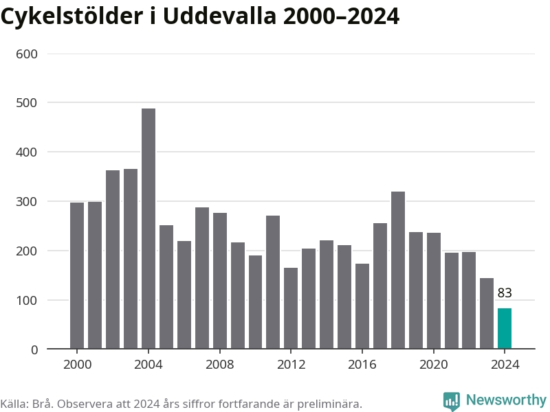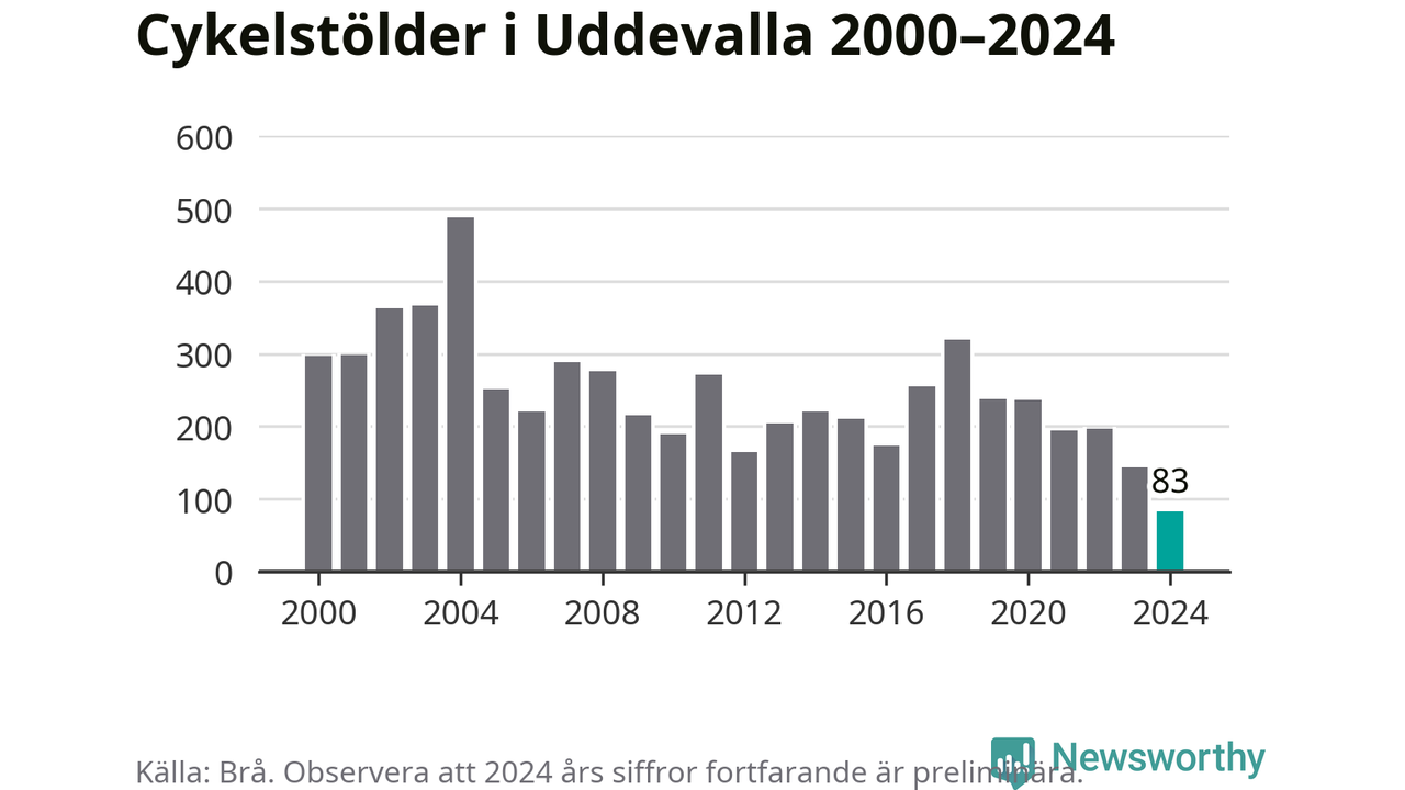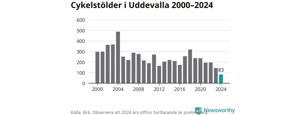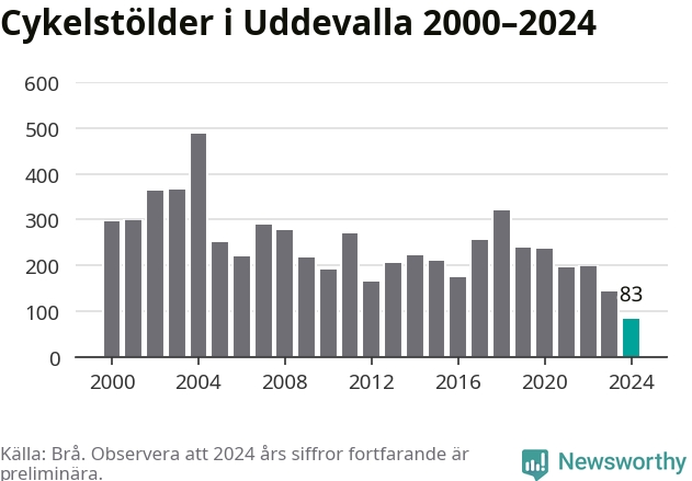 I Uddevalla kommun noterades det lägsta antalet cykelstölder under hela 2000-talet år 2024, även om det fortfarande är preliminära siffror. Under de senaste 25 åren har det som mest anmälts 488 cykelstölder på ett år (2004).