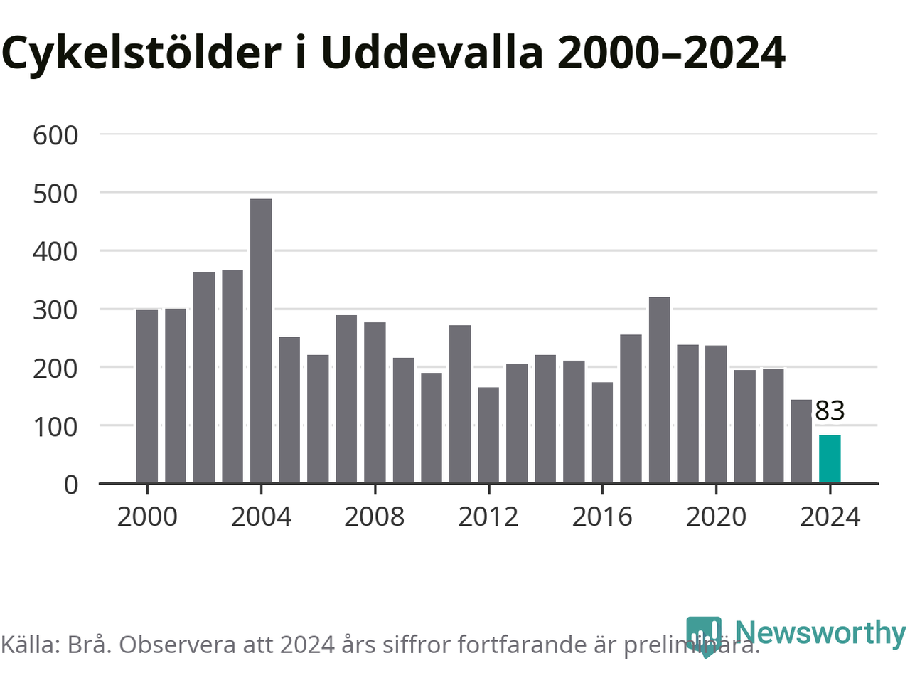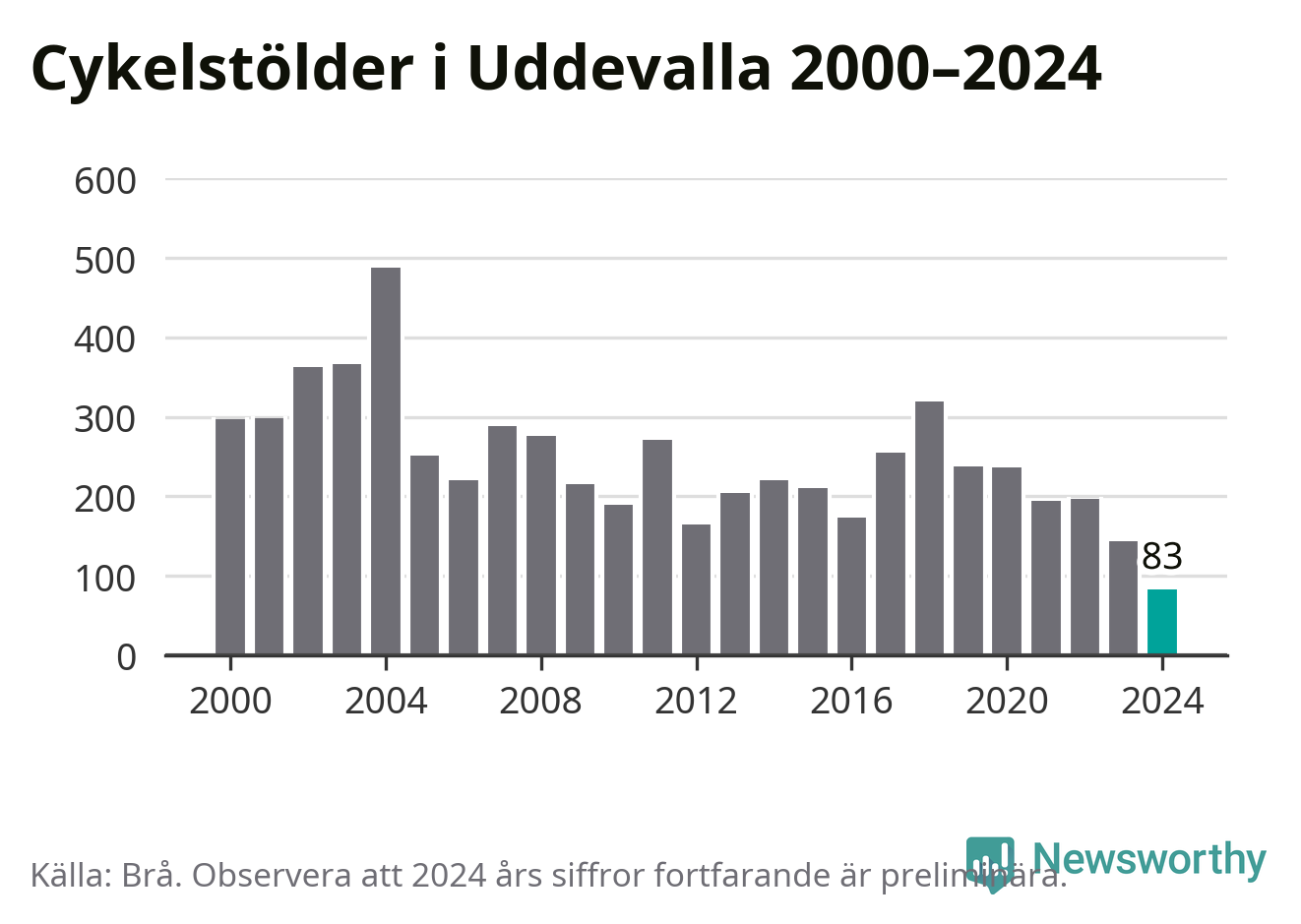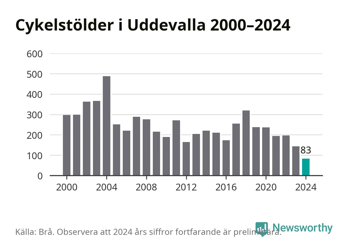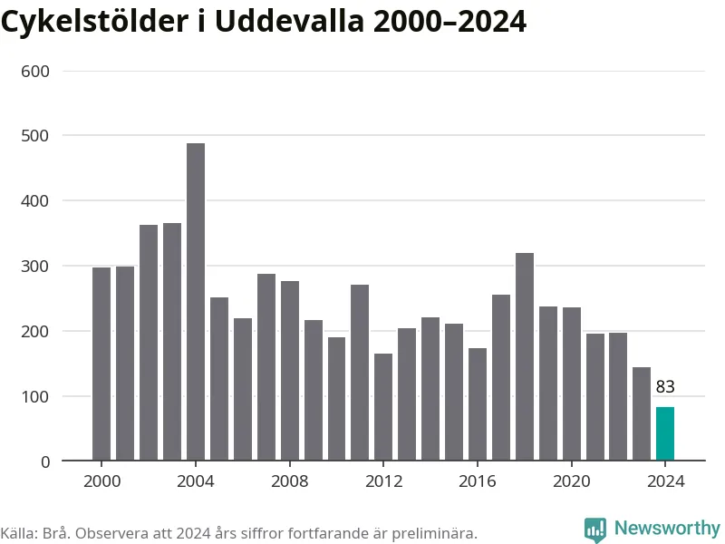 I Uddevalla kommun noterades det lägsta antalet cykelstölder under hela 2000-talet år 2024, även om det fortfarande är preliminära siffror. Under de senaste 25 åren har det som mest anmälts 488 cykelstölder på ett år (2004).