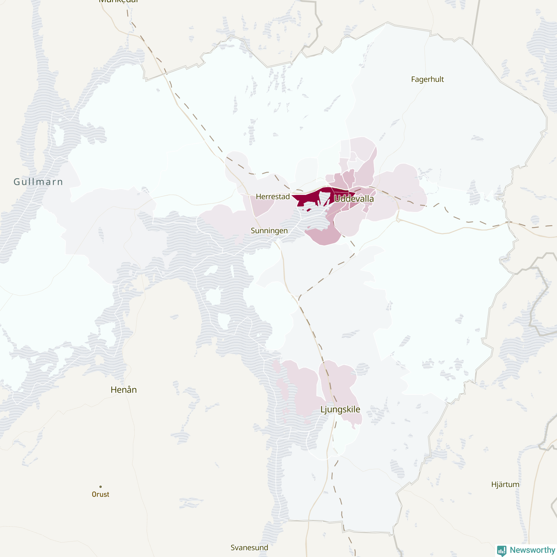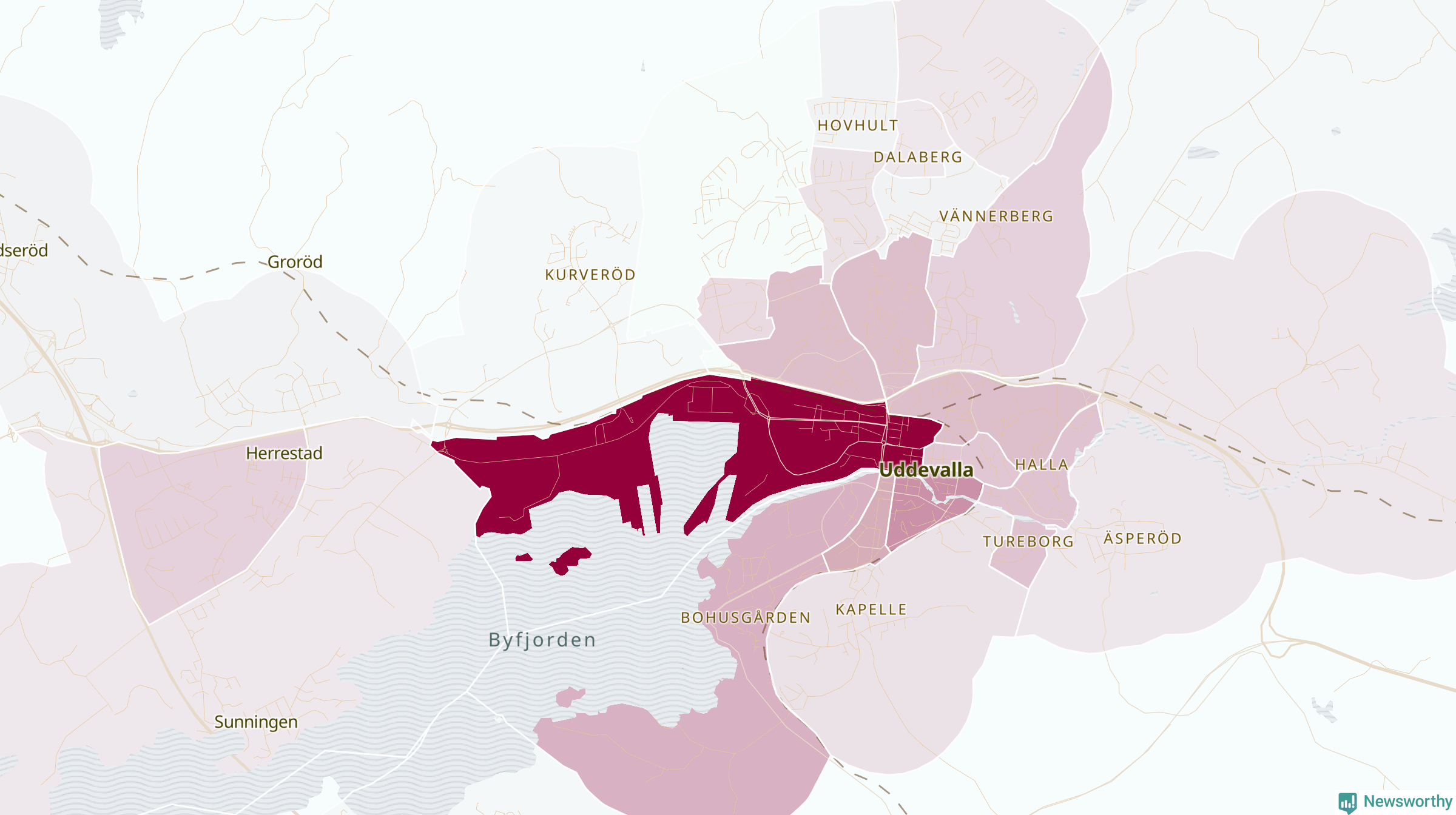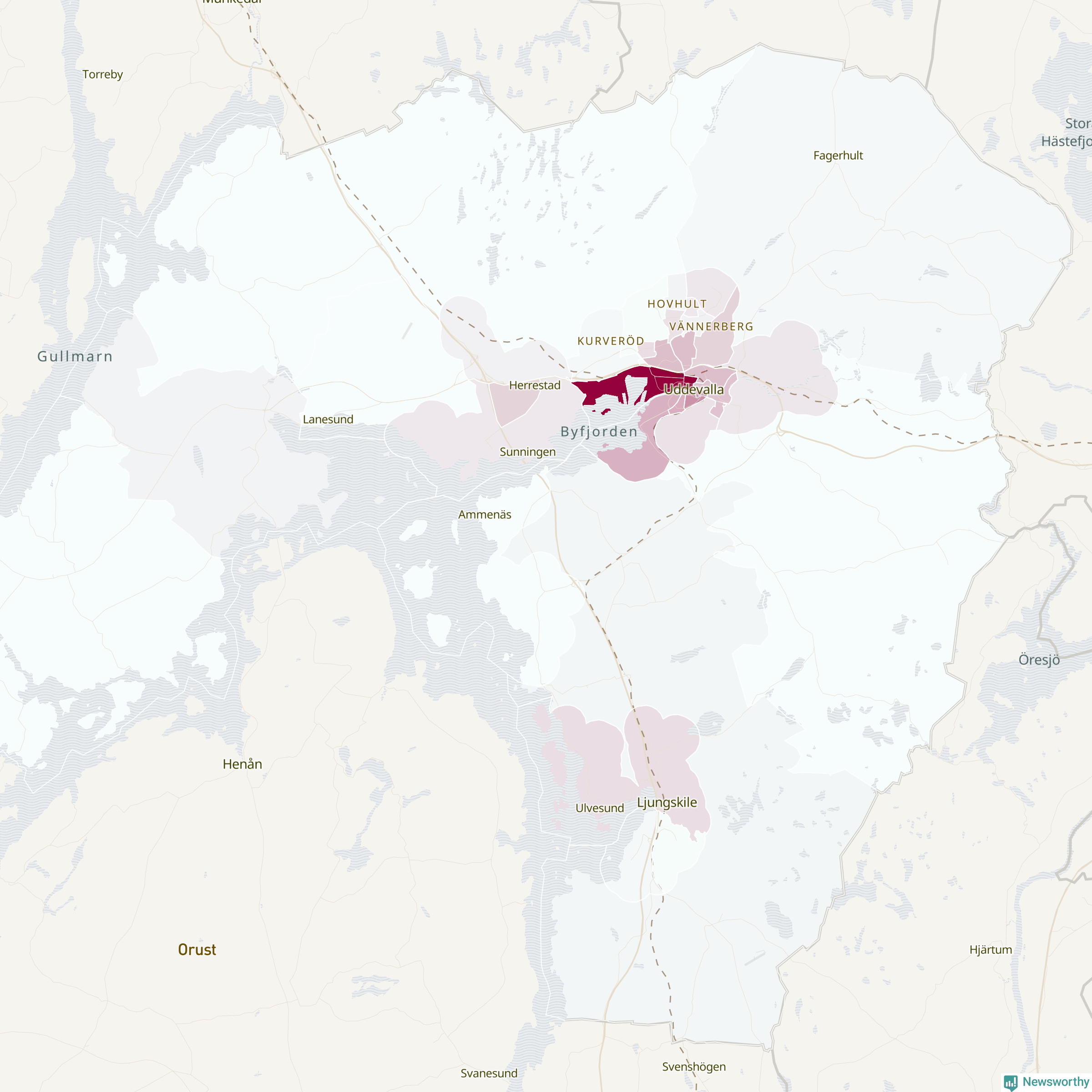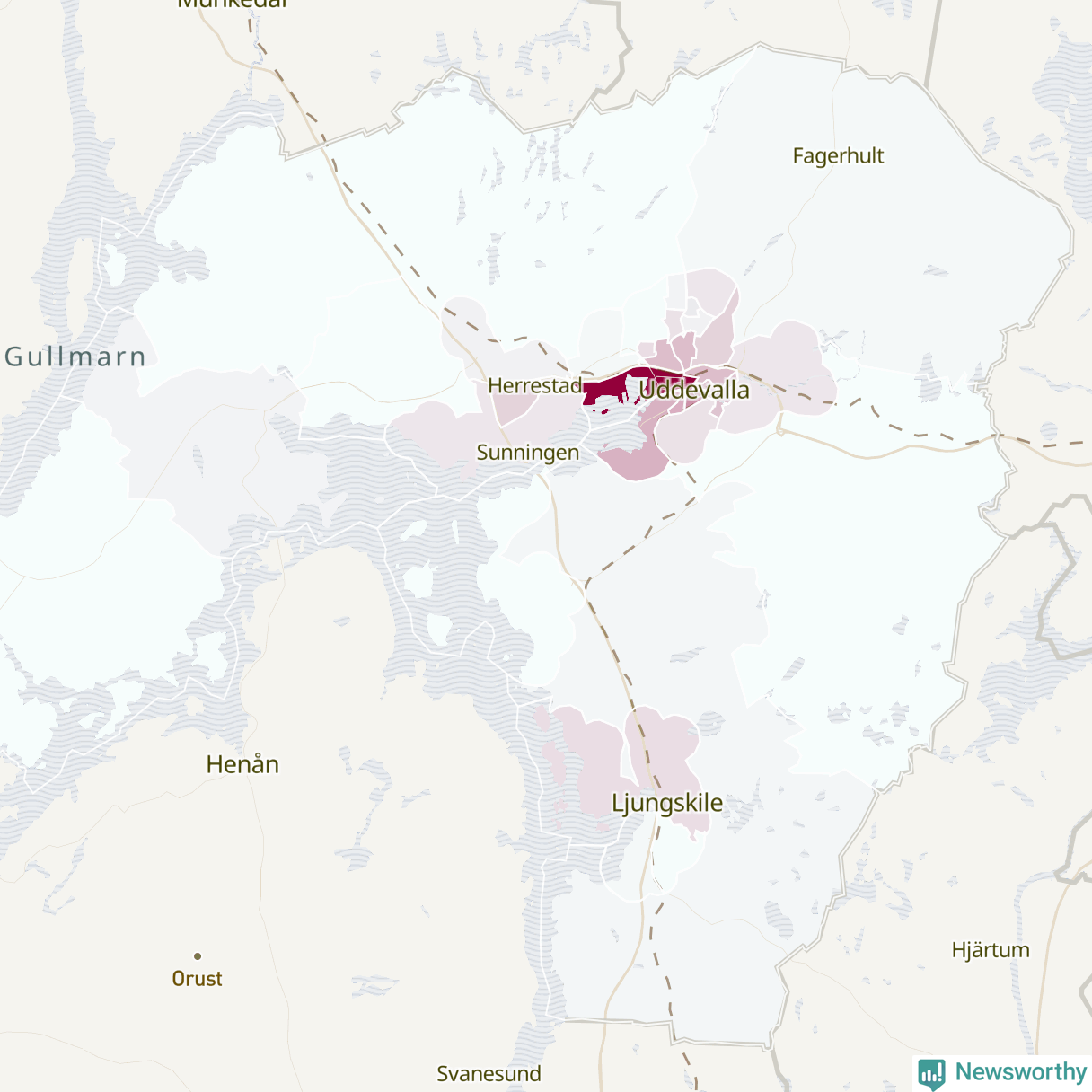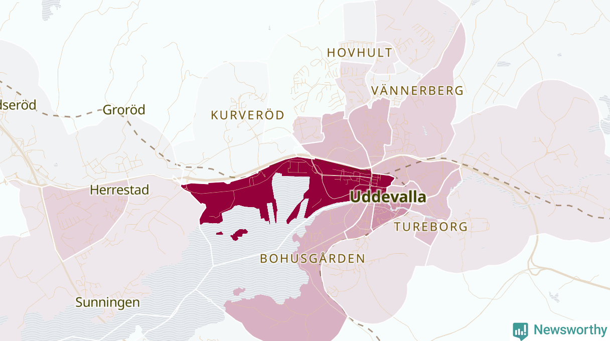 Men alla delar av Uddevalla är inte lika hårt drabbade. Det visar data för de senaste fem åren, som Newsworthy begärt ut från polisen. De anmälda stölderna har kopplats till SCB:s 34 statistiska områden i kommunen. Det rör sig om mellan en handfull och drygt 100 anmälda stölder per område.