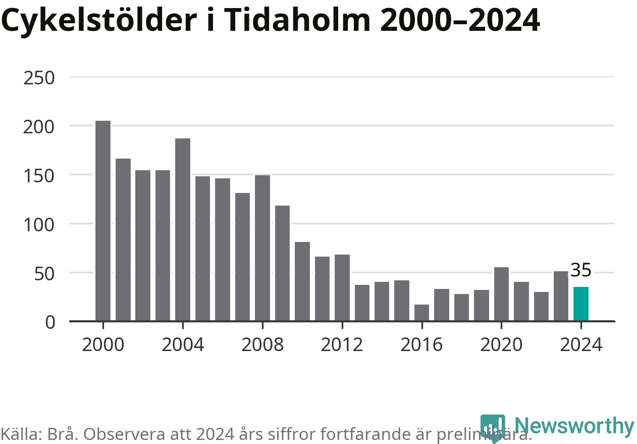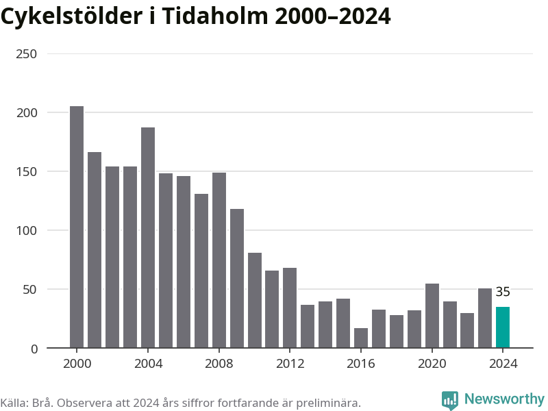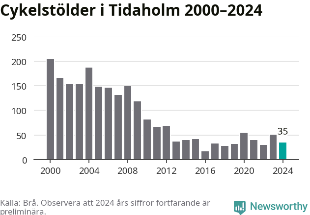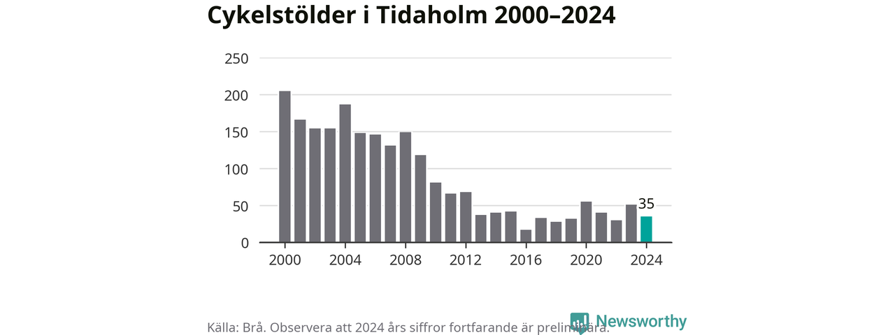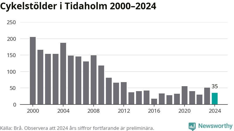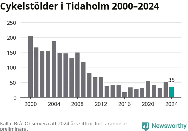 I Tidaholms kommun var antalet cykelstölder relativt få i en historisk kontext år 2024, även om det fortfarande är preliminära siffror. Under de senaste 25 åren har det som mest anmälts 205 cykelstölder på ett år (2000), som minst 17 stycken (2016).