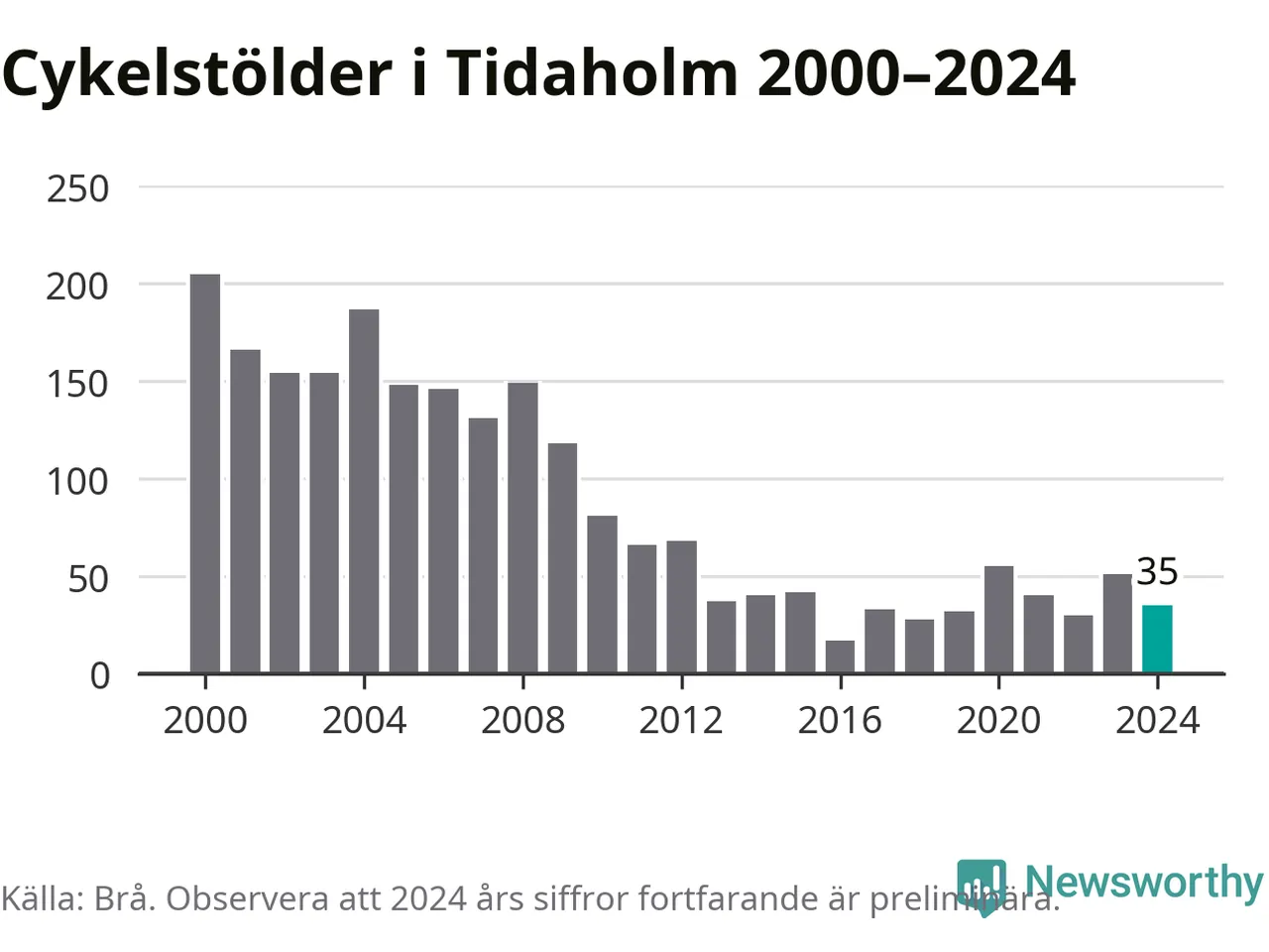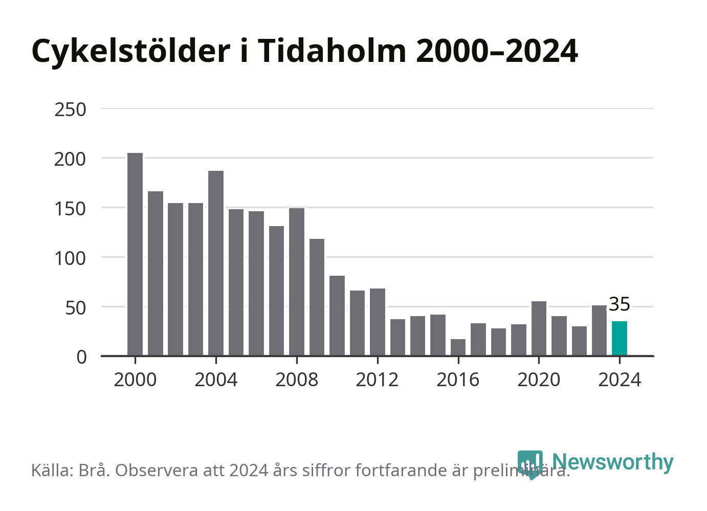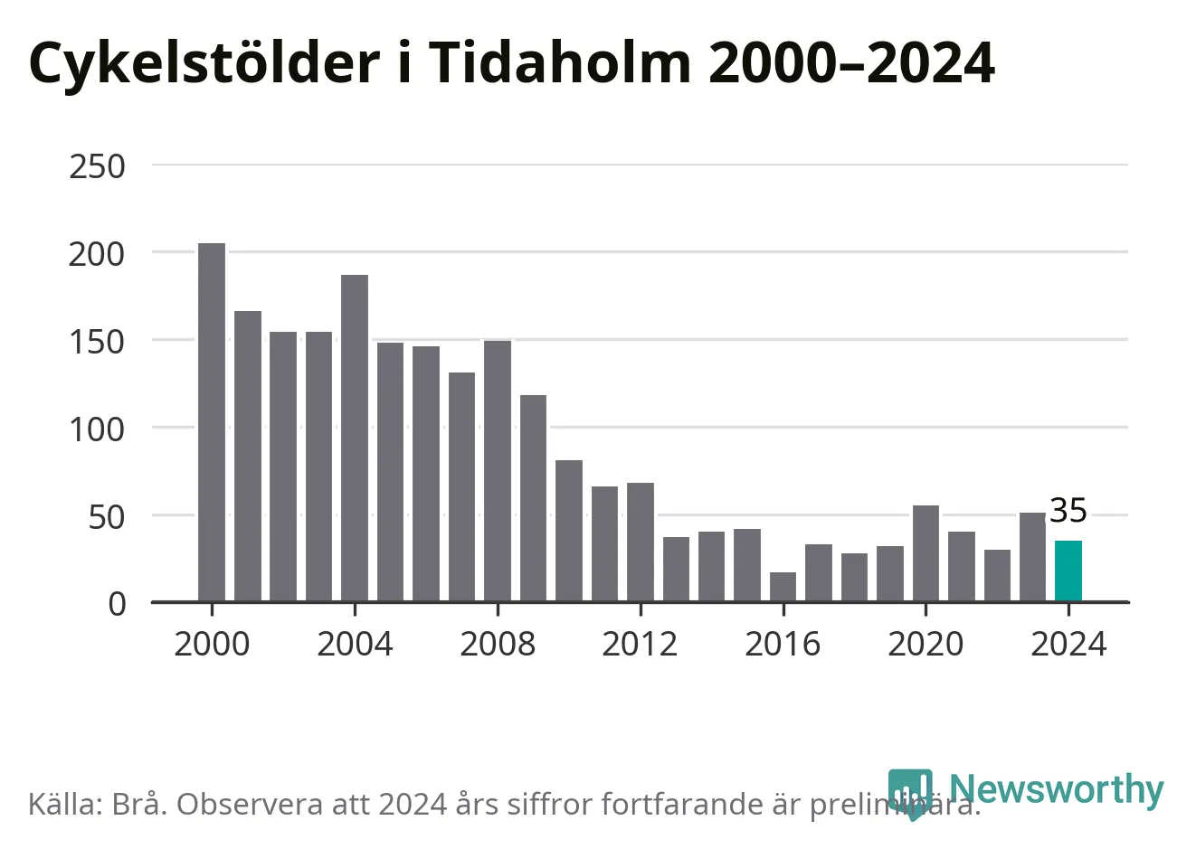 I Tidaholms kommun var antalet cykelstölder relativt få i en historisk kontext år 2024, även om det fortfarande är preliminära siffror. Under de senaste 25 åren har det som mest anmälts 205 cykelstölder på ett år (2000), som minst 17 stycken (2016).
