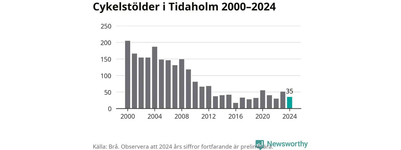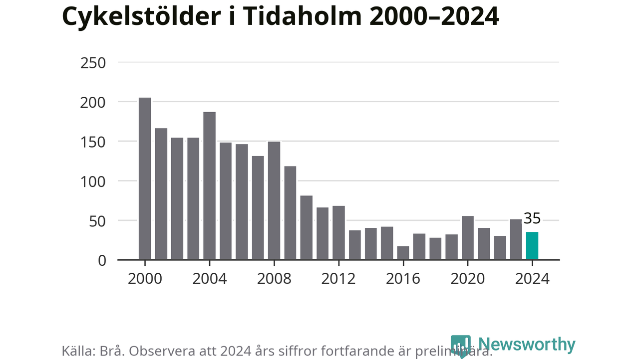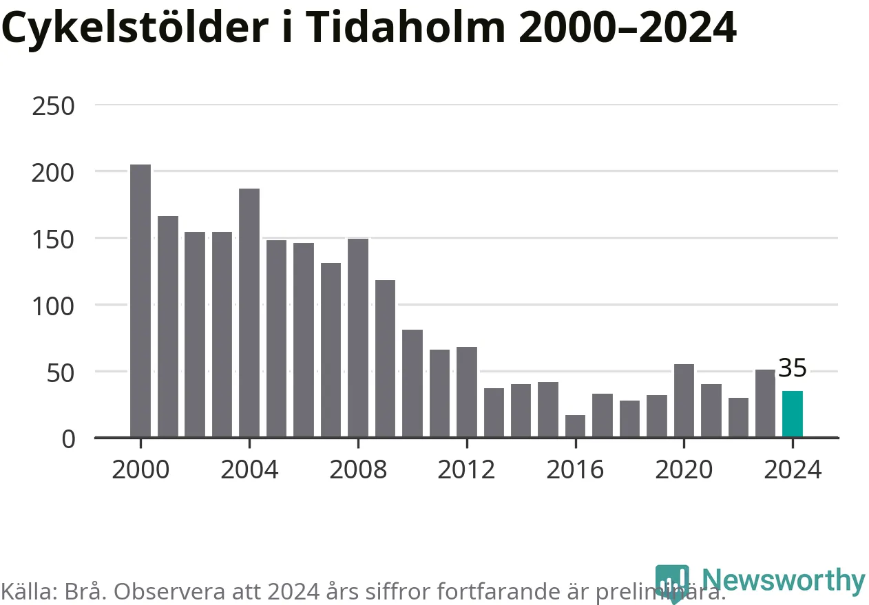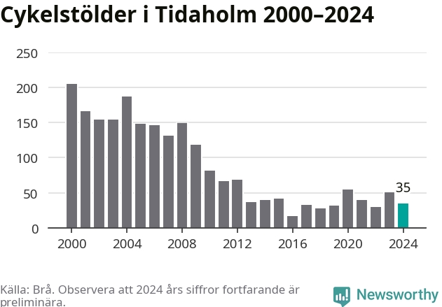 Tidaholm är inte särskilt drabbat. 2024 gjordes 35 anmälningar om cykelstölder i kommunen, enligt siffror från Brottsförebyggande rådet, vilket motsvarar 2,7 anmälningar per 1 000 invånare. Det kan jämföras med 7,4 cyklar per 1 000 invånare i Lidköping, som hade flest cykelstölder per invånare i Västra Götaland.