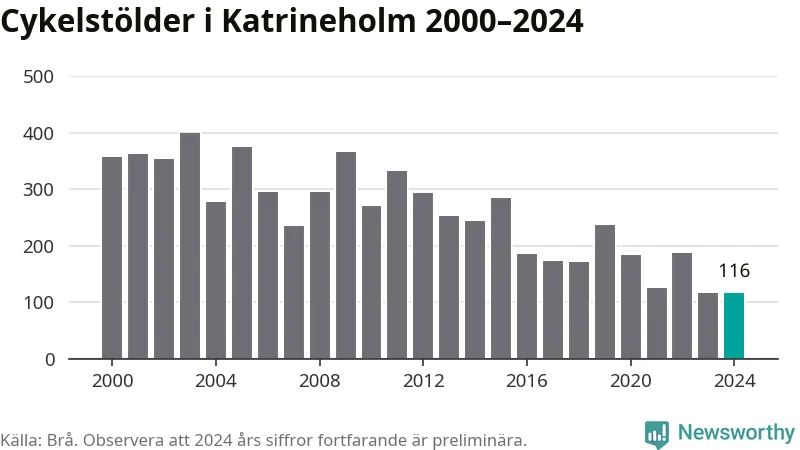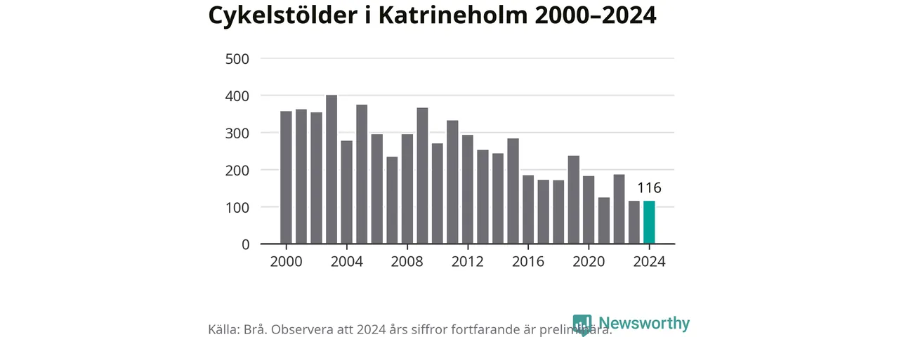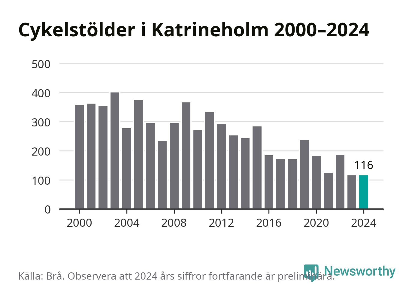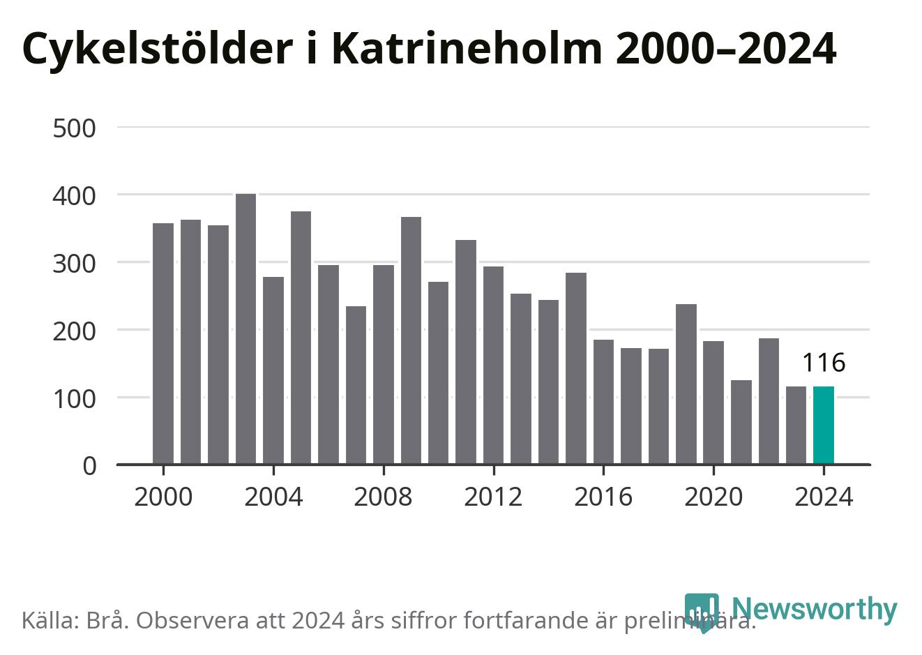 I Katrineholms kommun noterades det lägsta antalet cykelstölder under hela 2000-talet år 2024, även om det fortfarande är preliminära siffror. Under de senaste 25 åren har det som mest anmälts 400 cykelstölder på ett år (2003).