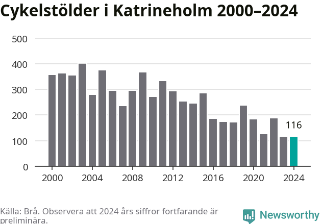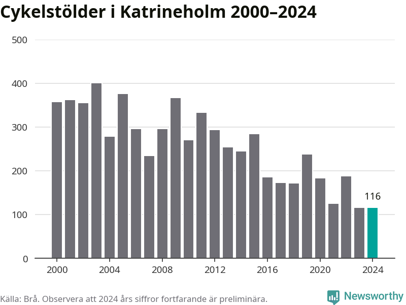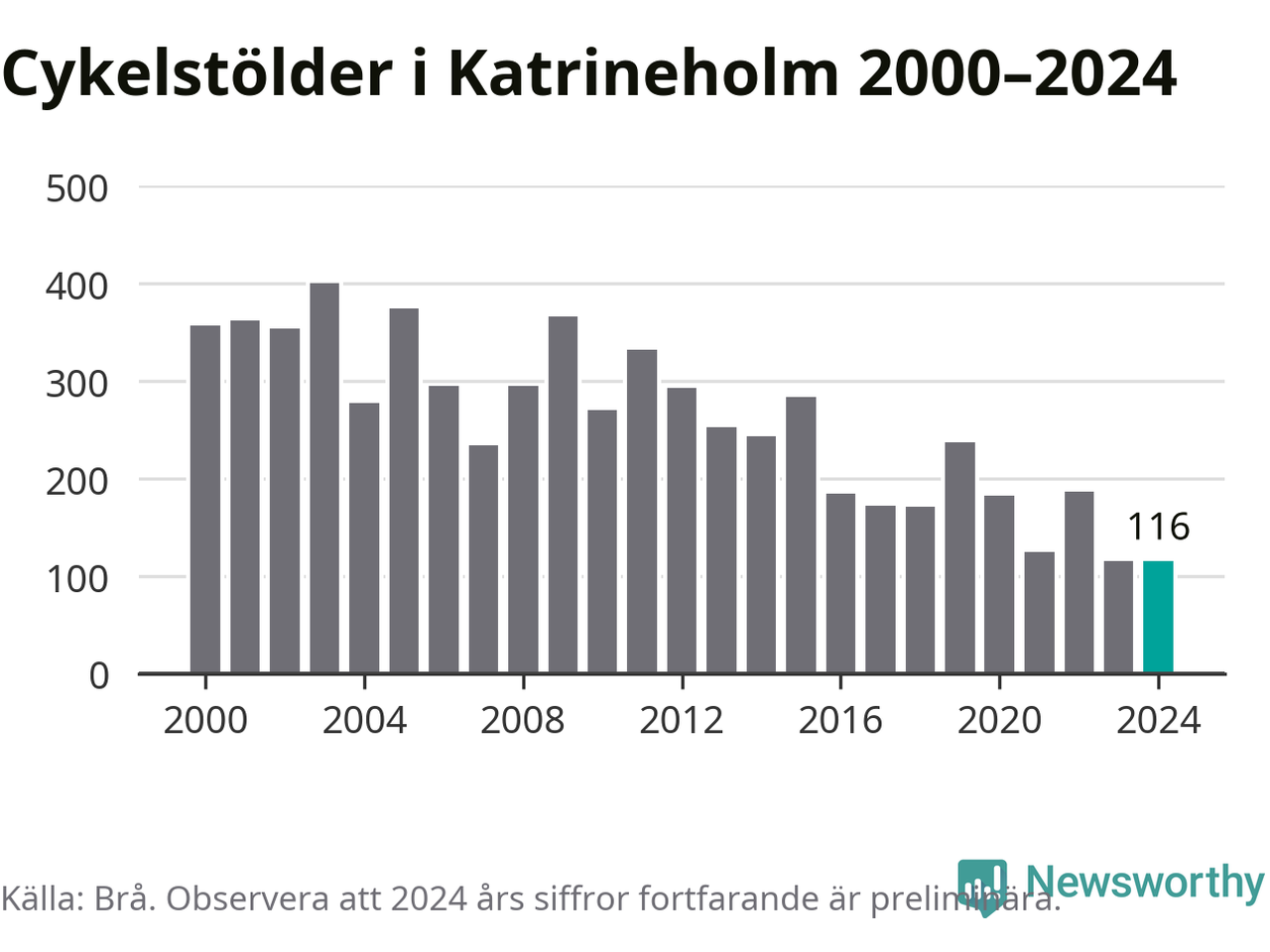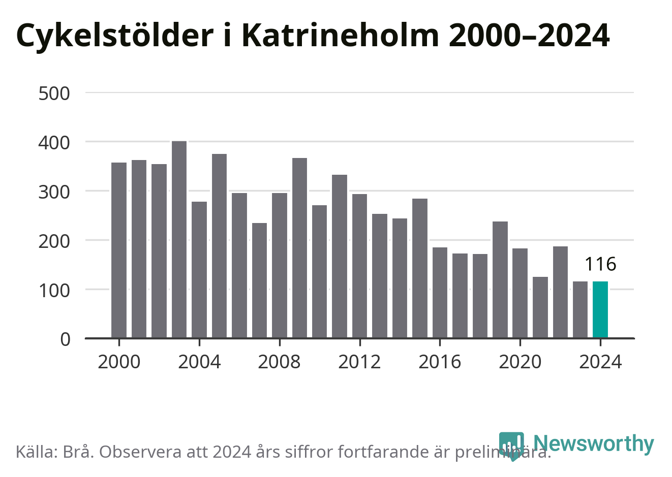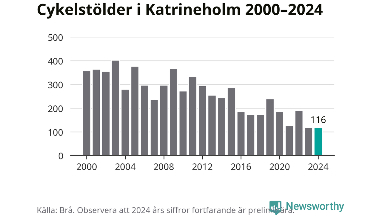 I Katrineholms kommun noterades det lägsta antalet cykelstölder under hela 2000-talet år 2024, även om det fortfarande är preliminära siffror. Under de senaste 25 åren har det som mest anmälts 400 cykelstölder på ett år (2003).