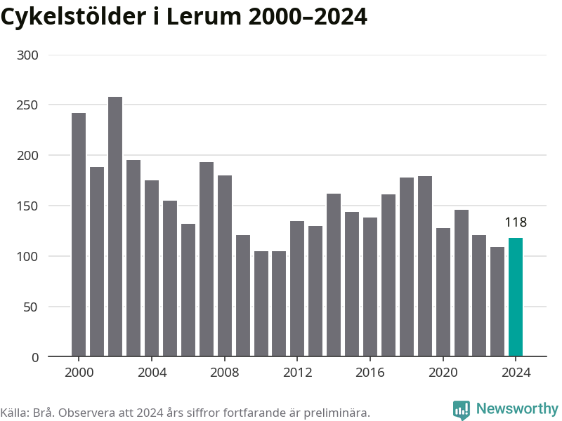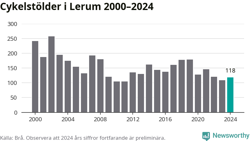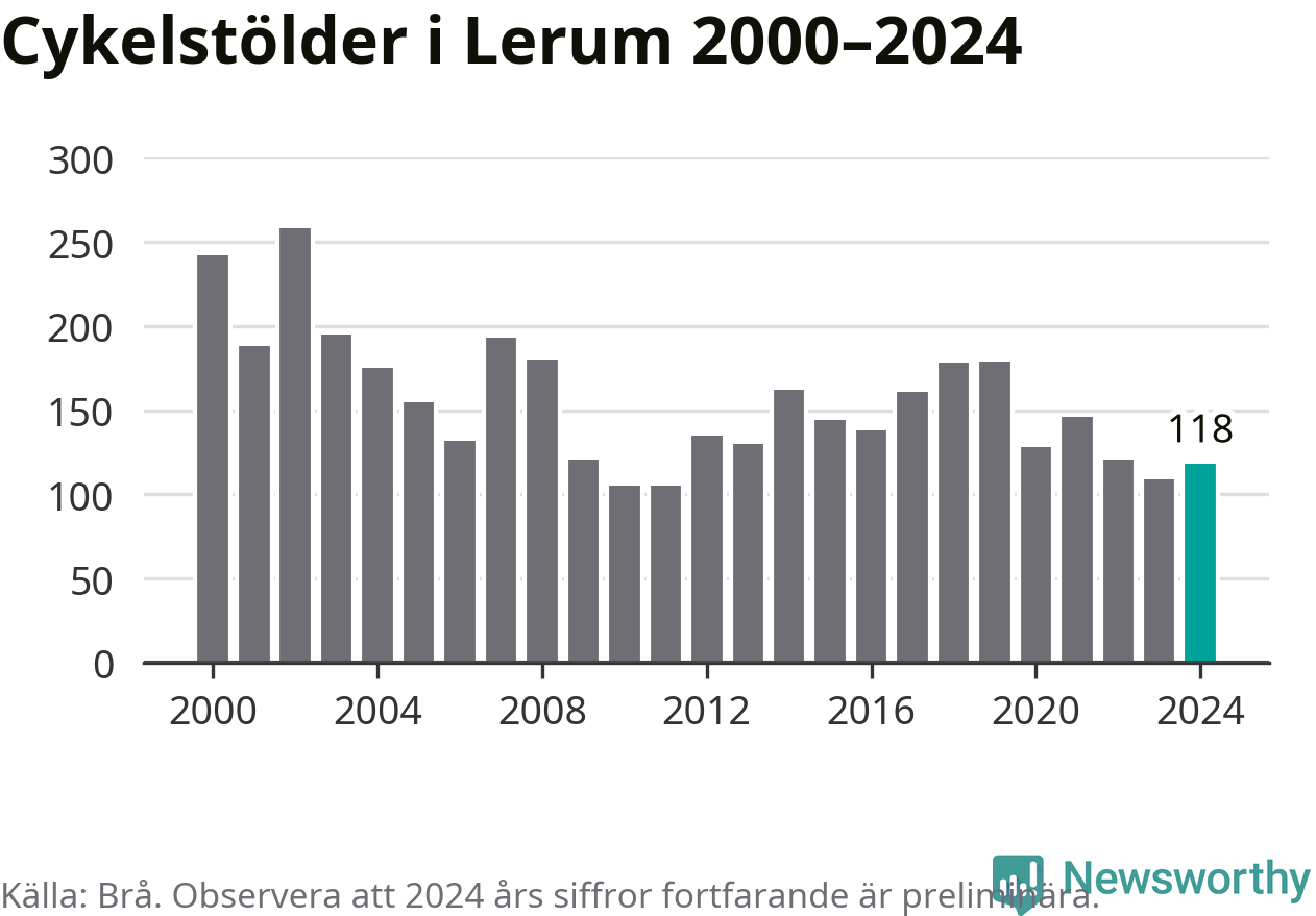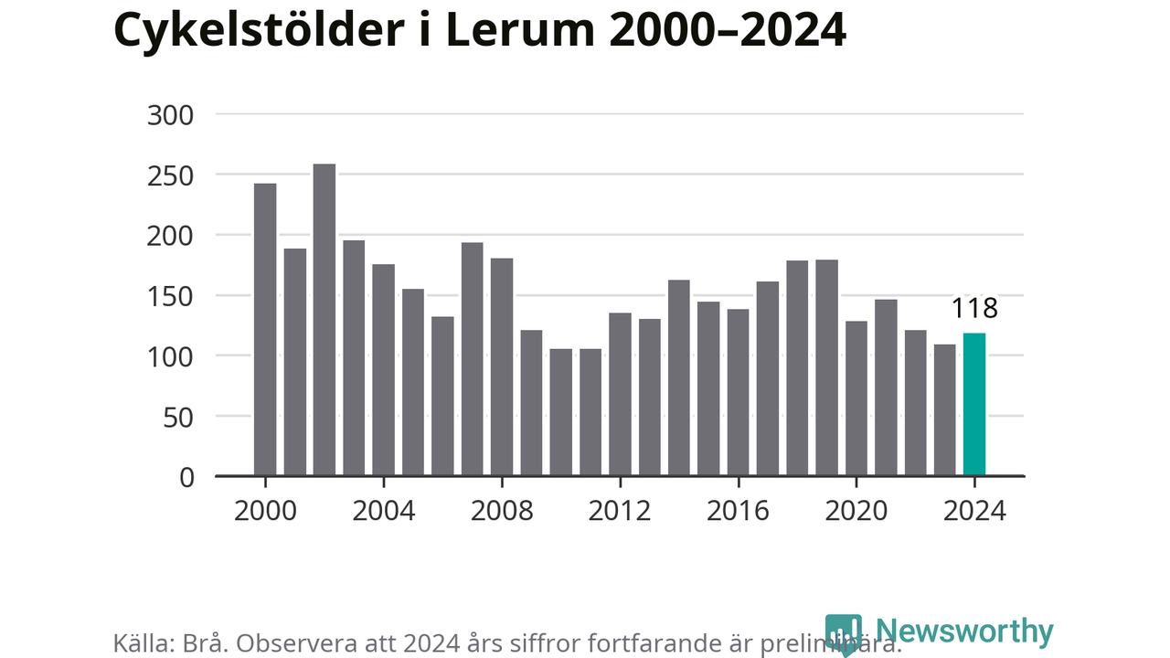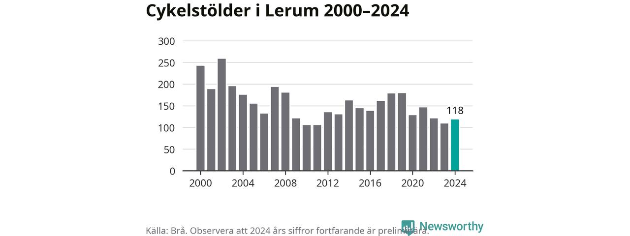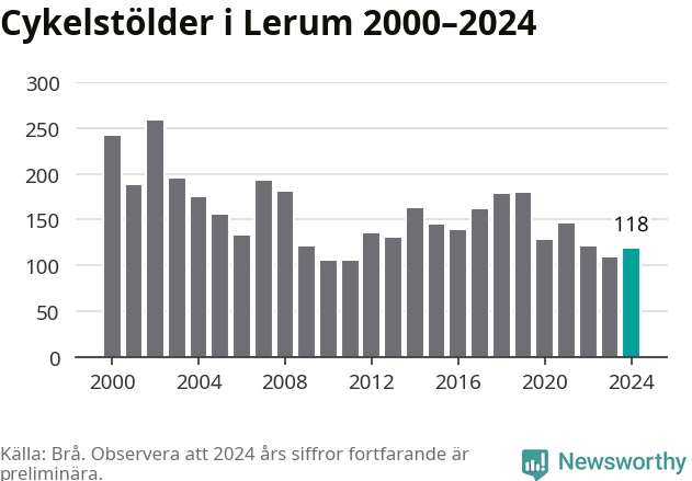 I Lerums kommun var antalet cykelstölder relativt få i en historisk kontext år 2024, även om det fortfarande är preliminära siffror. Under de senaste 25 åren har det som mest anmälts 258 cykelstölder på ett år (2002), som minst 105 stycken (2010 och 2011).