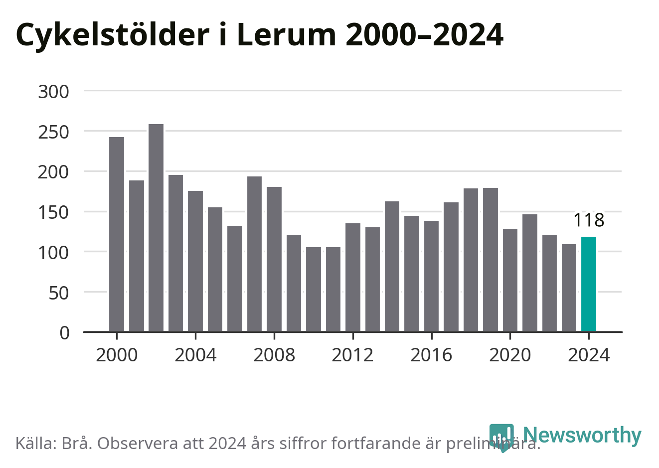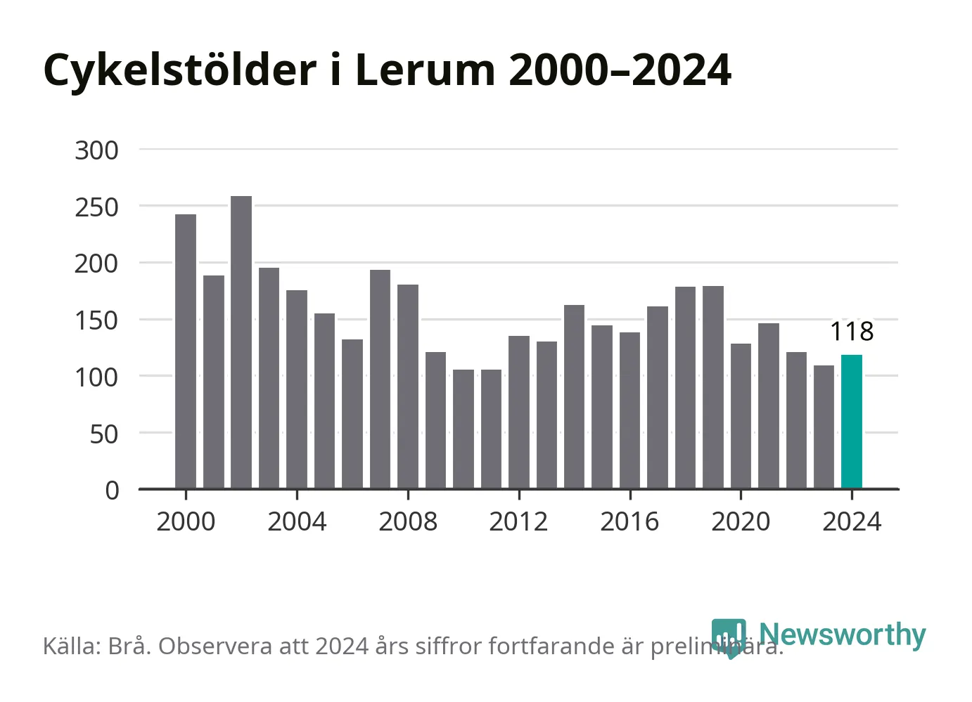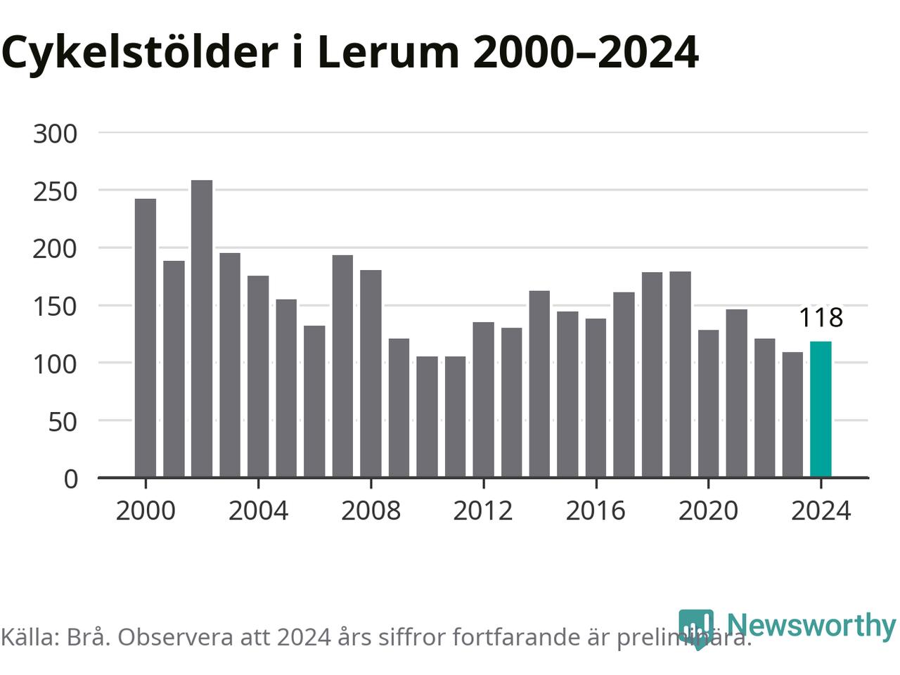 I Lerums kommun var antalet cykelstölder relativt få i en historisk kontext år 2024, även om det fortfarande är preliminära siffror. Under de senaste 25 åren har det som mest anmälts 258 cykelstölder på ett år (2002), som minst 105 stycken (2010 och 2011).
