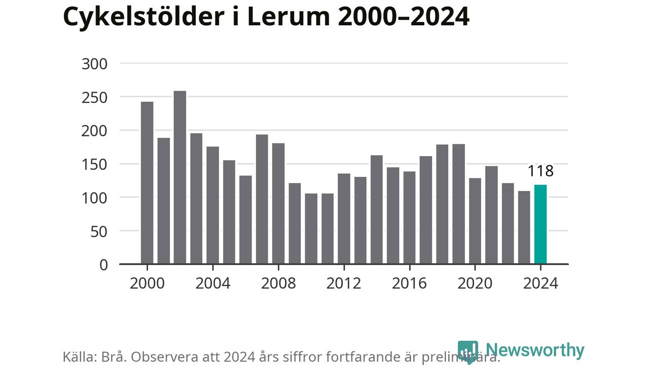 Lerum är inte särskilt drabbat. 2024 gjordes 118 anmälningar om cykelstölder i kommunen, enligt siffror från Brottsförebyggande rådet, vilket motsvarar 2,7 anmälningar per 1 000 invånare. Det kan jämföras med 7,4 cyklar per 1 000 invånare i Lidköping, som hade flest cykelstölder per invånare i Västra Götaland.