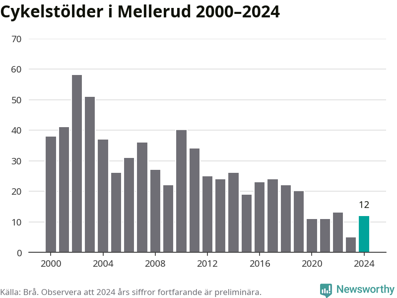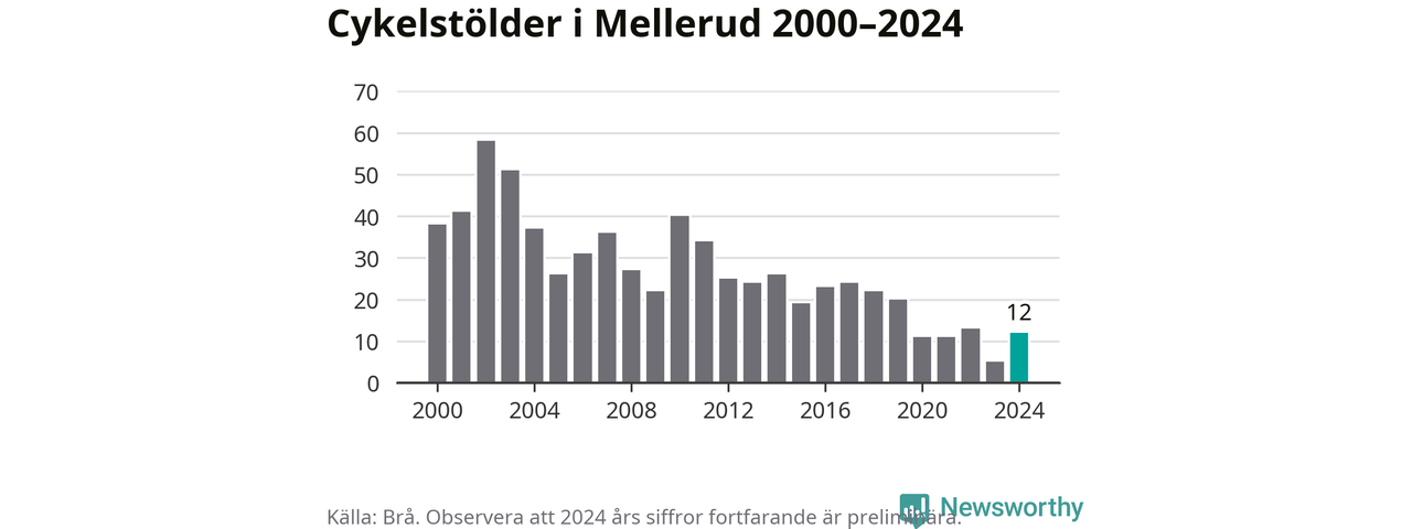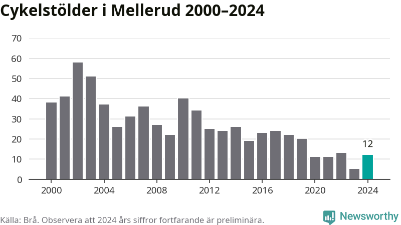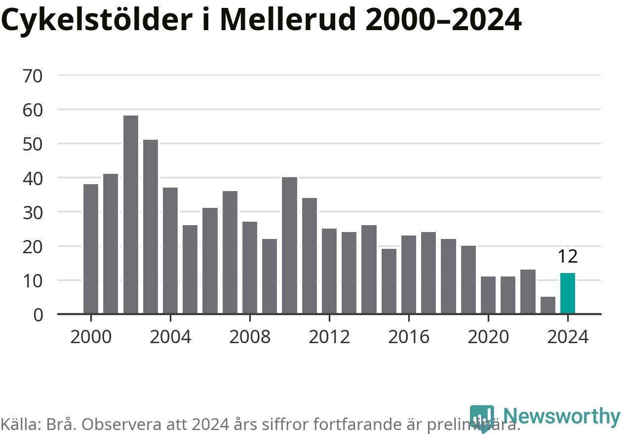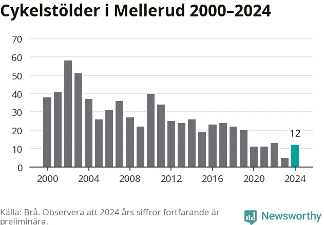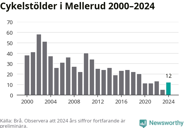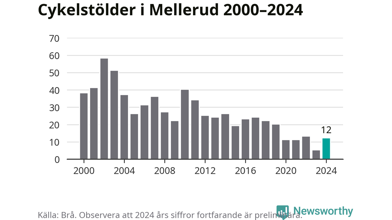 I Melleruds kommun var antalet cykelstölder relativt få i en historisk kontext år 2024, även om det fortfarande är preliminära siffror. Under de senaste 25 åren har det som mest anmälts 58 cykelstölder på ett år (2002), som minst 5 stycken (2023).